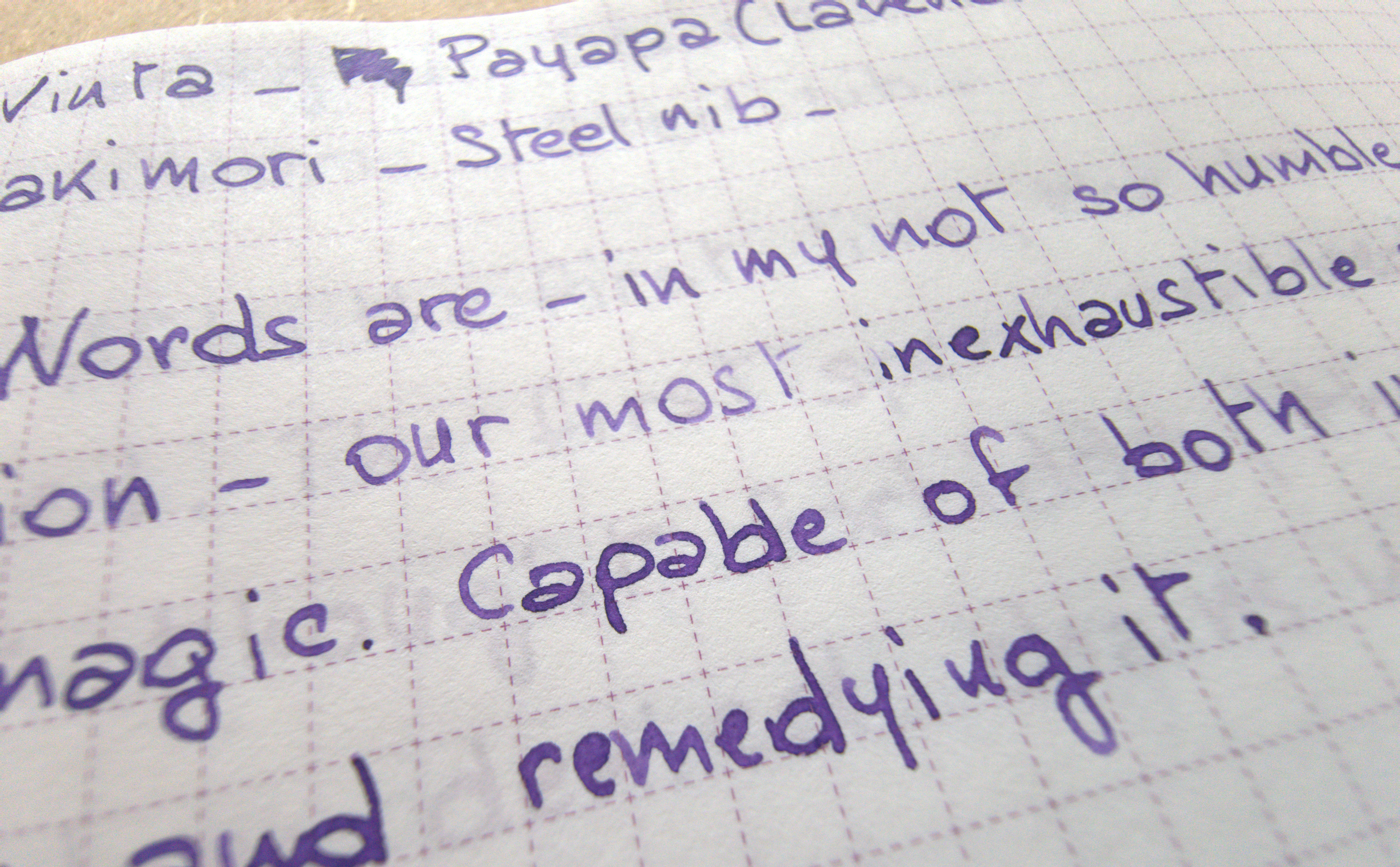 Payapa ha un flusso medio, nella norma, è ben leggibile con qualunque pennino e ha una vaga nota desaturata che lo rende molto gentile come colore. Lo trovo, personalmente, molto bello.