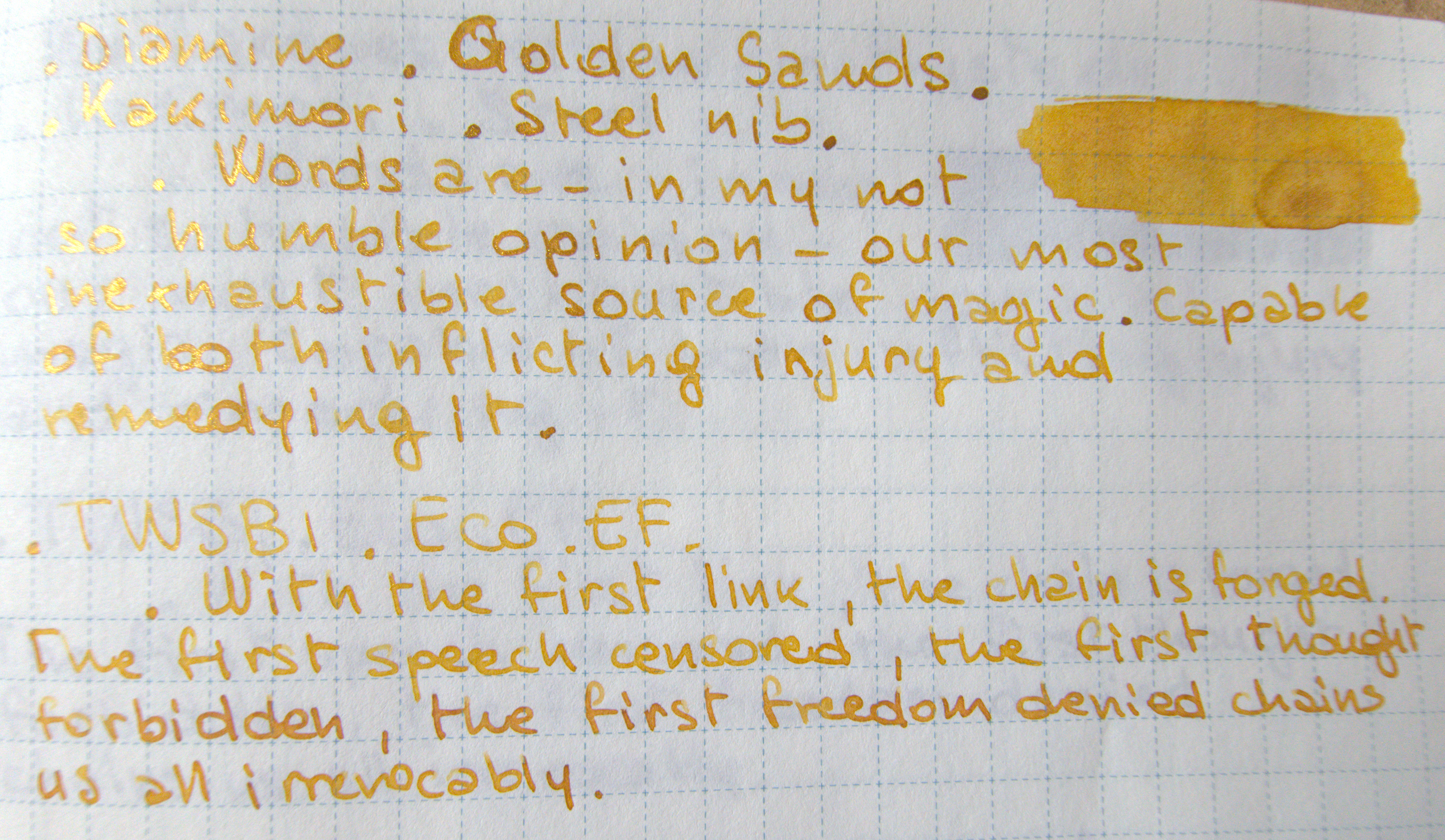 Il comportamento è tipico degli inchiostri Diamine: appena più secco, usuale negli inchiostri così chiari - i gialli in particolare, ma non in modo drammatico. E' affidabile come la gran parte dei Diamine che mi è capitato di provare. E' leggibile, non è tanto chiaro da scomparire sulla pagina. Il glitter è molto standard, pesante, di quelli che necessitano ottimi feeder e di agitare la penna ogni 3 o 4 parole.