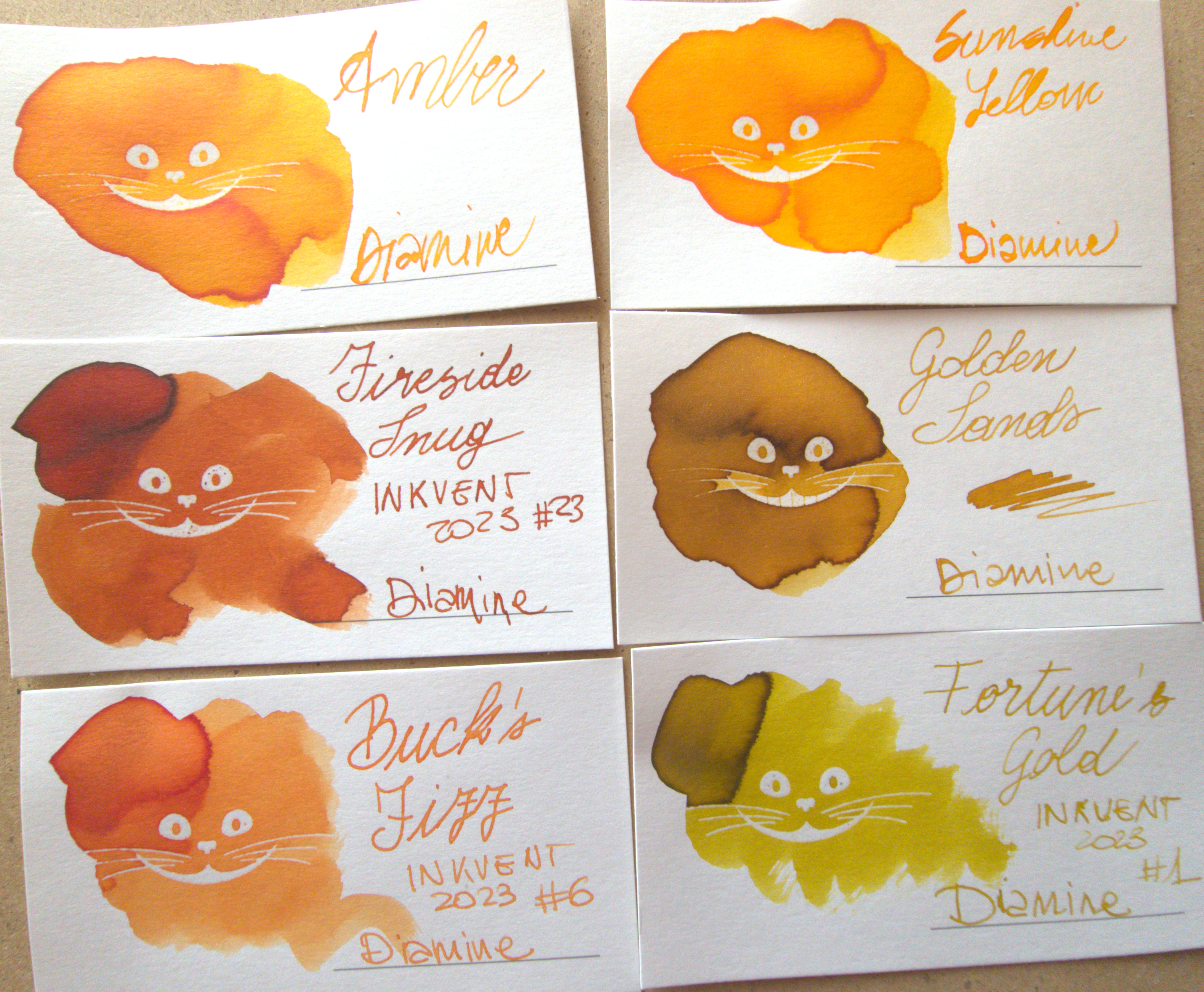Non ho assolutamente nulla di paragonabile ma ho ritenuto che potesse interessare un confronto con dei gialli molto noti, come Amber e Sunshine Yellow. Gli altri in mio possesso, come si può notare, sono arrivati con l'Inkvent del 2023 ma non condividono somiglianze con questo.