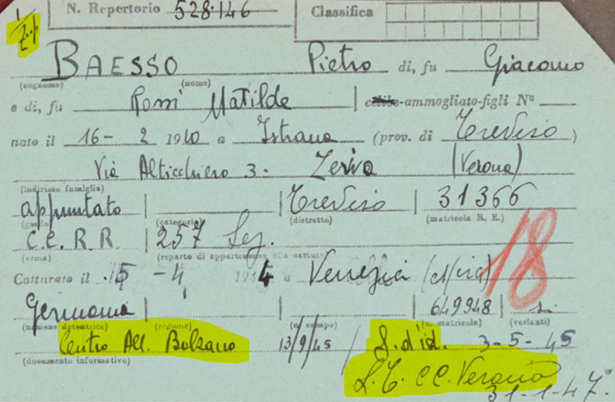 L'unico contributo che posso dare è che so che gli alleati avevano costituito un centro di raccolta a Bolzano per i militari ex-internati in Germania, quindi probabilmente è a quello che si riferisce la dicitura "Centro All. Bolzano".