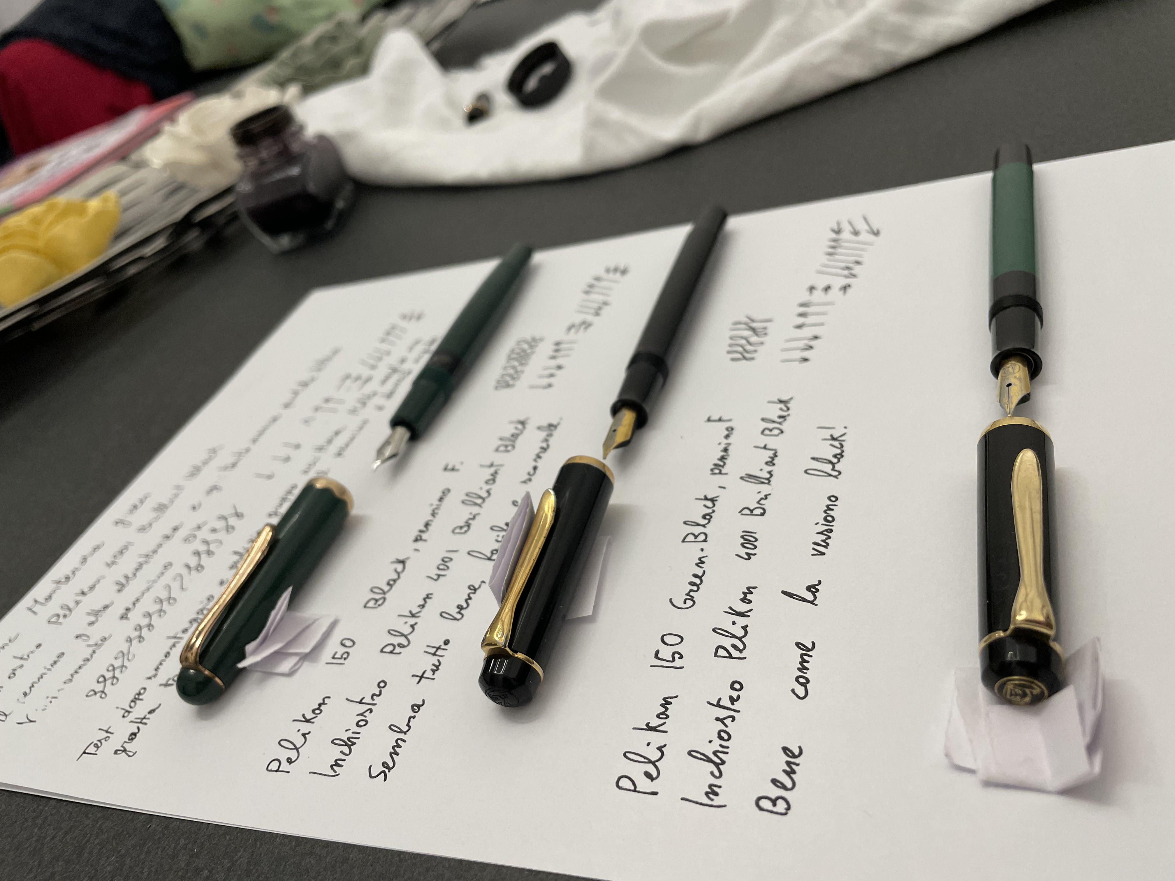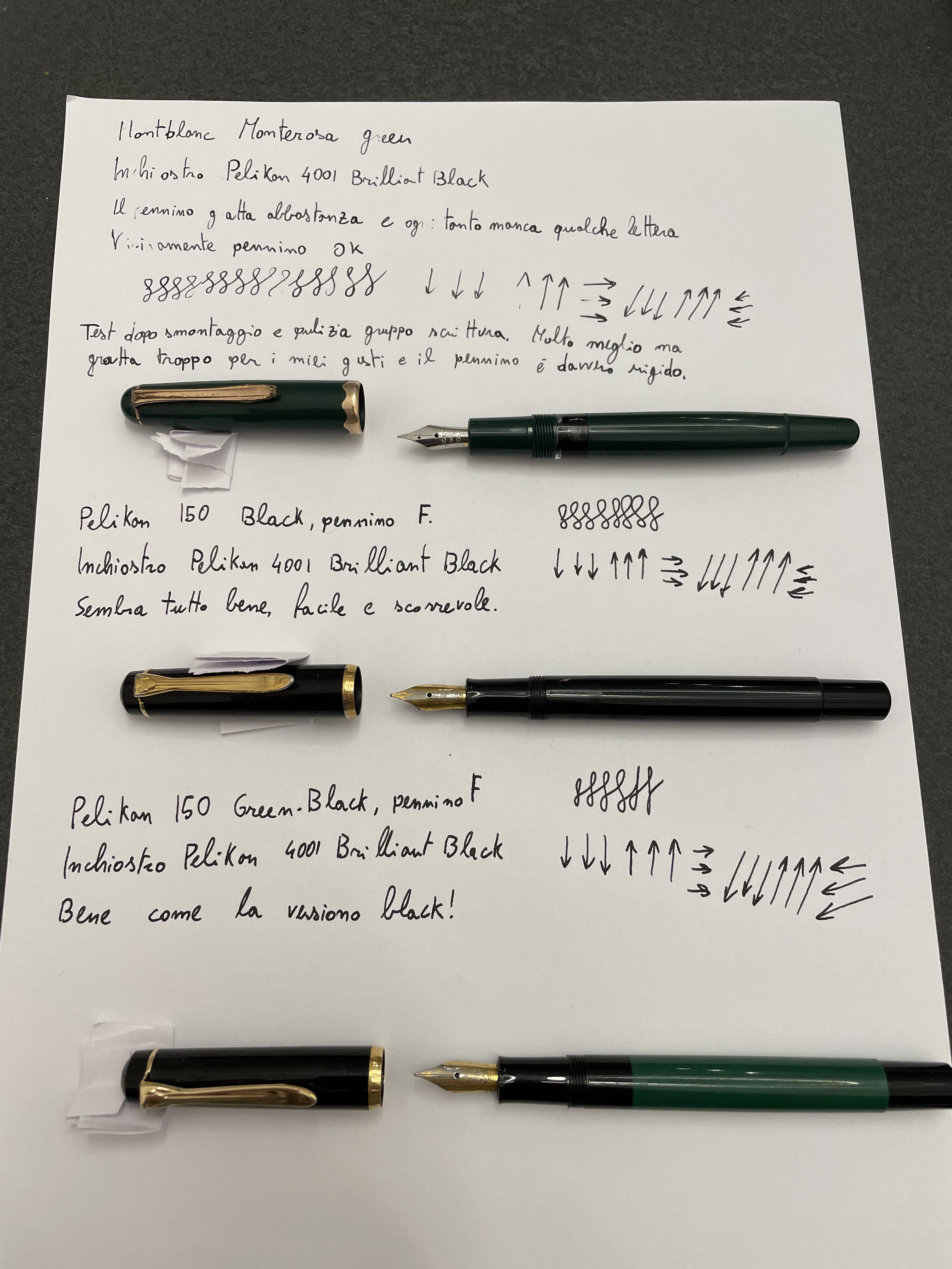 Chi vince a mani bassi oggi però è una coppia di penne prese online: si tratta (Credo ,le abbiamo identificate qui sul forum) di due Pelikan 150 (trovate a prezzo stracciato apparentemente da un signore che poco se ne intendeva, alla faccia dei mercatini) una versione classica Black-green (che non mi è mai piaciuta, mi sa da plasticaccia anche se non è così) e una bellissima versione nera, molto più elegante.