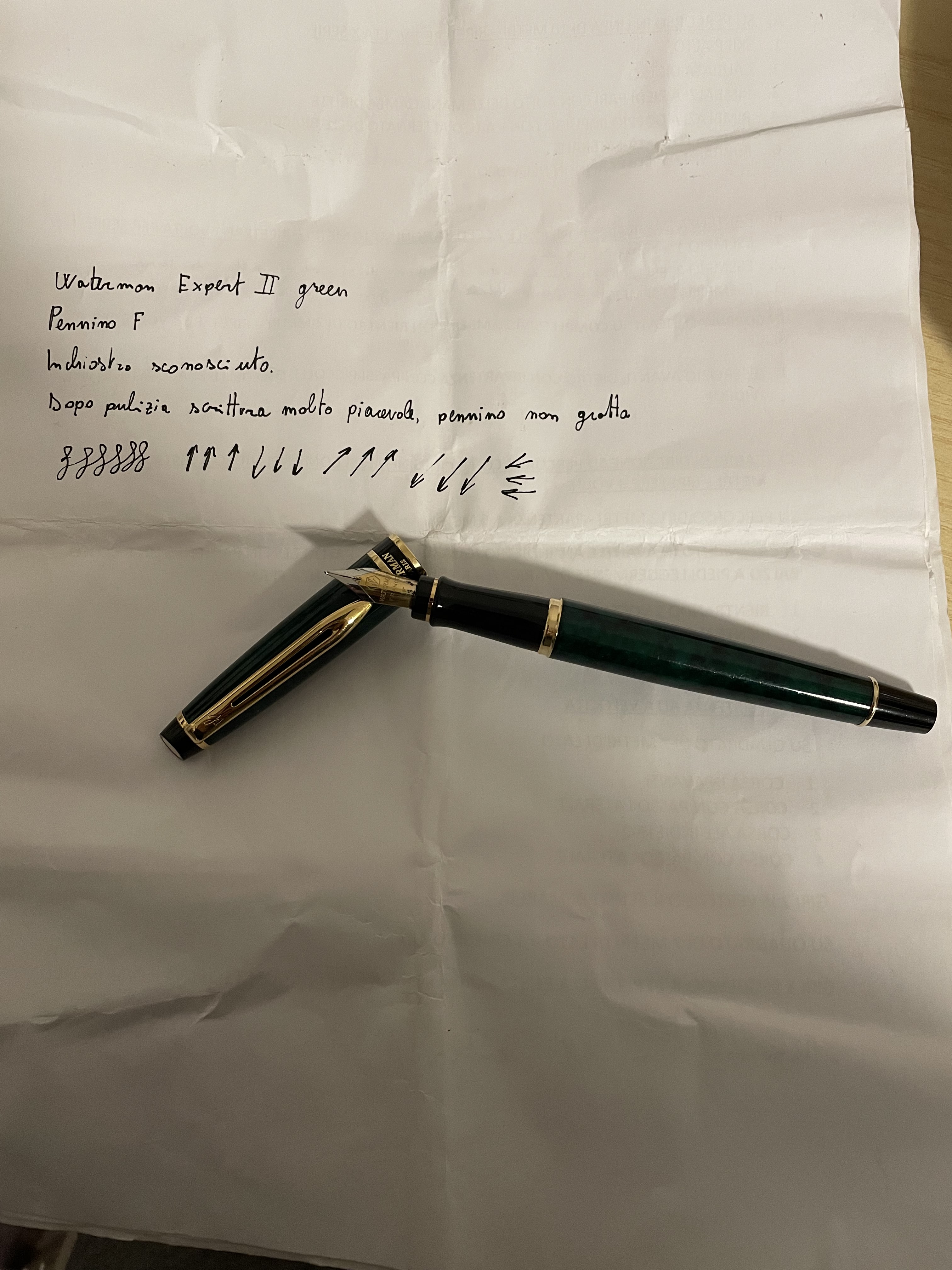 Il secondo ospite di stasera è una Waterman Expert II Verde. Anche qui la sua cugina(una MK1) è una Black, ereditata da mio padre (vivo e vegeto ma ha preferito dare le sue penne a chi ha più passione tra i due) che purtroppo però ha il difetto di non chiudere bene il cappuccio dandomi sempre una nota di fastidio. Oltre a questo, la scrittura non è eccezionale. Anche lei in esposizione.