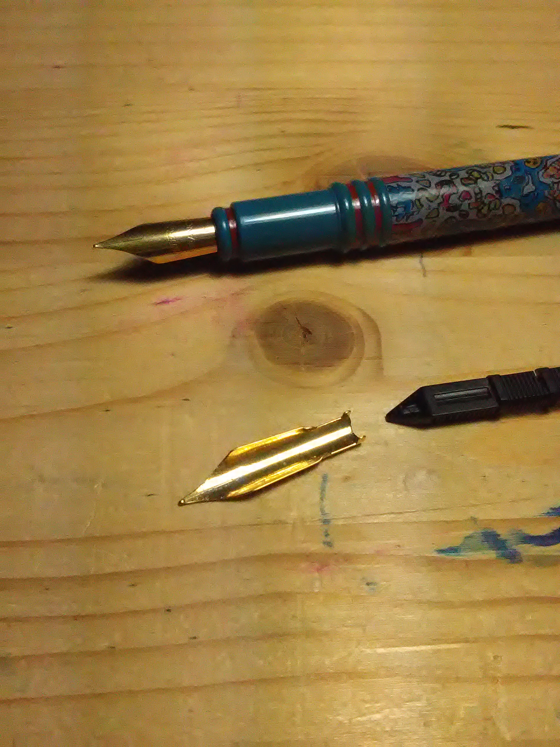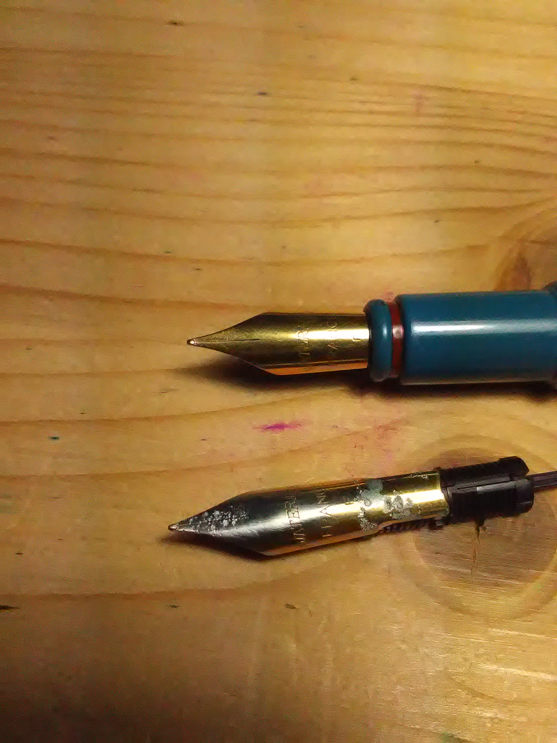 Procediamo quindi a smontare il corpo alimentatore per una bella pulizia, visto che sembrava averne bisogno. Qualcuno ha detto Excalibur? Ho davvero fatto una fatica del diavolo a estrarre il corpo, alla fine quello che ho avuto davanti era un pennino abbastanza pulito (avevo fatto un ciclo in "lavatrice" prima) ma con quella corrosione che anche la MK1 presenta. Difetto delle Expert? MAh. LA scrittura comunque è piacevole, il tratto troppo fine per i miei gusti. Oltre al fatto che non mi entusiasma l'estetica verde marmorizzato e la penna è un po' troppo grande per i miei gusti. LA utilizzerò fino a fine carica.