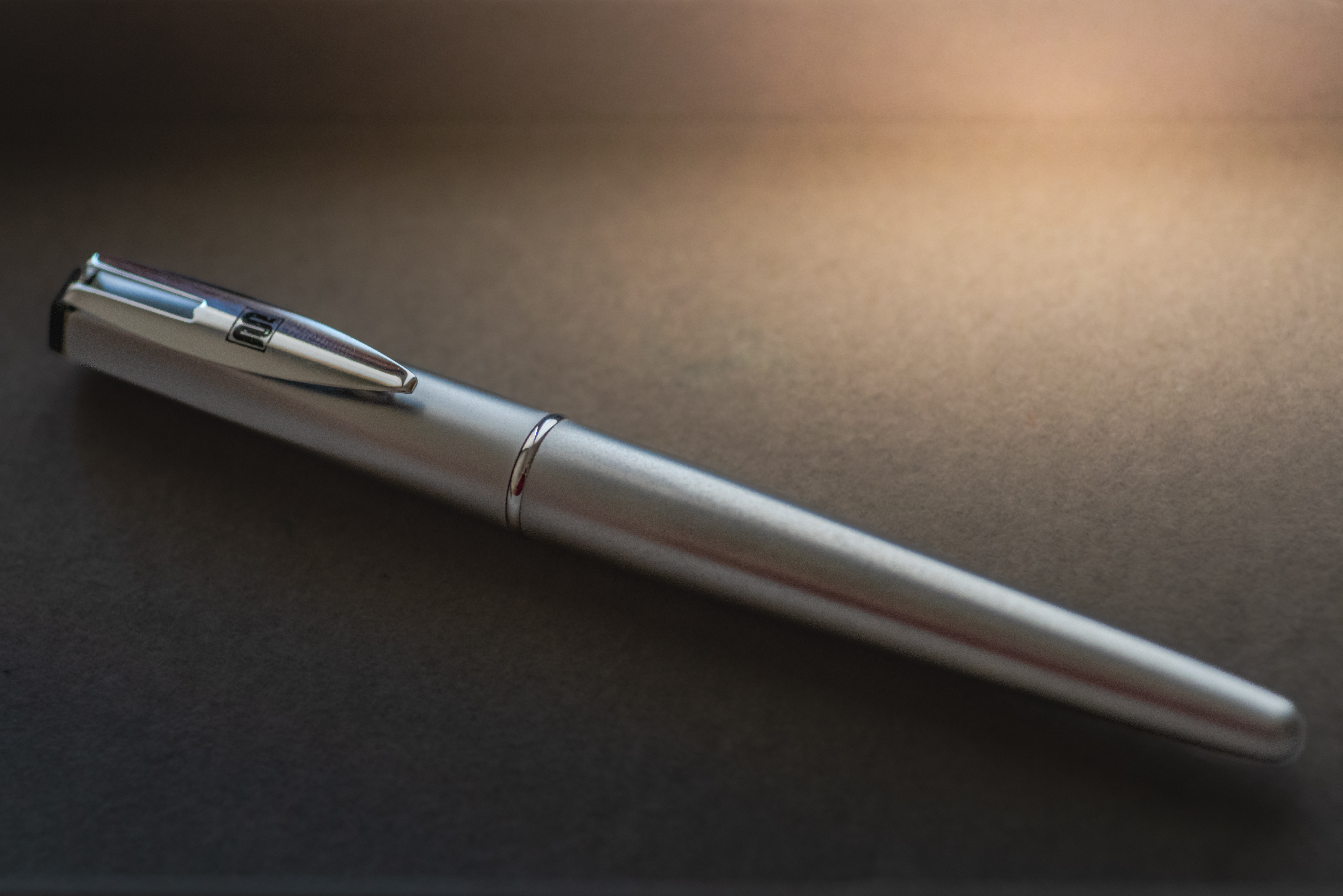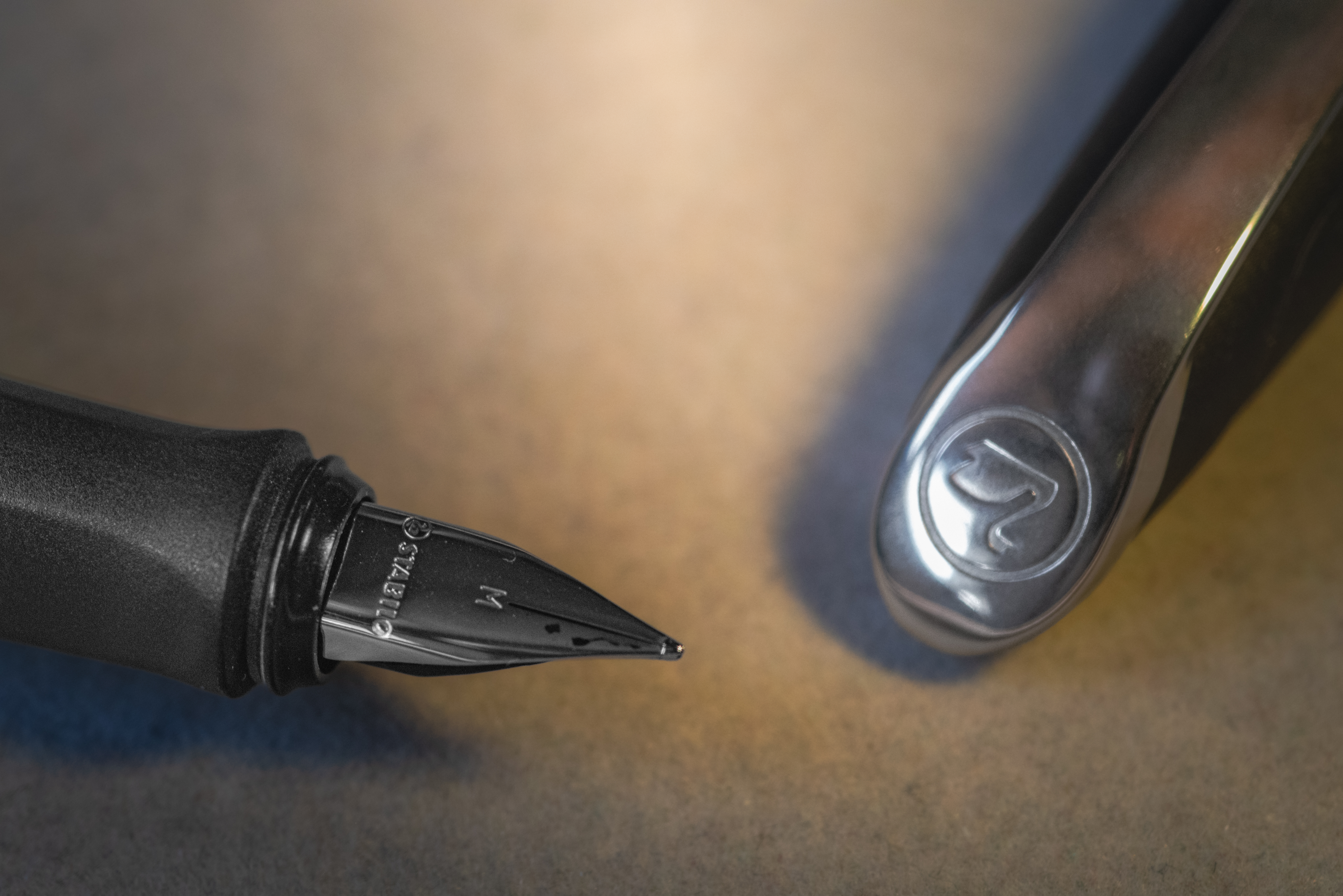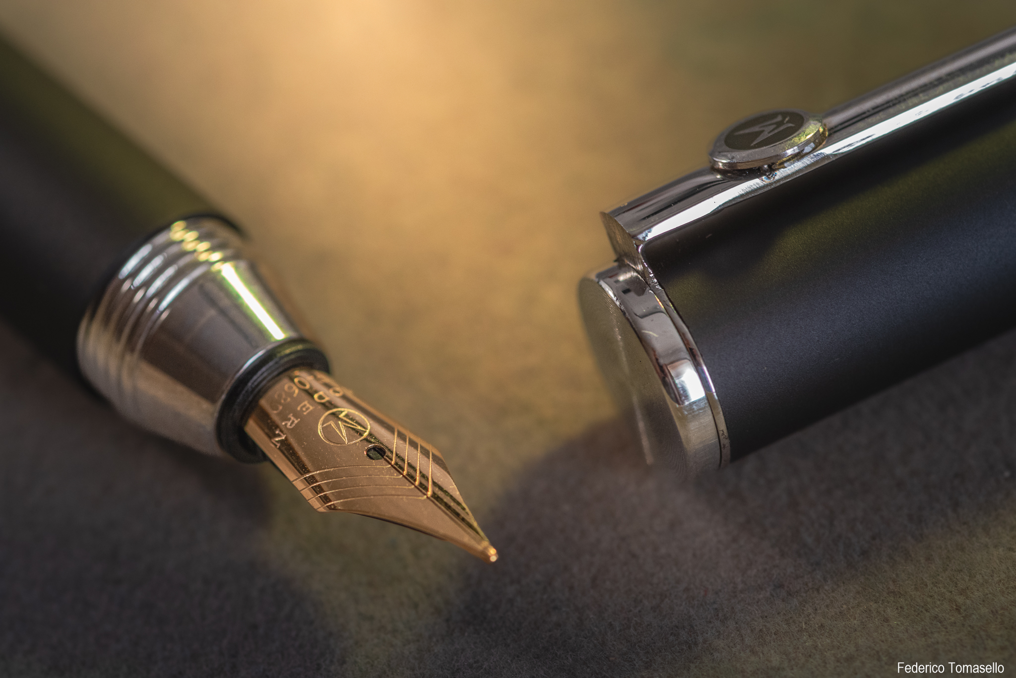 La penna ha una bella finitura metallica color grafite e un pennino molto funzionale (anche se temo un po' disallineato, nel mio caso), che scorre più che decentemente e che si gestisce con estrema naturalezza, a scapito di un po' di precisione.