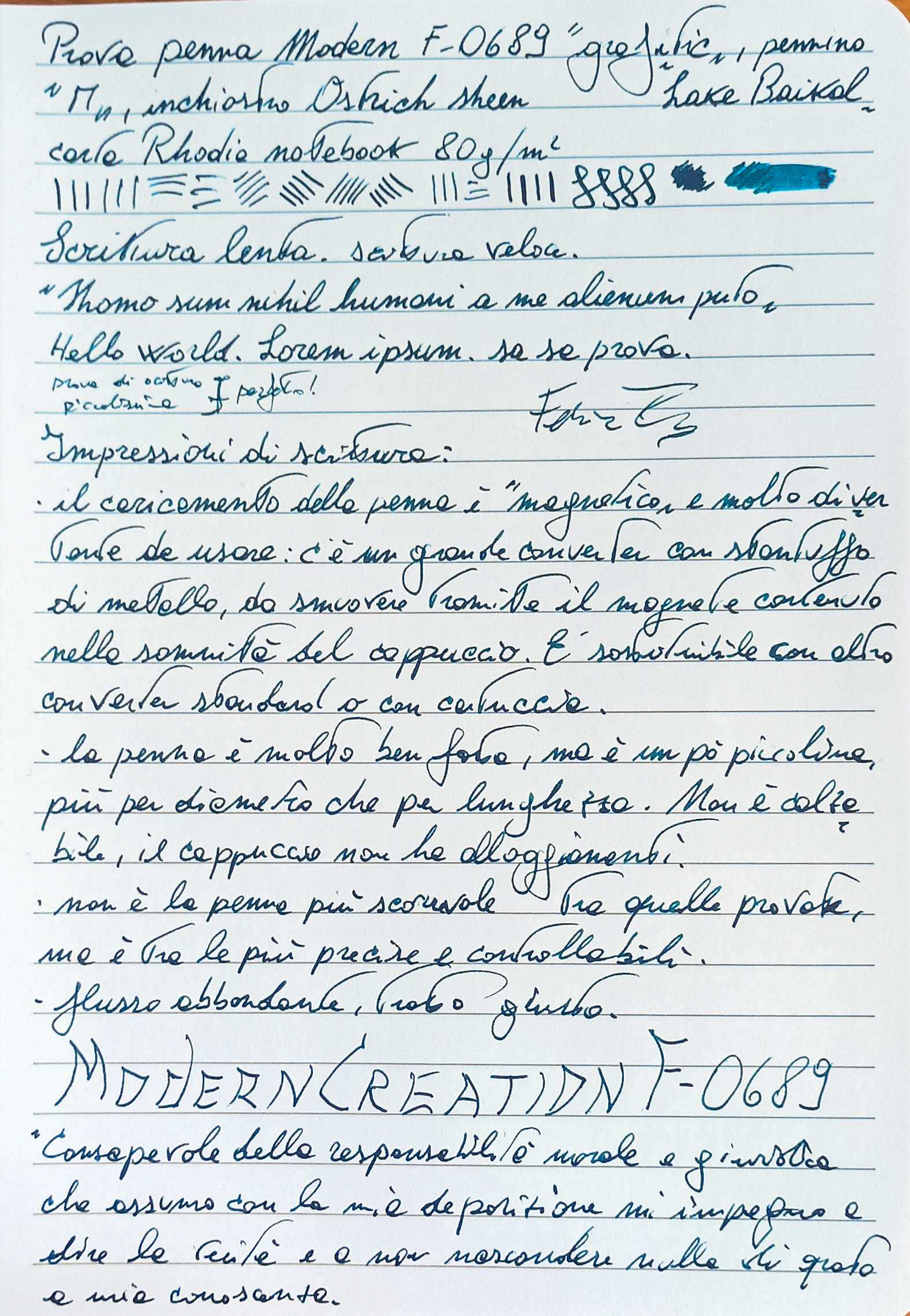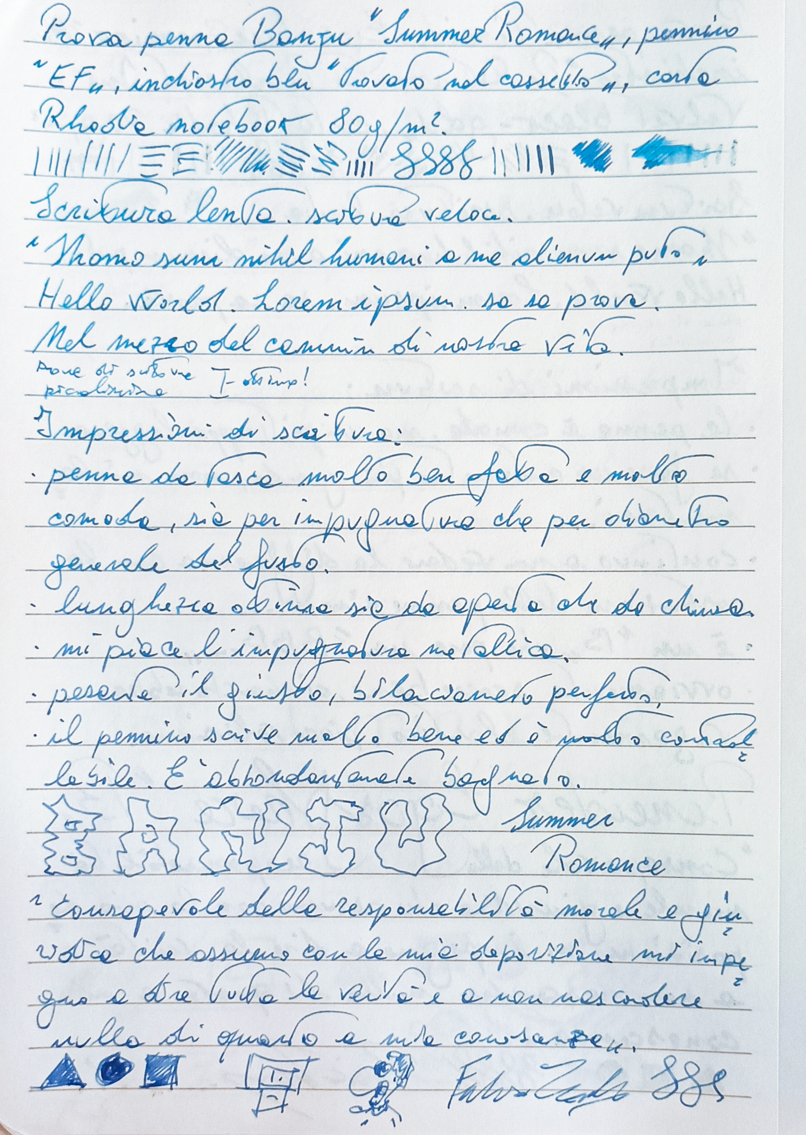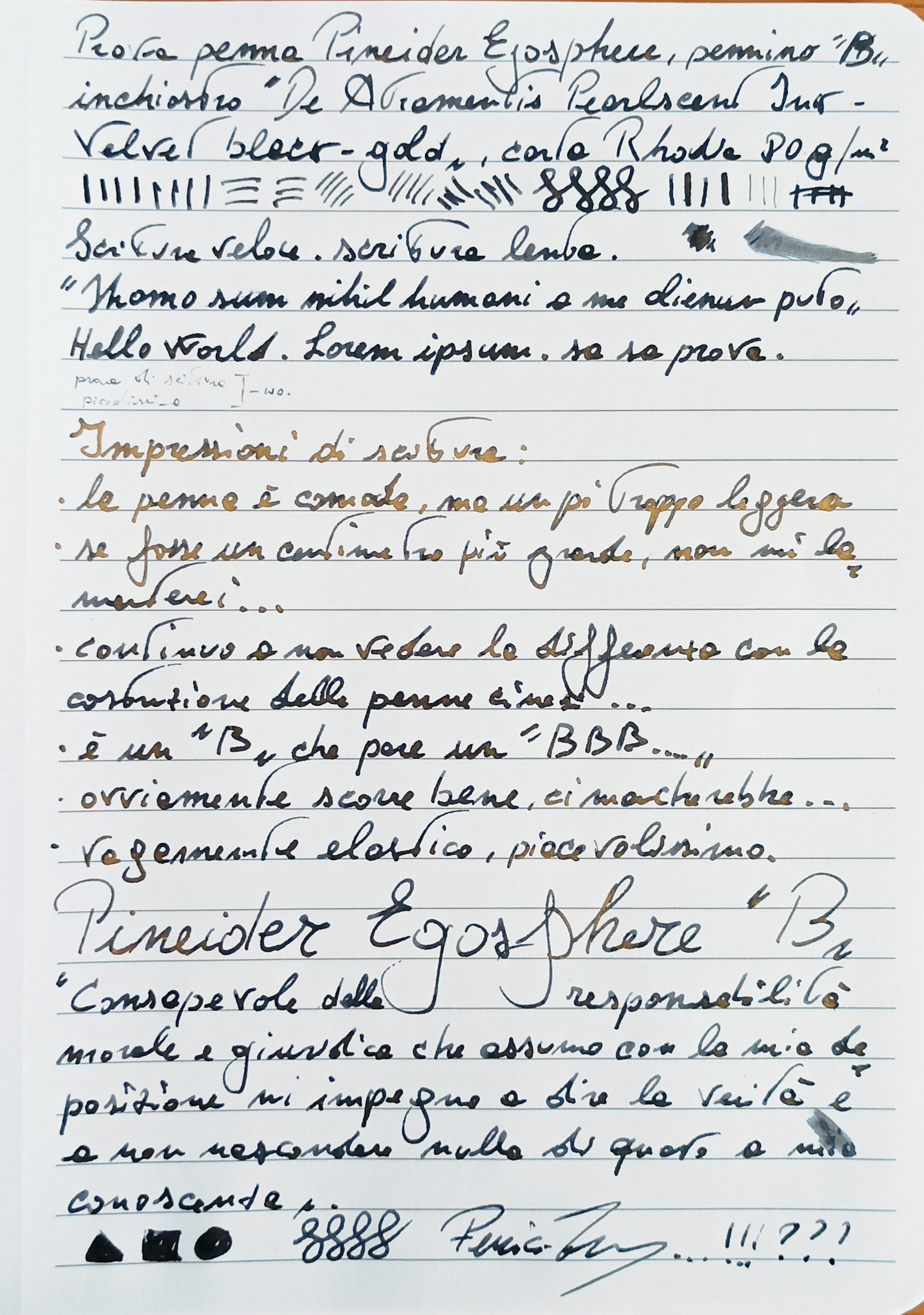 Di buono c'è il pennino, che funziona bene (anche se ha un sottile, quasi inavertibile, ma costante attrito "grattoso") e che, nonostante il tratto "M" bello bagnato e ampio, è stranamente sia controllabile che naturale. Insomma, ci si scrive bene.