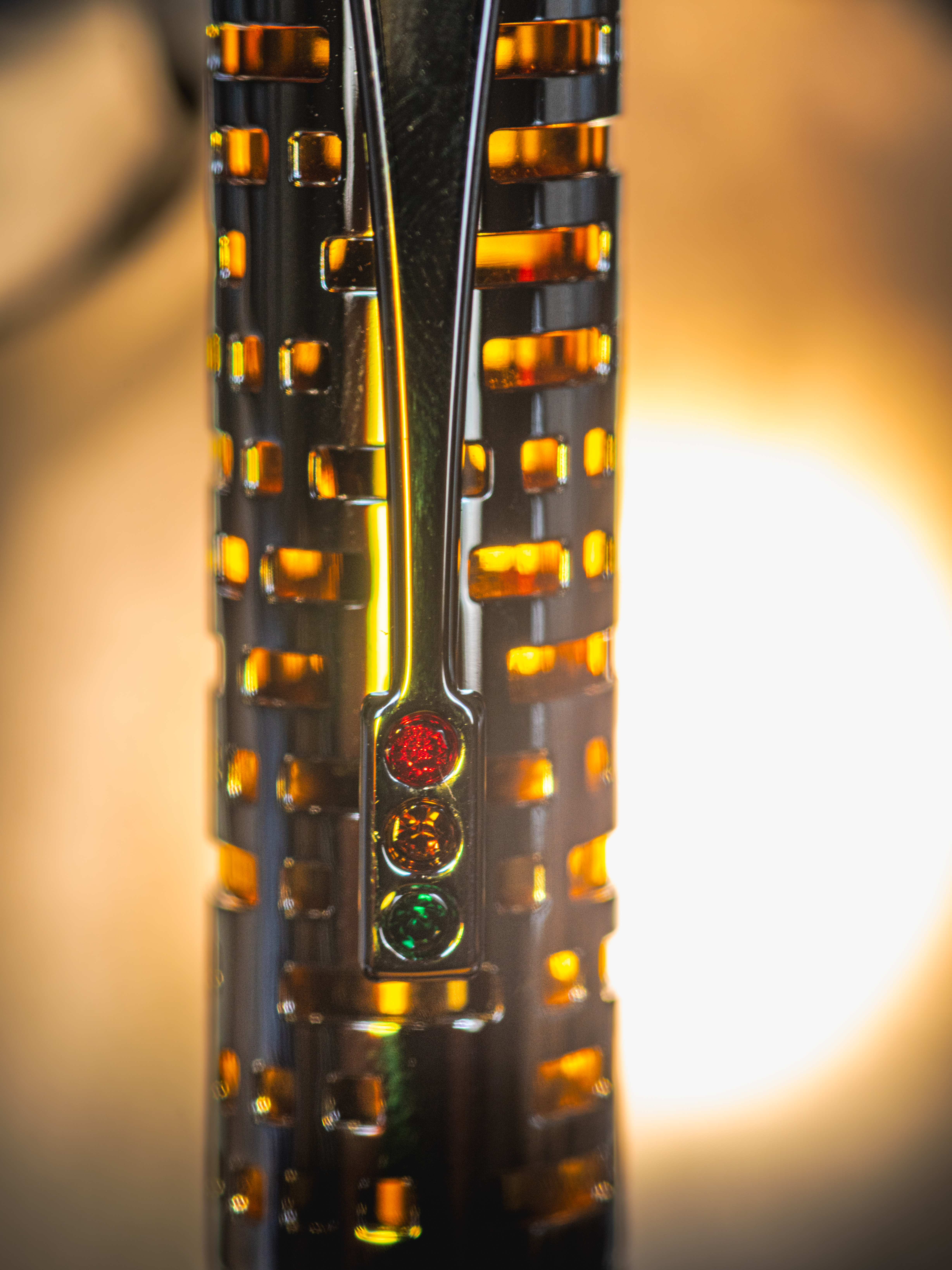 Ah: la decorazione del fusto richiama una strada con la segnaletica urbana, il cappuccio richiama le finestre dei palazzi di una grande città ed il fermaglio ha la forma di un semaforo. È kitsch? Probabilmente sì, ma io la amo