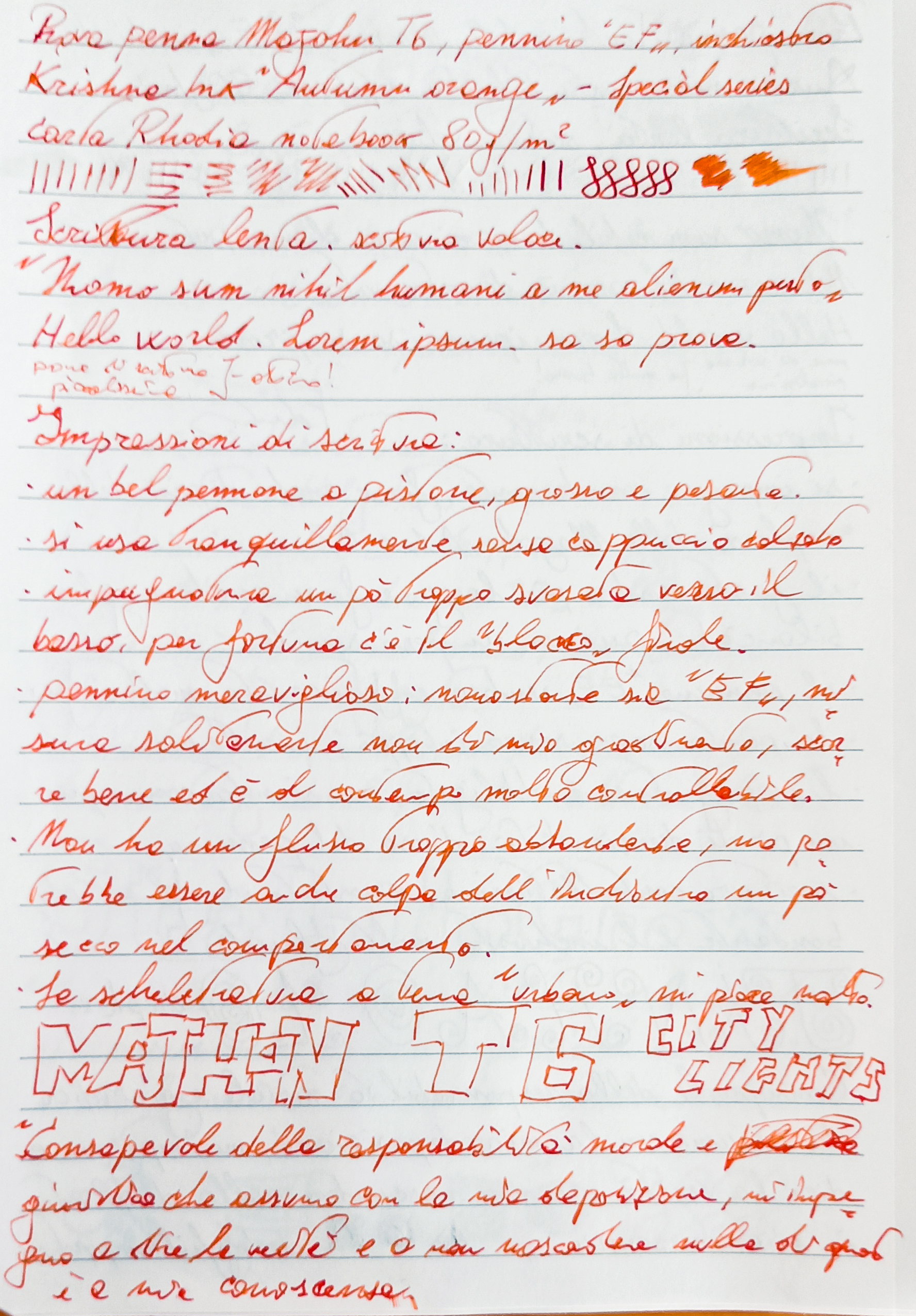 Il pennino, che non ho su nessun'altra delle mie Majohn, deve essere di nuova produzione: per me è eccezionale, nessun altro di tutti quelli provati finora è così controllabile e preciso, non sbaglio un segno. È anche vagamente elastico ed espressivo e mi ha riavvicinato agli (non troppo amati) EF.