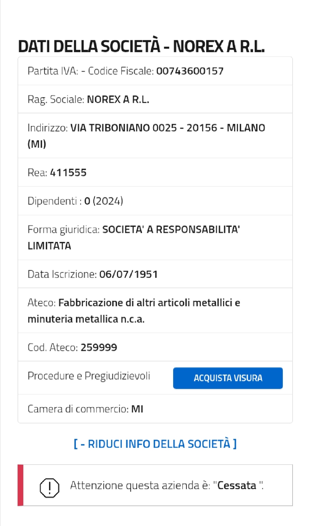 Inserendo la stringa di ricerca "camerale Norex Milano" ci sono i link ai vari siti che vendono le visure dettagliate, ed è possibile vedere l'estratto dei dati di base.