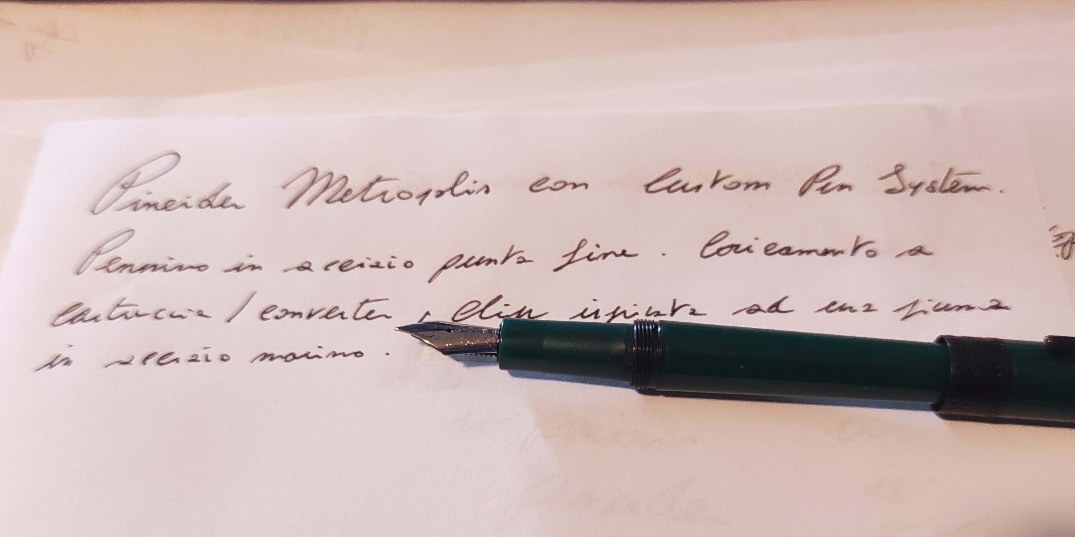 vi presento una penna che mi piace molto, la quale però mi ha fatto un pochino ammattire agli inizi (quasi non scriveva) e poi d'un tratto...luce fu! La Metropolis in "Ultraresin UR Pearl" colore verde è sicuramente d'impatto.