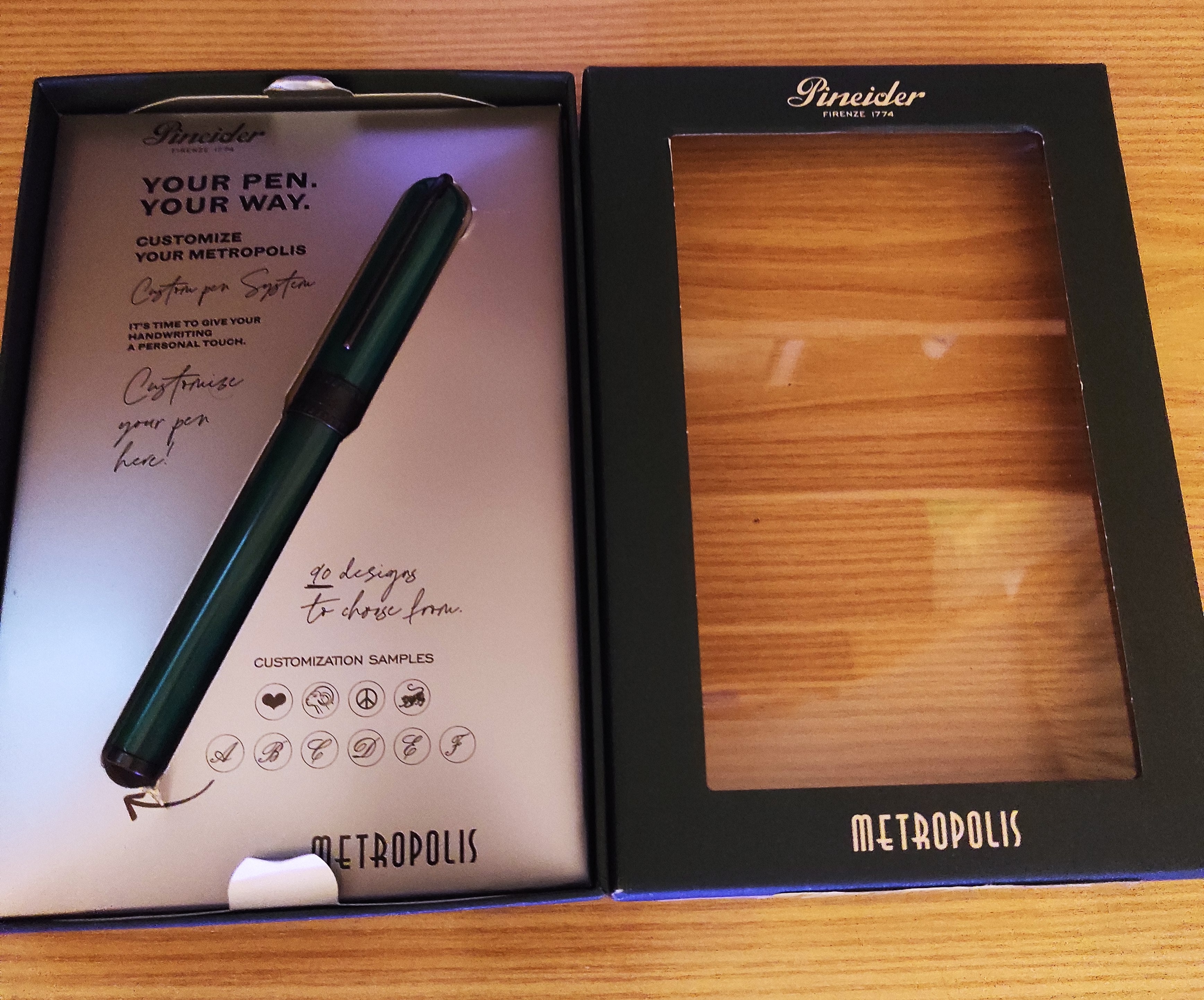 Questo modello ha il Custom Pen System che permette di rendere la propria penna unica grazie all'inserimento di monogrammi, simboli o disegni sul fondello...immagino che tale sistema conoscendomi non lo userò mai. La clip ha il disegno della piuma, chiusura a vite, pennino fine Crest n.5 in acciaio, veretta con la scritta Pineider e quella del mitico film Metropolis, riempimento a cartuccia, il converter non è incluso.