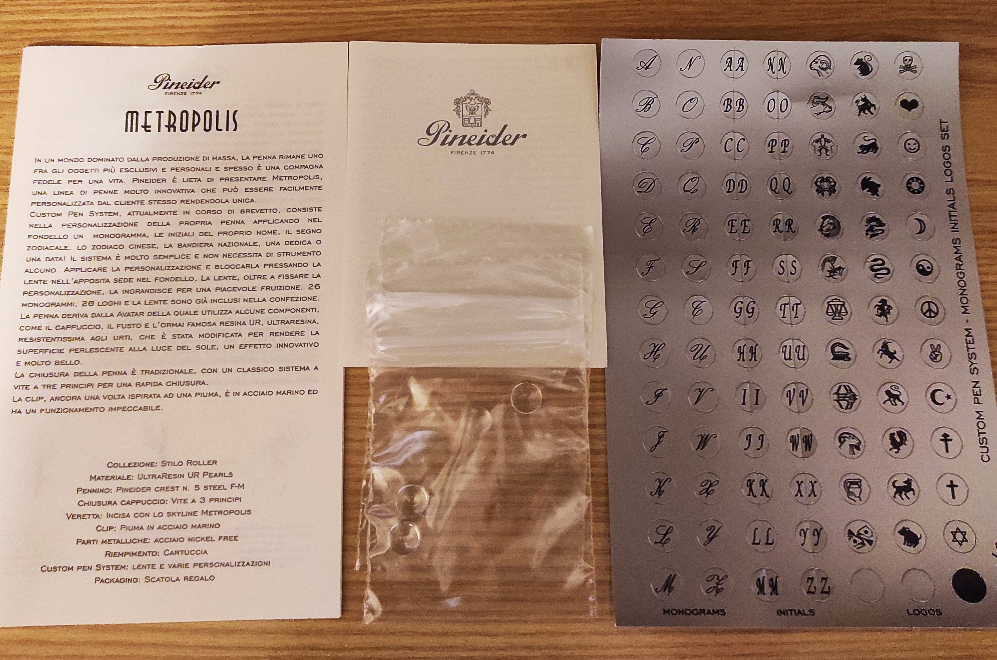 Aggiungo anche foto dei vari documenti, loghi, monogrammi e lenti trasparenti disponibili nella confezione.