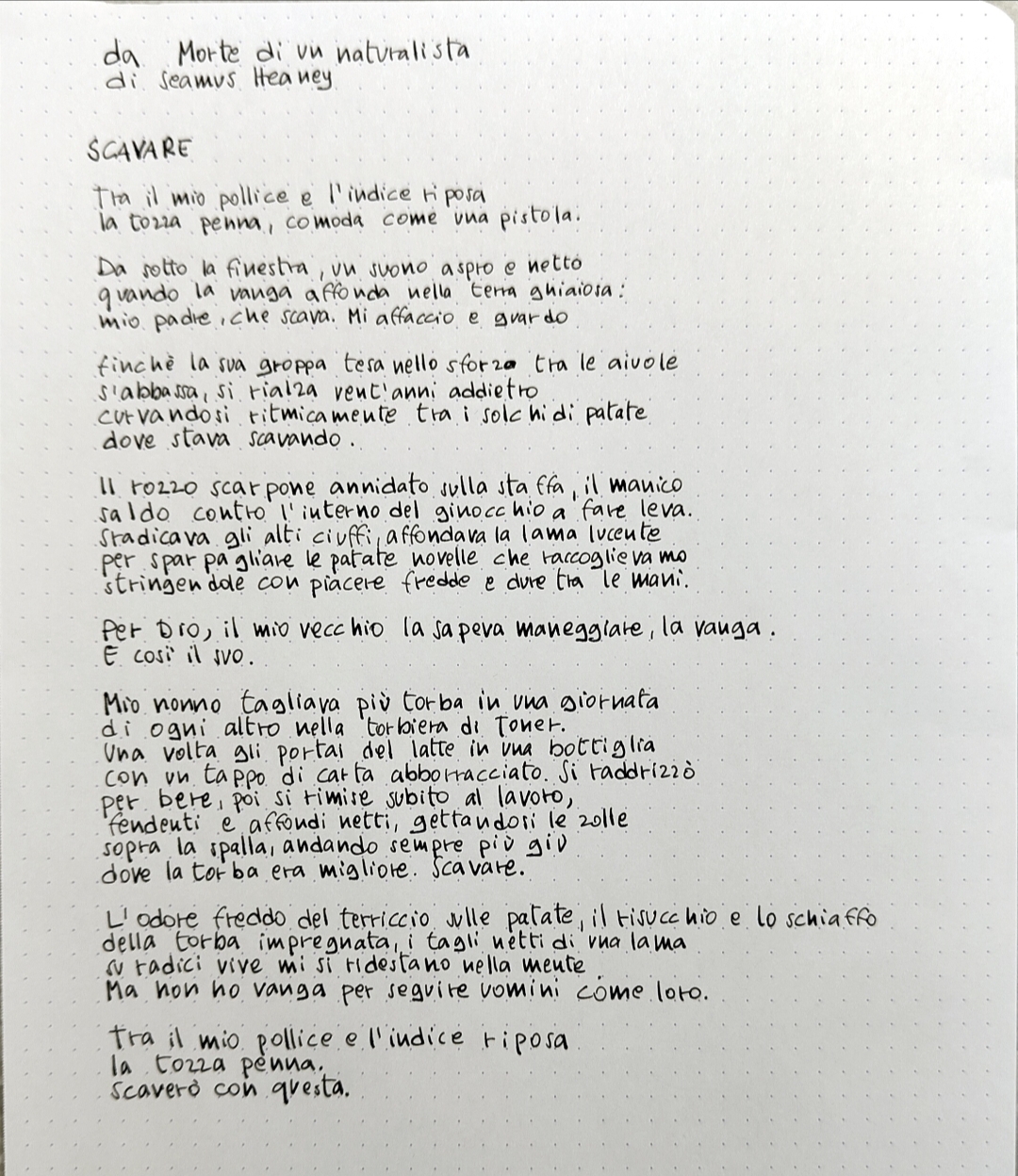 Il risultato in termini di scrittura è eccezionale. Il pennino inizialmente era un F elastico burrosissimo ma, in questo ultimo anno, ho scoperto l' F d'acciaio che Leonardo prende da JOWo e mi è partita la fissa, per cui ho smontato un gruppo scrittura che avevo e l'ho montato io, dopo essermi martoriata le dita per modellare l'ebanite e il pennino in modo che non si aprissero i rebbi. Ora sono meravigliosamente serrati. Ho poi preso della carta con della grammatura molto pesante e' ho premuto. Non ho tirato una linea, ho applicato pressione a penna ferma per compensare i rebbi molto chiusi. Ho ottenuto così un tratto di partenza più generoso rispetto a come era per me il pennino appena montato e un leggero molleggio, conseguenza dell'avere stressato l' iridio. In fase di scrittura il risultato ottenuto mi piace moltissimo perché il pennino è diventato sensibile alla pressione e grazie alla qualità dell'alimentatore in ebanite, il flusso rende i tratti calcati molto carichi. La poesia "Scavare" di Seamus Heaney è scritta con il Polar Black di Noodler's: allargando l'immagine si vede bene la variazione di tratto, non certo da flessibile ma molto interessante per un pennino d'acciaio. Quando ho visto la penna sul sito, il prezzo offerta e il colore mi avevano fatto pensare ad una penna leggerina e ad una plastica andante, sempre da barra piena ma mi aspettavo al tatto la sensazione delle penne con plastiche iniettate. Mi ero clamorosamente sbagliata: la resina è di qualità stratosferica sia nella parte bianca che in quella rosa e, dopo un anno di uso, è ancora lucida senza micro graffi né segni d'uso. Ha avuto il destino di essere stata sempre usata con inchiostri difficili, glitterati o con sheen e non ha mai visto un blu. Ad essere rimasta "macchiata" è la filettatura che non ho mai provato a pulire e la parte in fondo alla sezione dove c'è l' housing che ha un colore perennemente turchese perché, e questo il colore che ho destinato alla penna. La sezione è rimasta bianca e lucida, per cui ritengo che se volessi potrei pulire anche il resto, non lo faccio perché non intendo riporla e mi piace così.