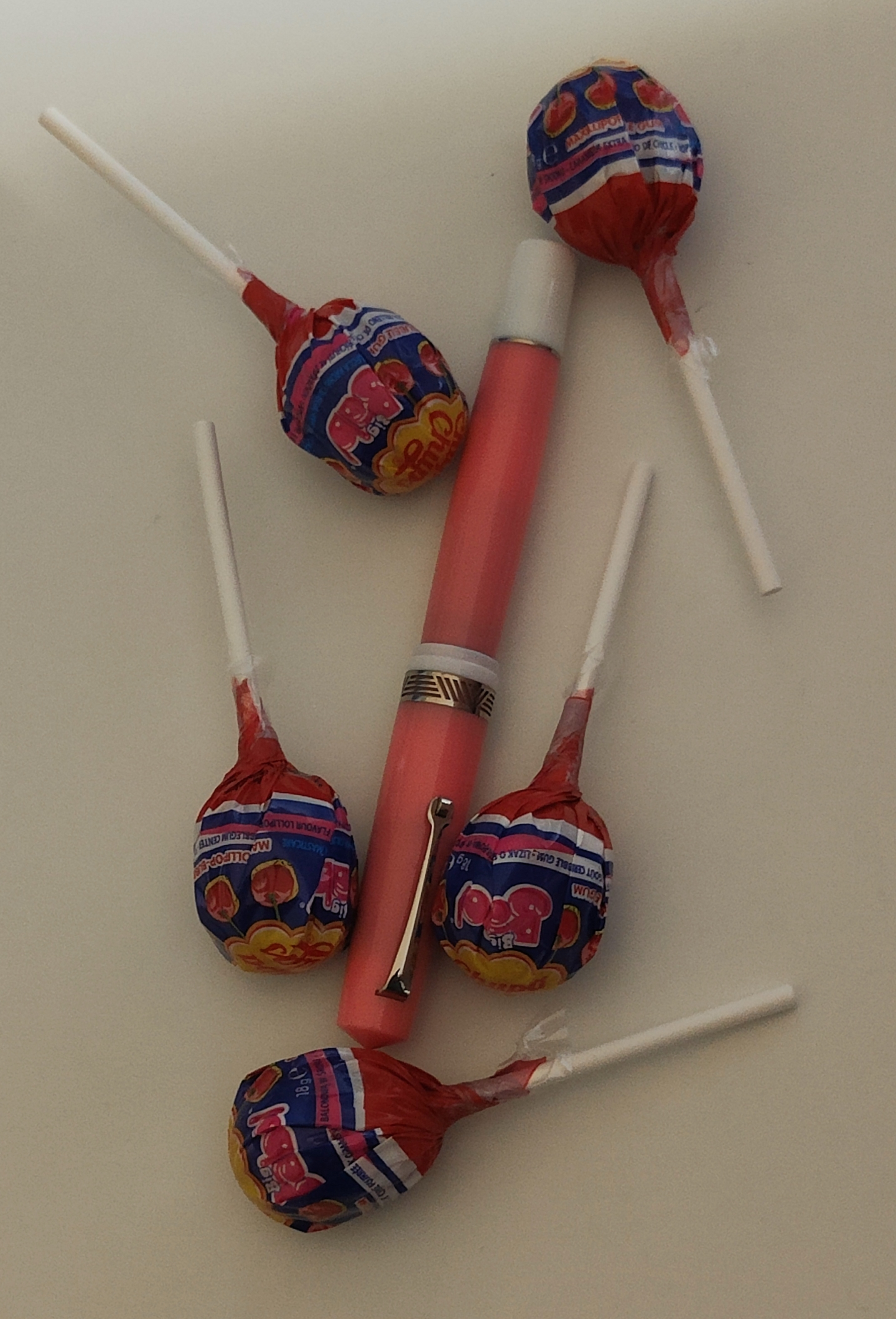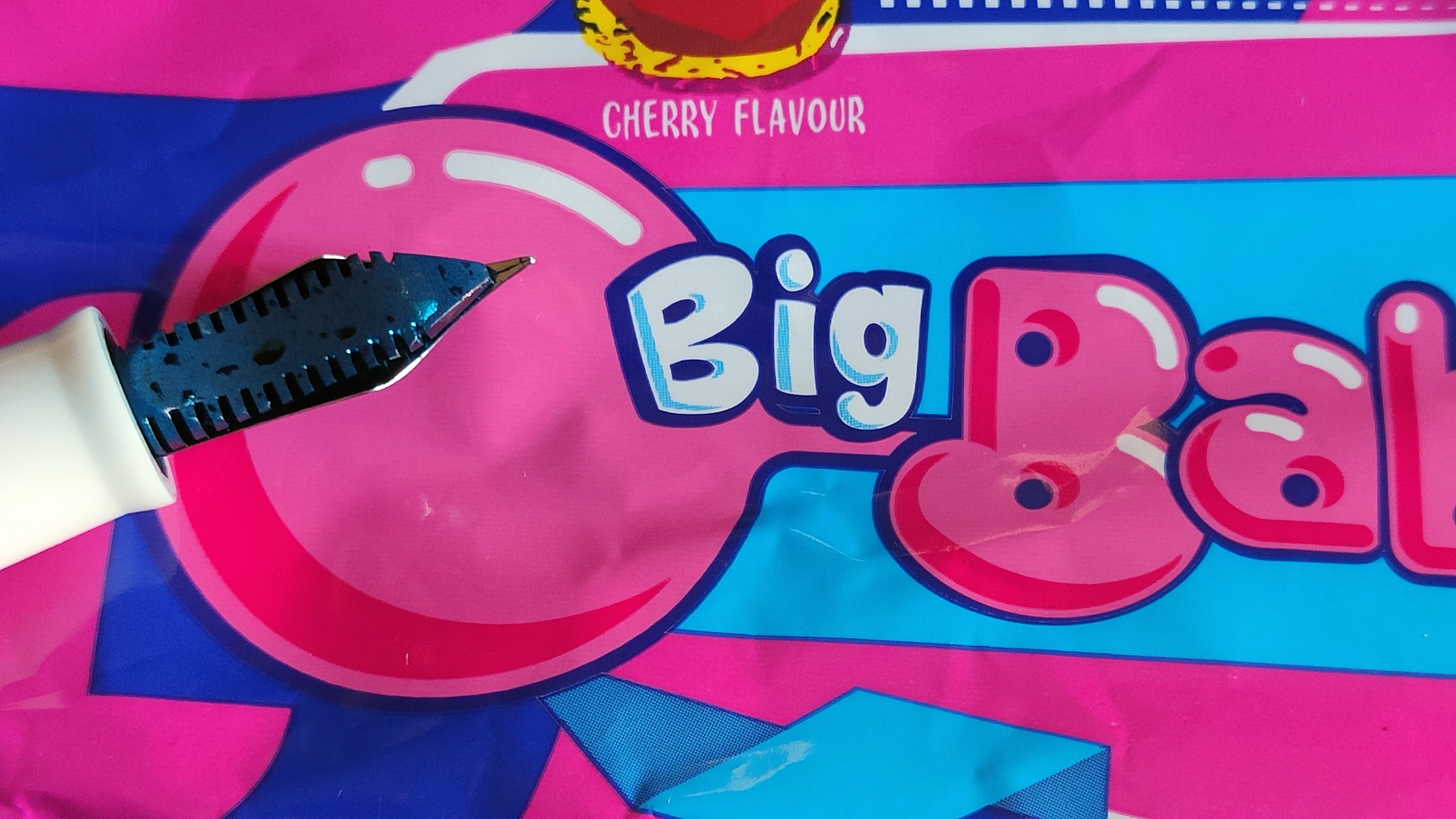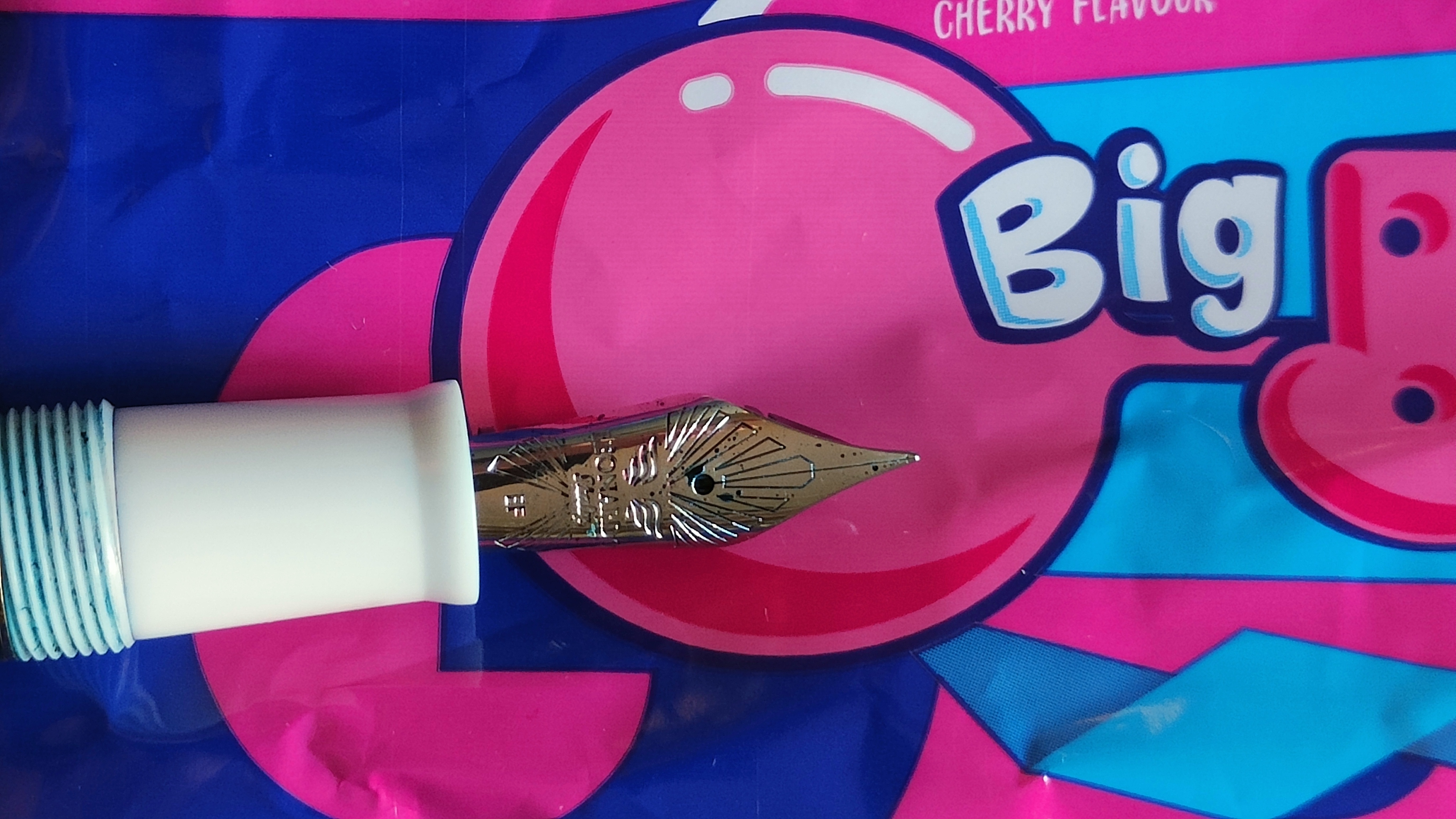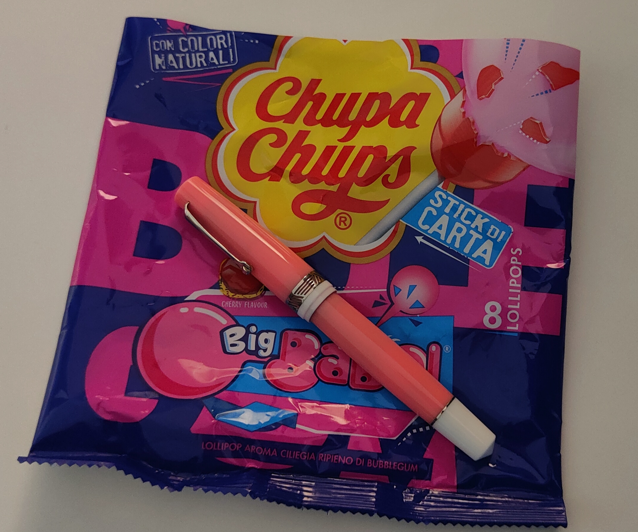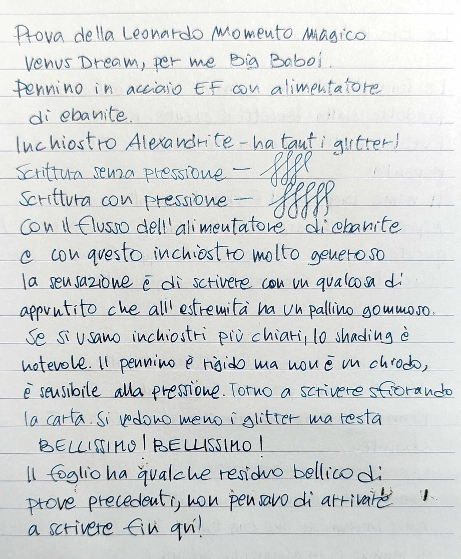 In conclusione, credo che valga la pena di provare a procurarsi una penna con l'alimentatore in ebanite e pennino in acciaio. L'acciaio è meno bagnato dell'oro ed è piacevolissimo con il flusso più carico dell'ebanite. Inoltre, siccome l'alimentatore di ABS e quello di ebanite non hanno la stessa geometria, non so se la piacevolezza nell'uso del pennino dipenda anche dalla pressione che ho applicato quando ho montato il gruppo scrittura che ha provocato una leggerissima curvatura dei rebbi. Il colore di questa penna o si odia o si ama, non lascia neutri, e questo lo dico sulla base dei commenti ricevuti: "La Big Babol è meravigliosa!" ma anche "È l'unica Leonardo che non comprerei mai!" Io la ricomprerei, senza il minimo dubbio, per me non è la Venus stream, è la Big Babol!