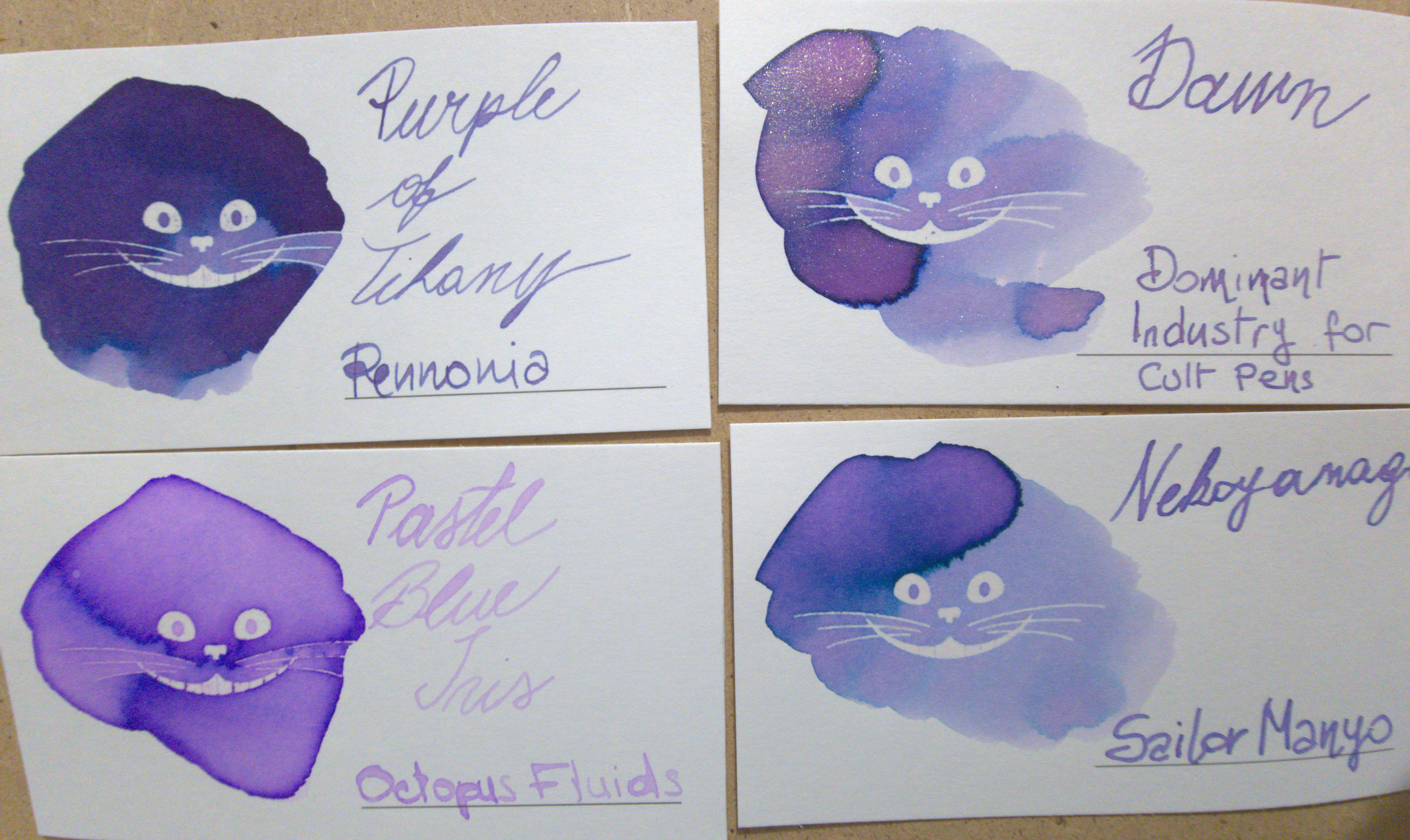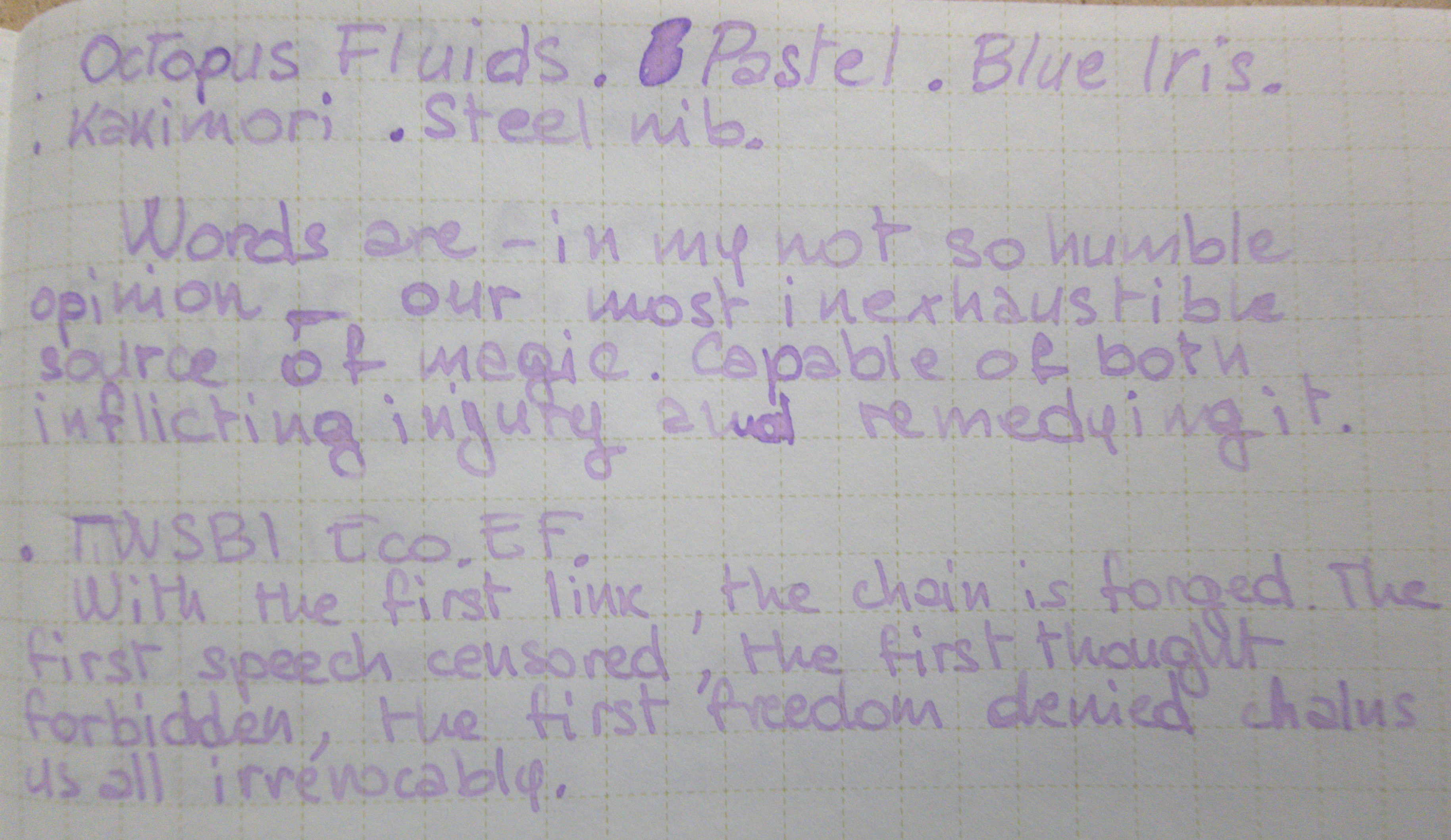 Io che sono in periodo da colori desaturati, fatico ad apprezzare questo inchiostro, nonostante il colore sia esattamente di quelli che piacciono a me. L'altra cosa che mi fa restare perplessa è la nomenclatura. Il chromashading espone il blu, sì, ma l'inchiostro in sé è viola (e non è pastello, dannati tedeschi), quindi l'iris blu è proprio un'ispirazione molto libera... più una traccia che un vero codice. (cit.)