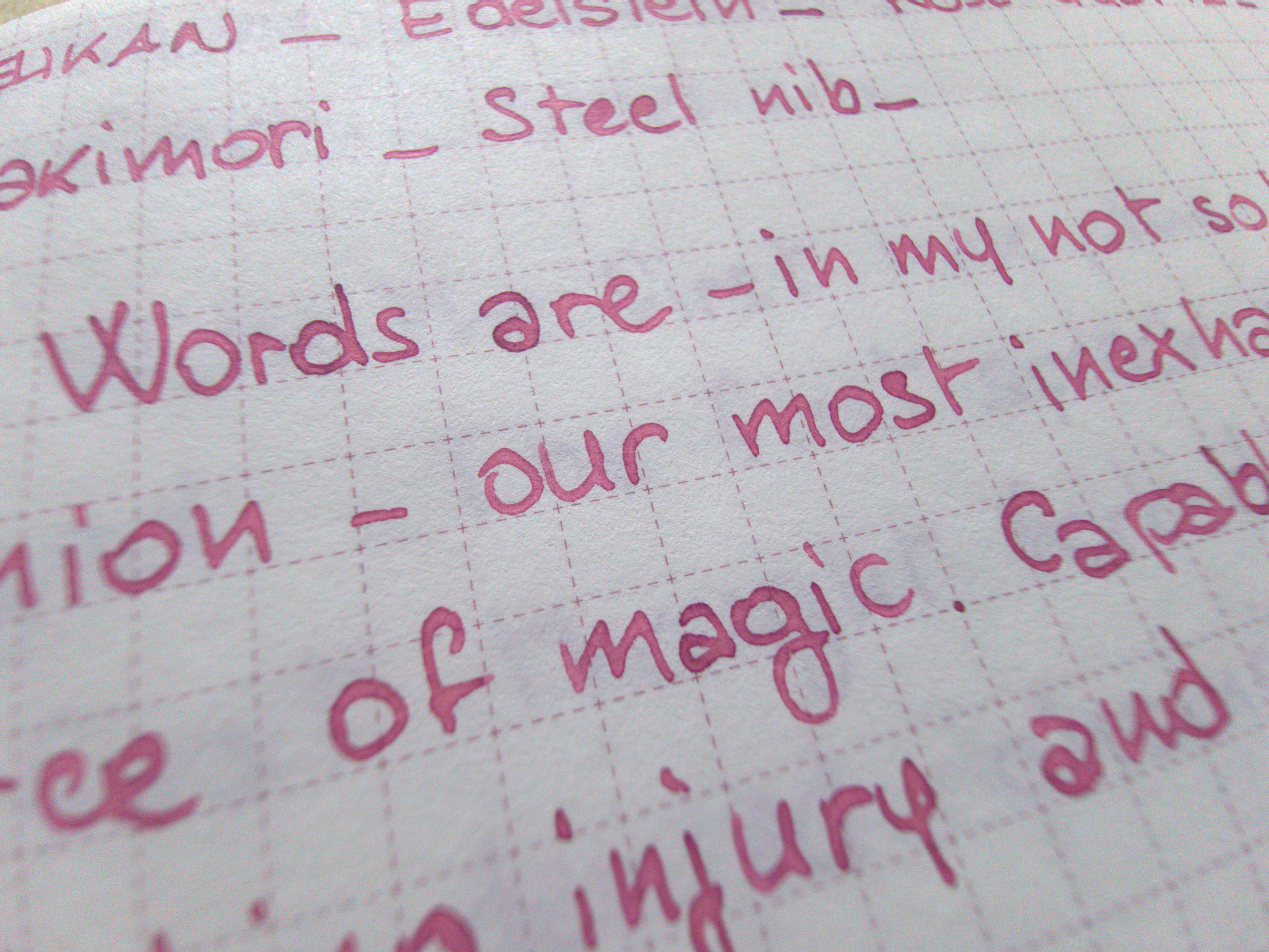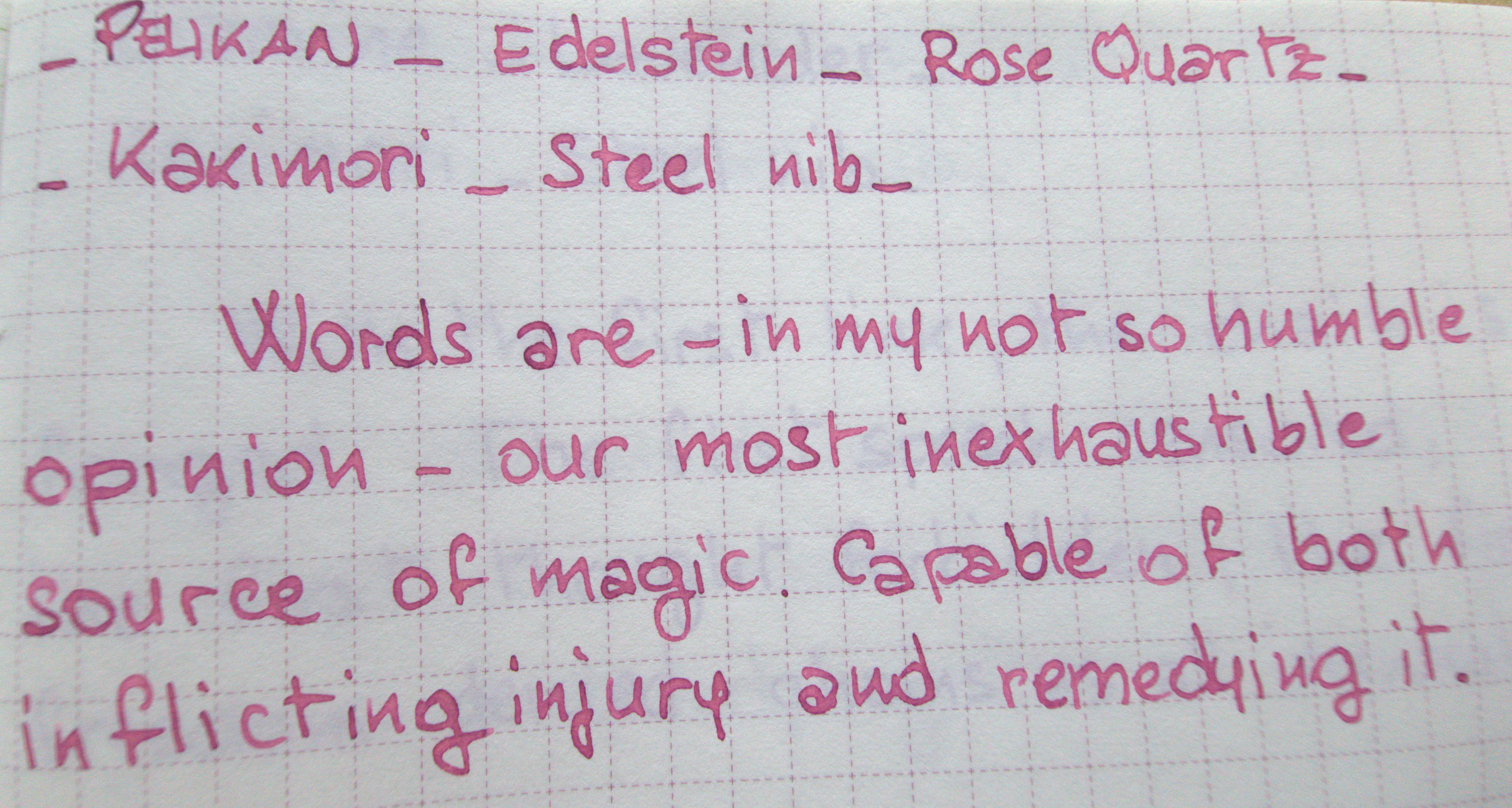 Guardando questo inchiostro e il fatto che abbiano deciso di cominciare a ispirarsi a cristalli e pietre, mi faccio l'ipotesi che la cosa sia stata forzata. E' chiaro che Pelikan non voglia rilasciare un inchiostro cromaticamente desaturato, quindi ha creato un rosa fluo e ha deciso di chiamarlo come il primo cristallo rosa che aveva in lista.