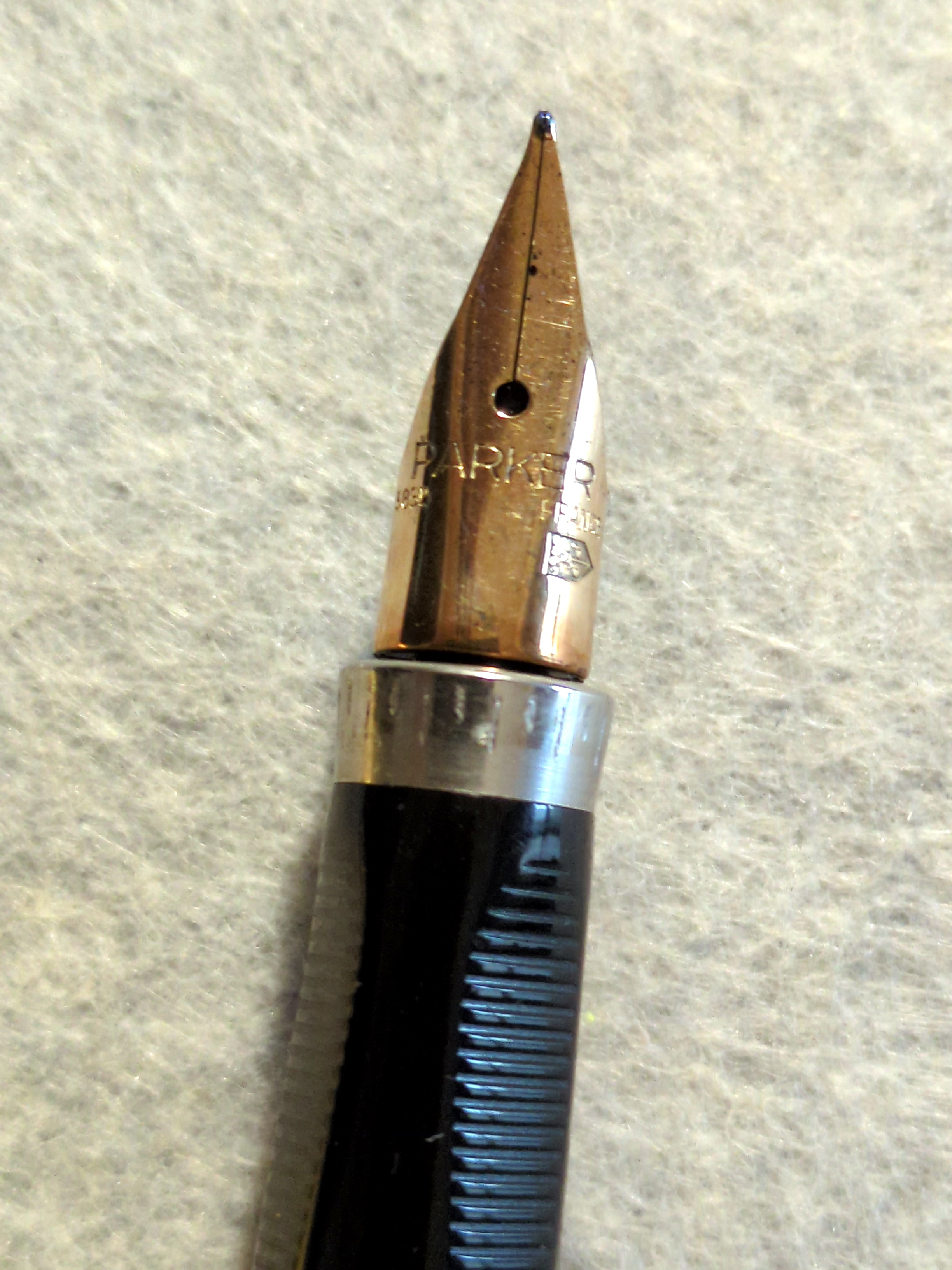 Subito al di sotto del foro di areazione, è presente l'incisione "PARKER"; più sotto, sul lato sinistro, vi è inciso "585 M", mentre sul lato destro è presente l'incisione "FRANCE" con al di sotto una punzonatura a forma di "casa" (simile al carattere HOUSE U+2302: ⌂) ruotata di 90° in senso antiorario con il vertice verso l'asse del pennino, contenente una freccia posta al centro tra due "P", una per lato, con anche l'indicazione "585 M" sulla base.