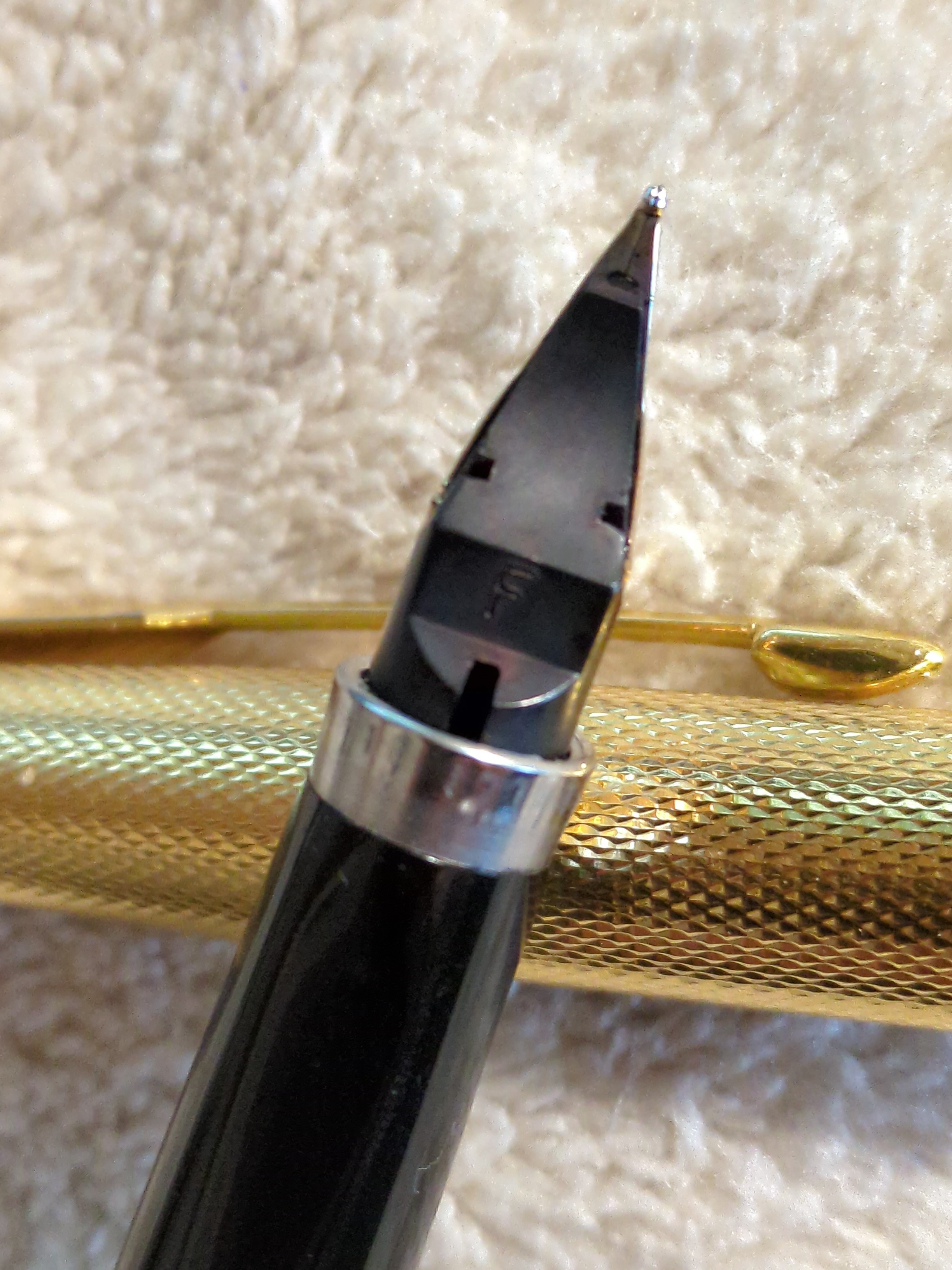 Il pennino (14k F, rigido) - che ho configurato in modo da risultare leggermente ruotato rispetto all'asse dell'impugnatura - ha dimostrato essere in perfette condizioni di efficienza (così come appariva all'esame visivo effettuato al momento dell'acquisto), rivelando anche una certa flessibilità, seppur minima.