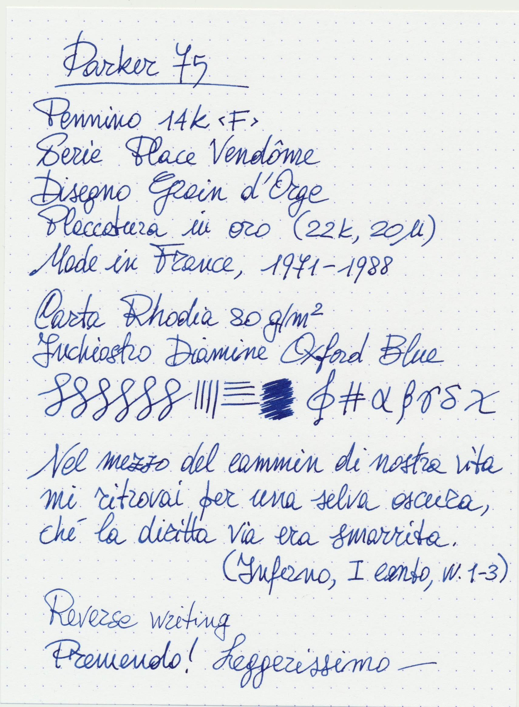 Di seguito una prova di scrittura, con inchiostro Diamine Oxford Blue su carta Rhodia 80g/m² (pregasi di perdonare la pessima grafia):