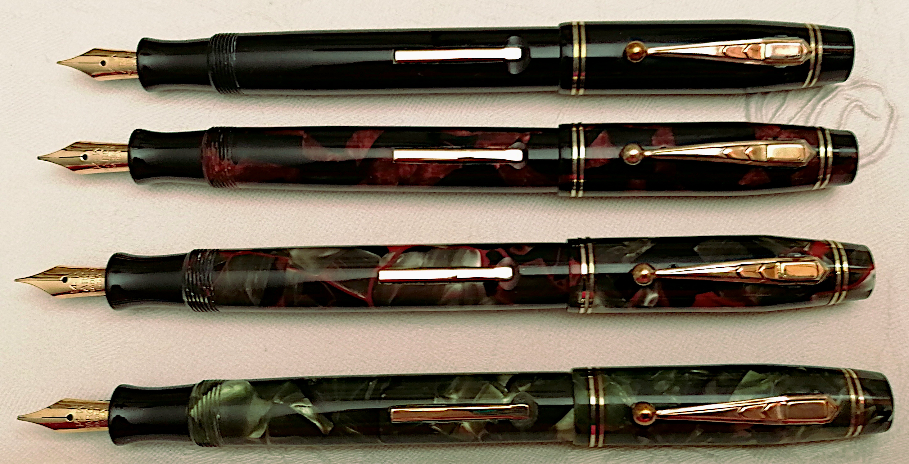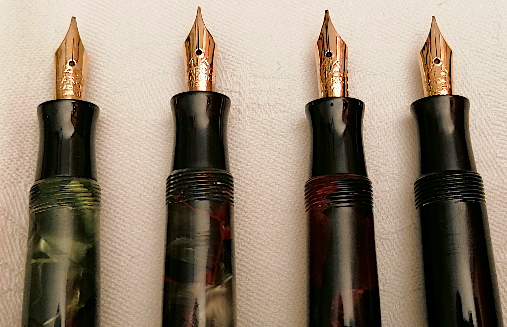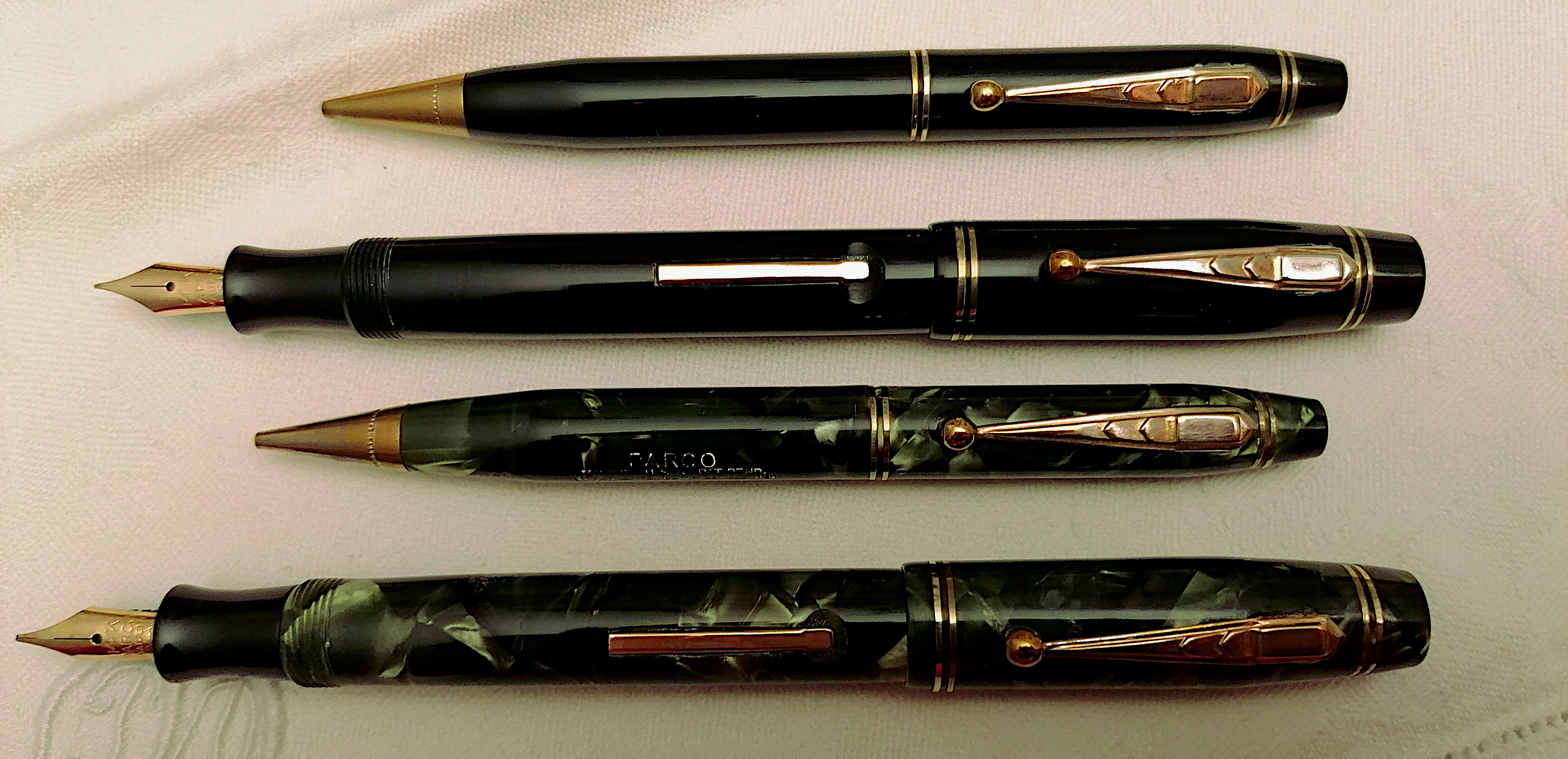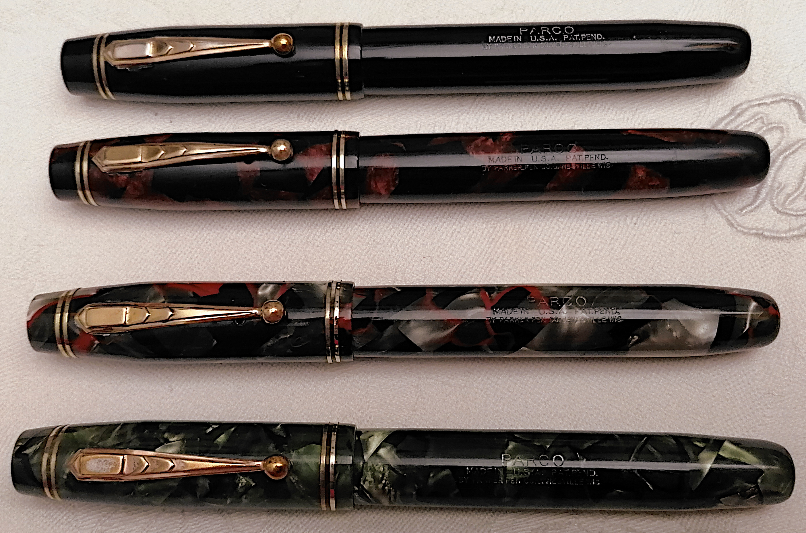 Mia intenzione è di proporvi la Parco nelle sue quattro colorazioni al fine di evidenziare come, novant’anni fa, queste “penne economiche” seppero offrire in fatto di celluloidi da barra piena o per presso fusione (le stesse della pregiata Duofold) e qualità dei pennini in oro 14 ct.