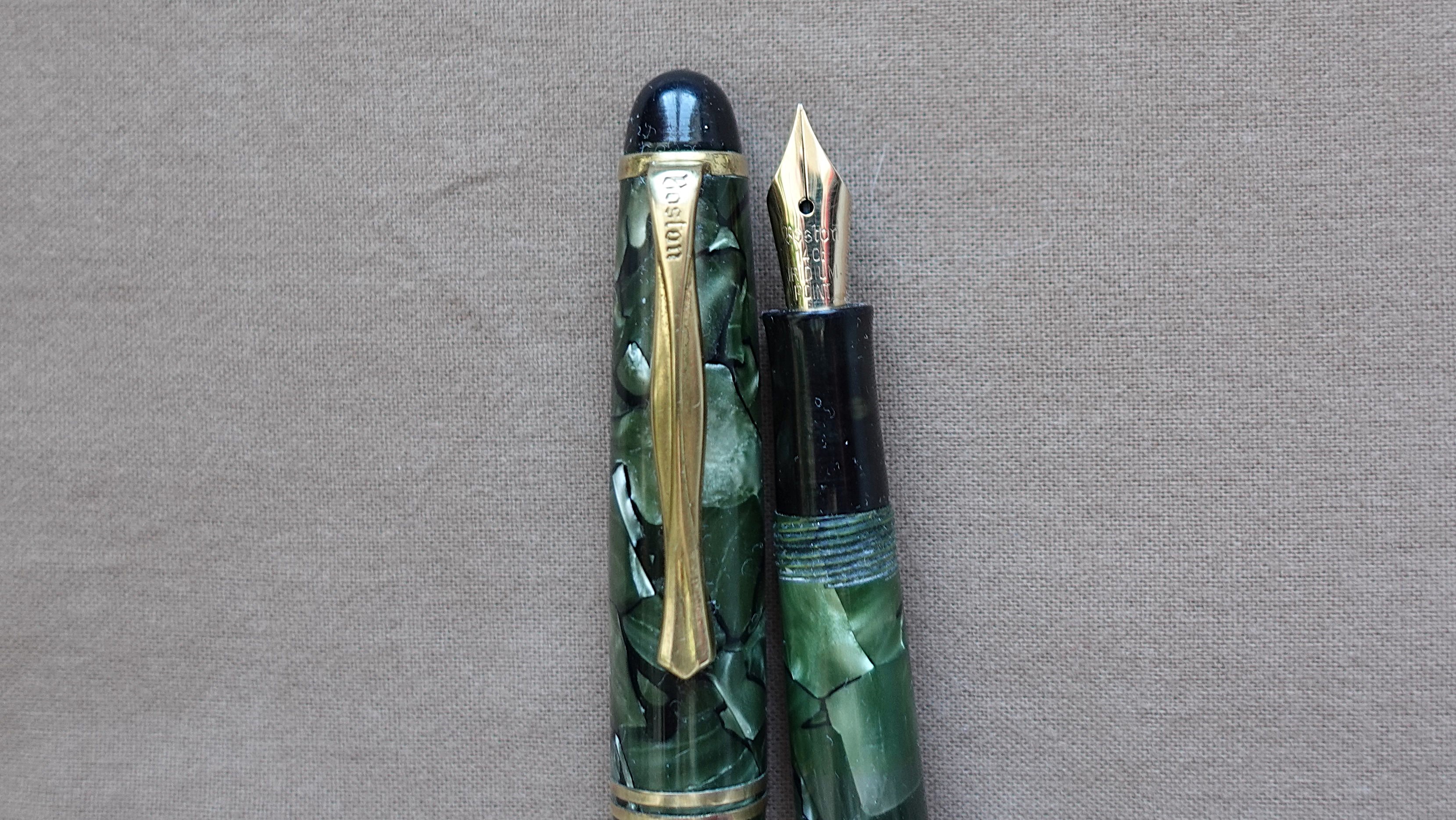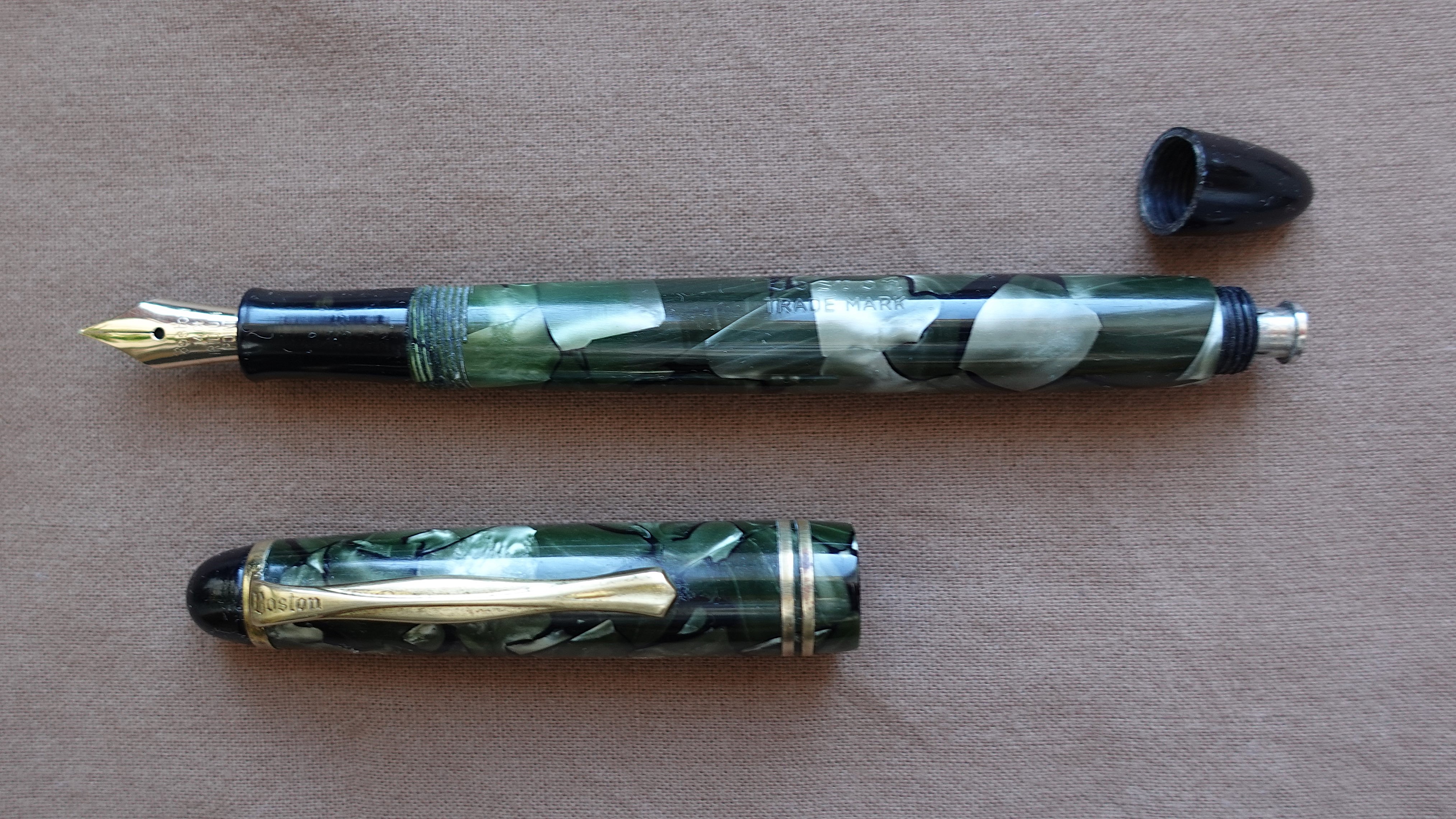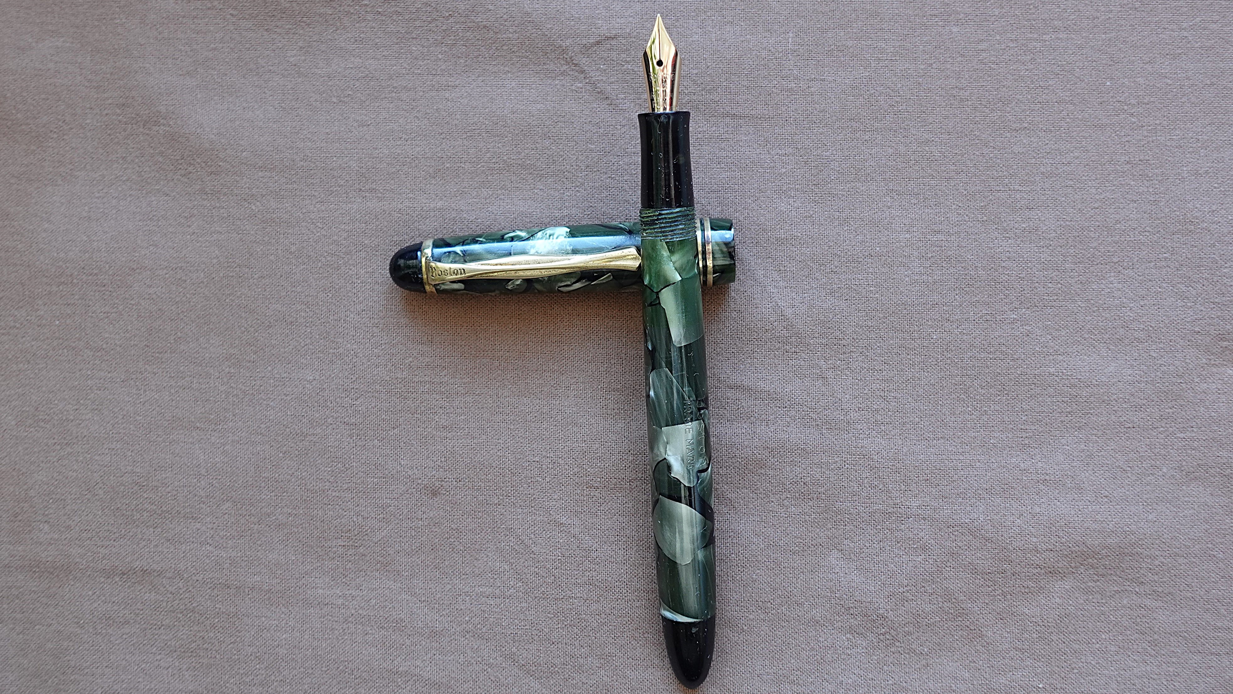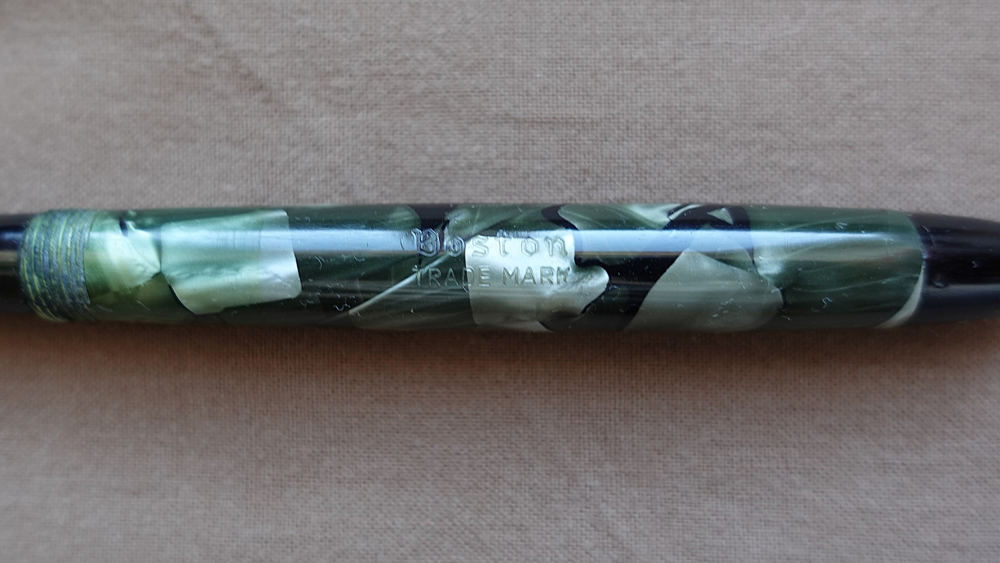 La Boston Fountain Pen Company era l'azienda che venne comprata dalla Wahl per iniziare a produrre stilografiche, ma questo passaggio avvenne nel 1917 e di certo la penna che mostri è parecchio posteriore, temo si tratti di uno dei tanti marchi minori che sono circolati fra gli anni 30 e 40, ed è davvero difficile dirti di più.