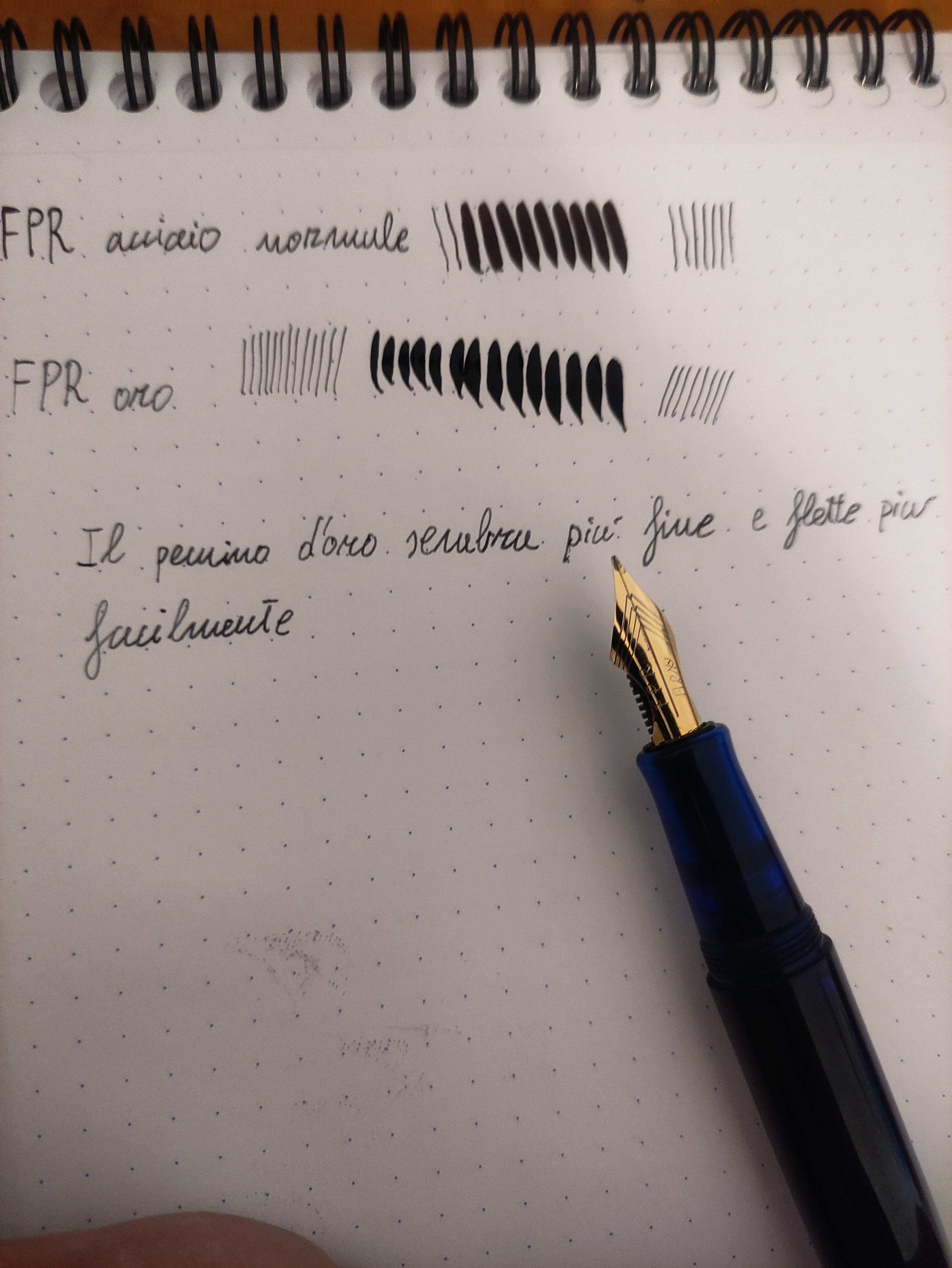 altra cosa che devo constatare e ho dimenticato di dire circa FPR oro è che le linee fatte con pennino girato al contrario sono dello stesso spessore comparate alle linee fatte con pennino posizionato correttamente. Su internet lo chiamano "reverse writing" e dicono produca linee più sottili. Nel mio caso è uguale. Stesso spessore.