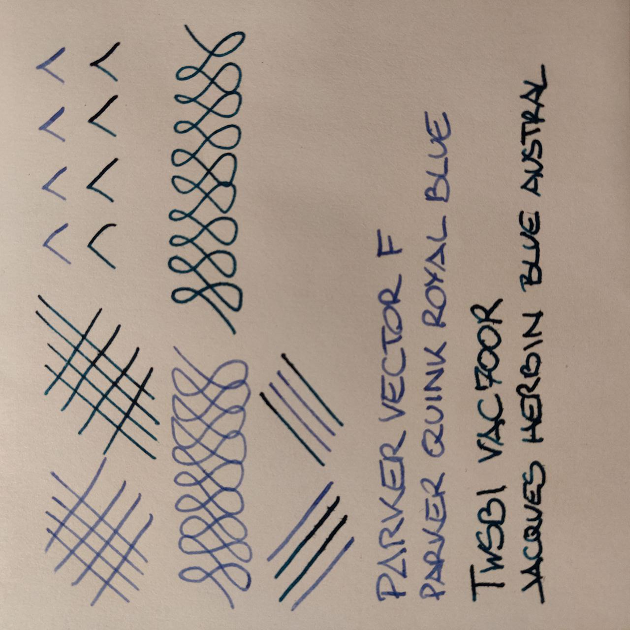 Parker Vector pennino F con inchiostro Parker Quink Royal Blue vs TWSBI VAC700R pennino M con inchiostro Jacques Herbin Blue Austral.