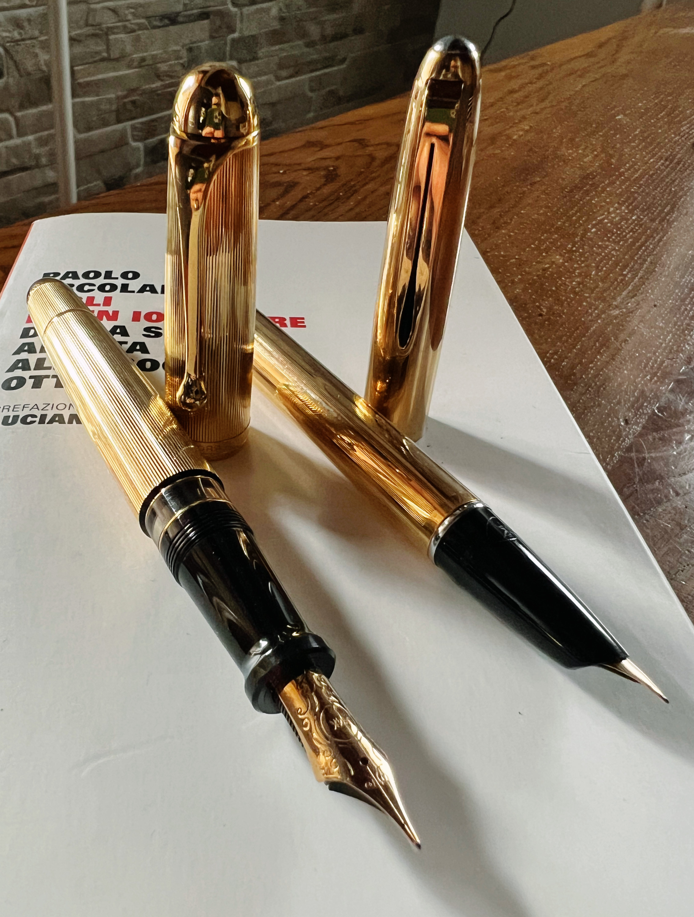 entrambe due belle penne, tra le mie preferite in assoluto, anche se in genere uso quelle con il fusto in resina. La 88 big con i rebbi lunghi è la penna che porterei sull'isola deserta, ma in sfregio al rischio pirati, dovrebbe necessariamente essere almeno quella con il cappuccio in oro millerighe! (un minimo di nobiltà, santo cielo!)