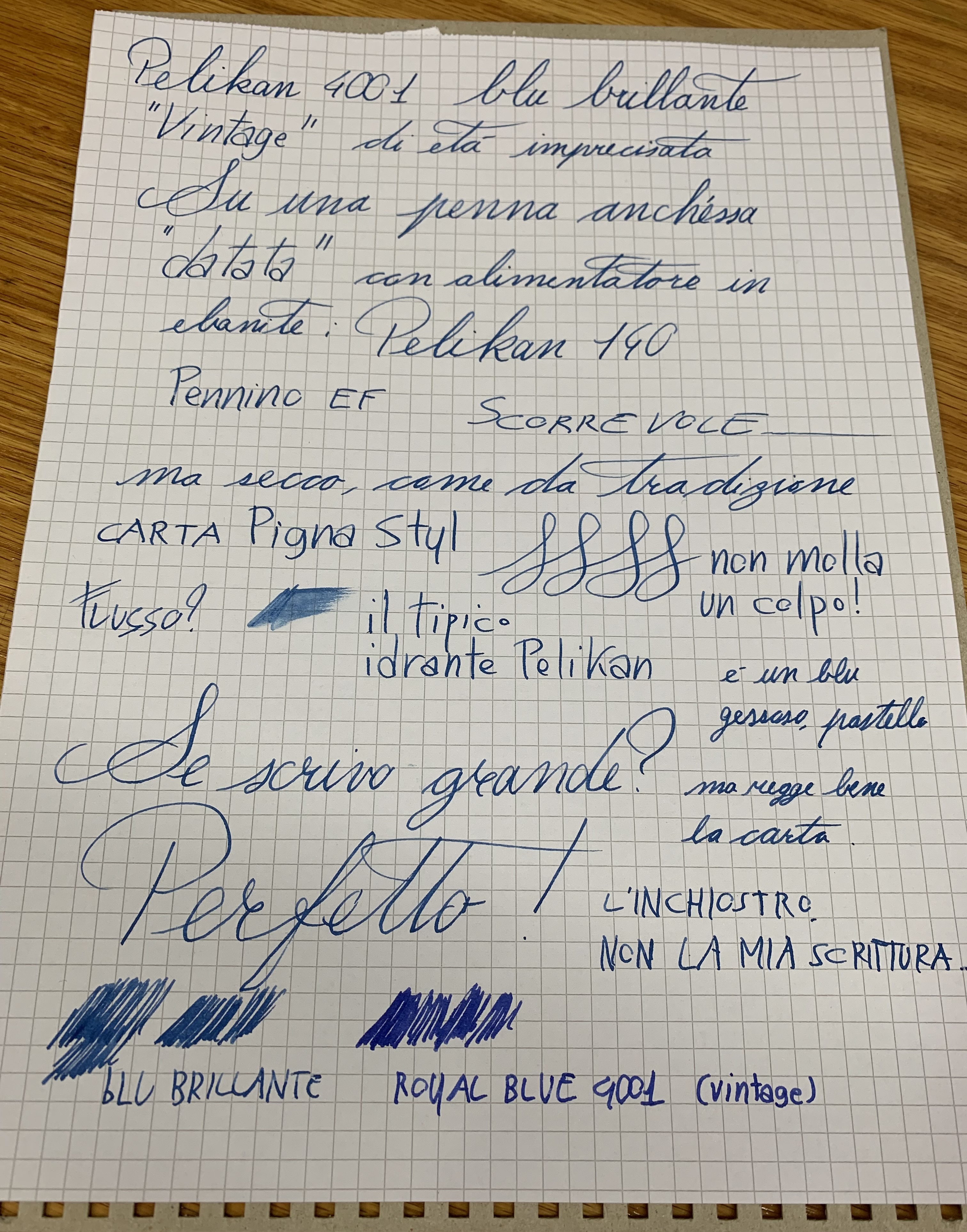 Malgrado la sua tendenza a schiarire su alcune carte il Pelokan 4001 è un inchiostro di riferimento, ma anche un toccasana. A volte mi accorgo di vuotare una penna caricata con qualche inchiostro che prometteva meraviglie e invece dopo breve uso intasa la penna :( . A quel punto il 4001 serve a potermela di nuovo godere in santa pace!