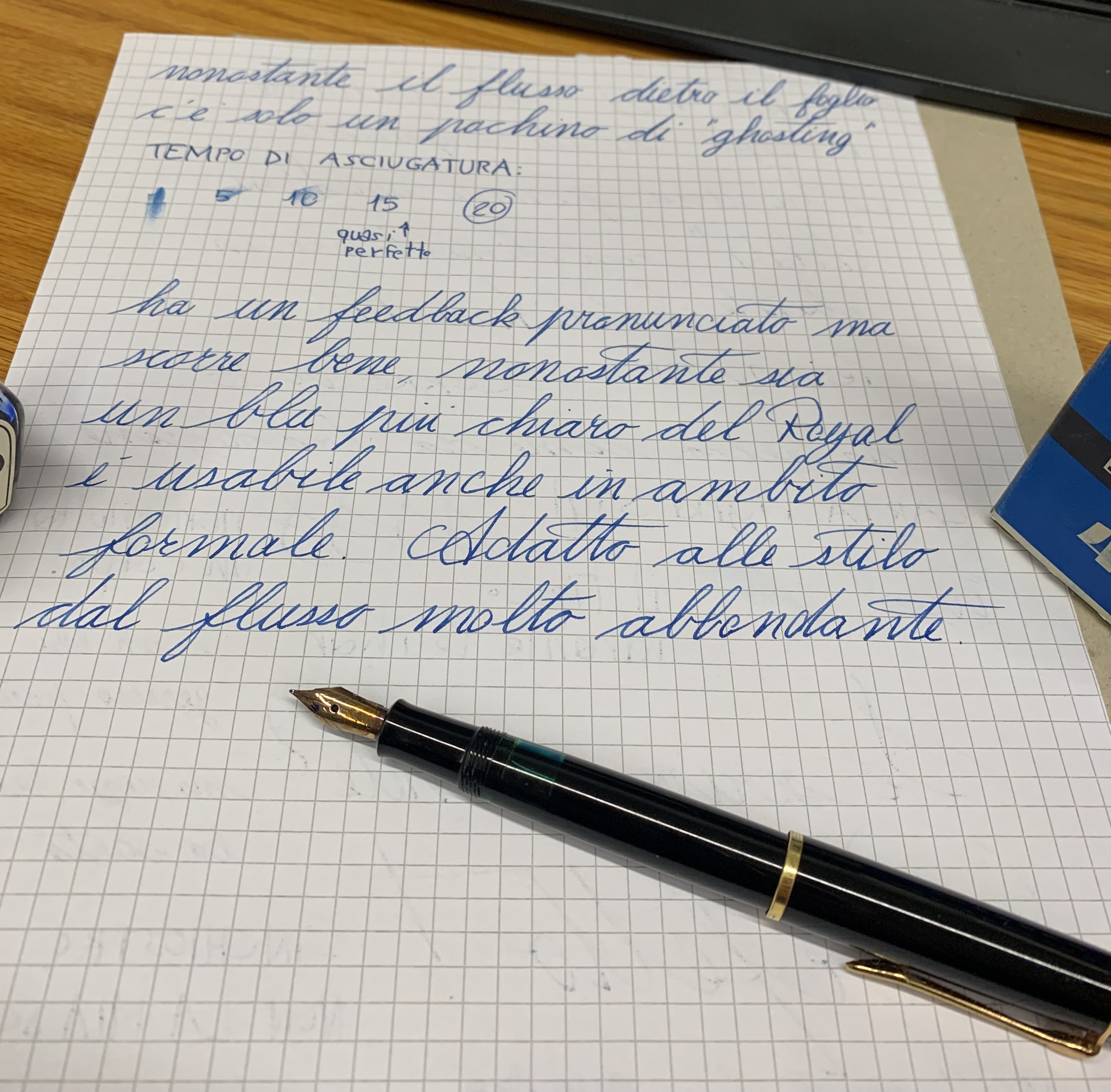 Il colore è un blu chiaro, risulta slavato se messo in penne dal flusso scarso, esattamente come il suo fratello più famoso Royal Blue.