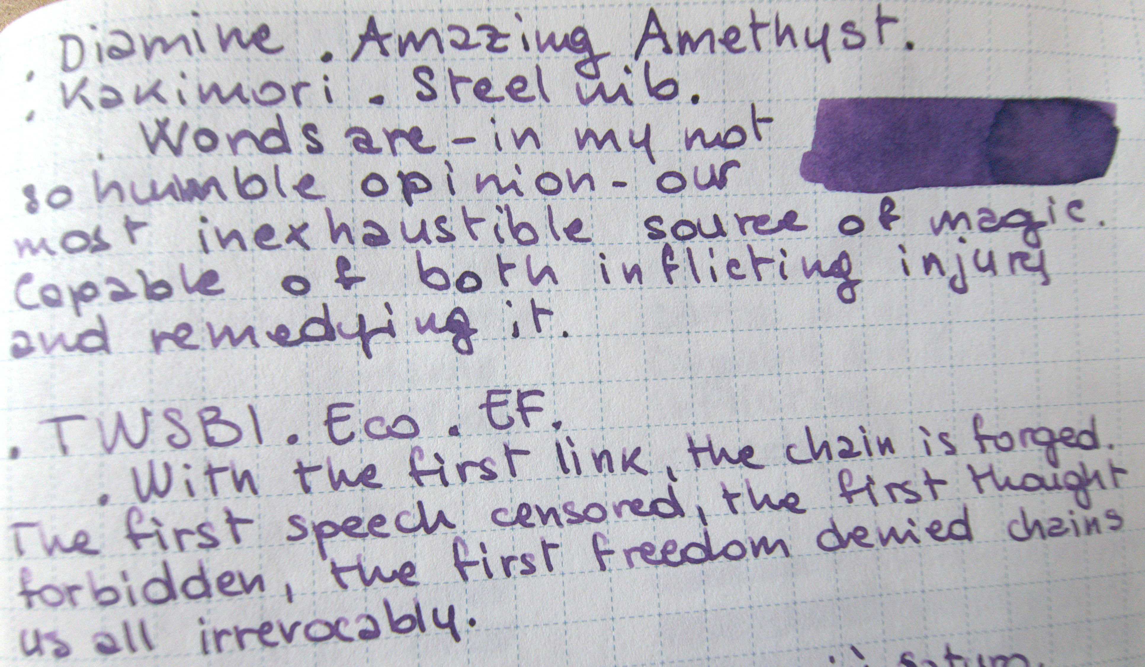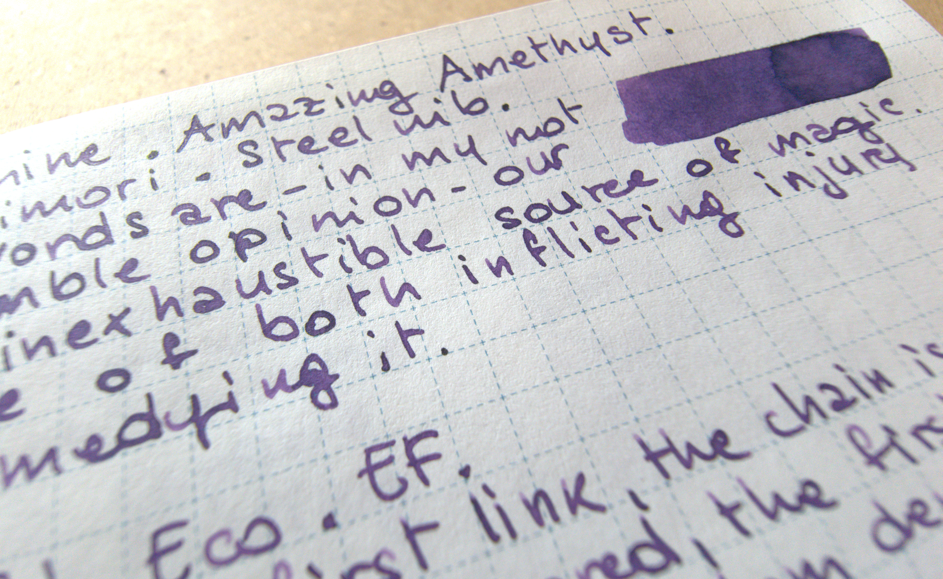 In questo momento ho sia Amazing Amethyst che Harmony in due penne e li sto alternando continuamente. Continuando a preferire i viola un poco più caldi, Harmony prende il mio personale podio ma Amazing Amethyst è sicuramente diventato uno dei viola che preferisco. Dopo averlo evitato a lungo, vedi com'è finita!
