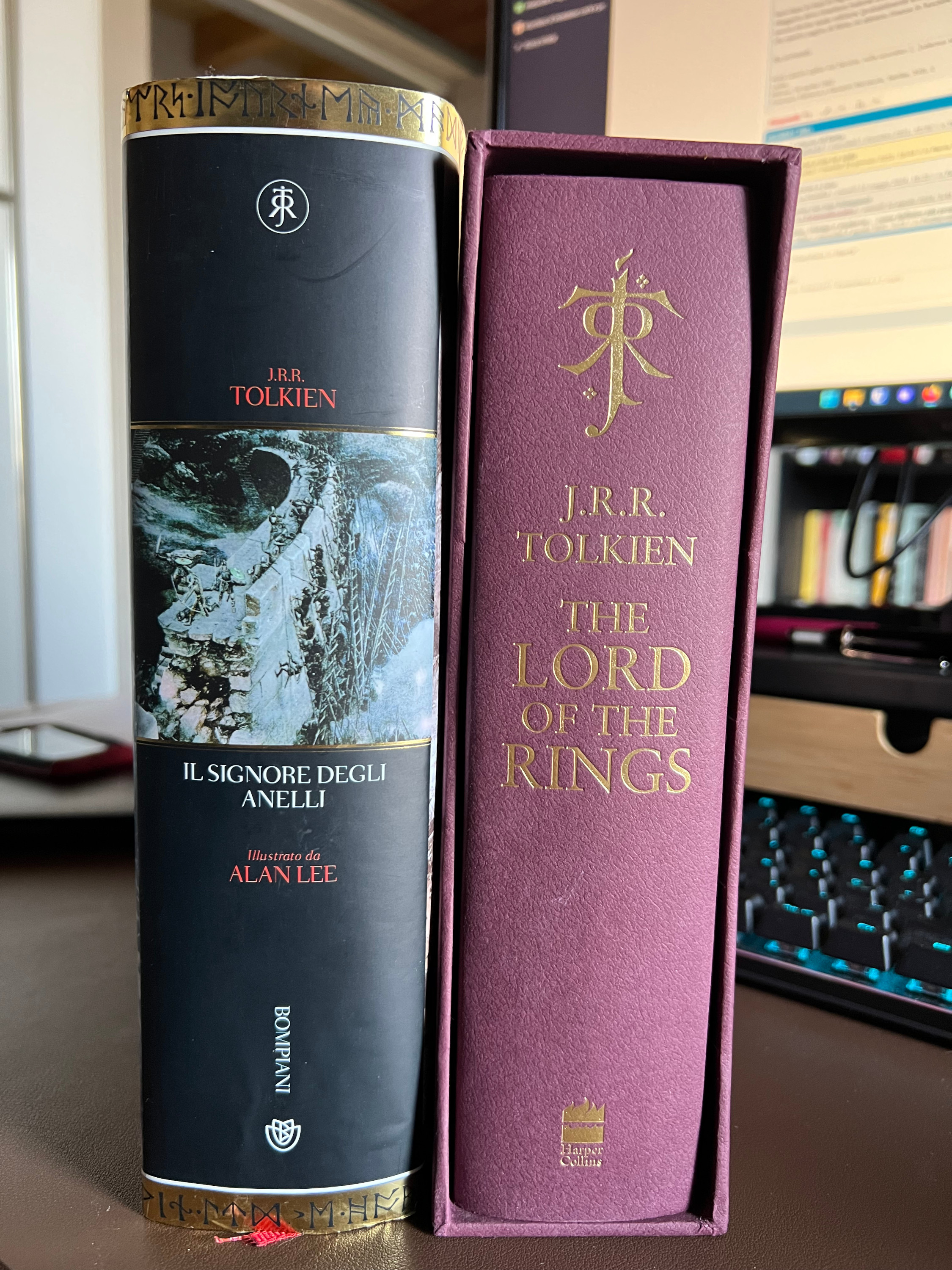 Il mio primo incontro con Il Signor degli Anelli fu il film d'animazione La compagnia dell'anello quando ero ragazzo. Mi spavento così tanto che non ne volli più sapere per oltre un decennio. A metà degli anni 90 comprai l'edizione di lusso inglese della Harper Collins con tutte le illustrazioni. Un vero mattone una palla pazzesca, lo lessi una volta e mai più. Ringrazio sempre Peter Jackson per aver portato al cinema un mattone del genere. L'unico modo in cui l'opera è fruibile. :P