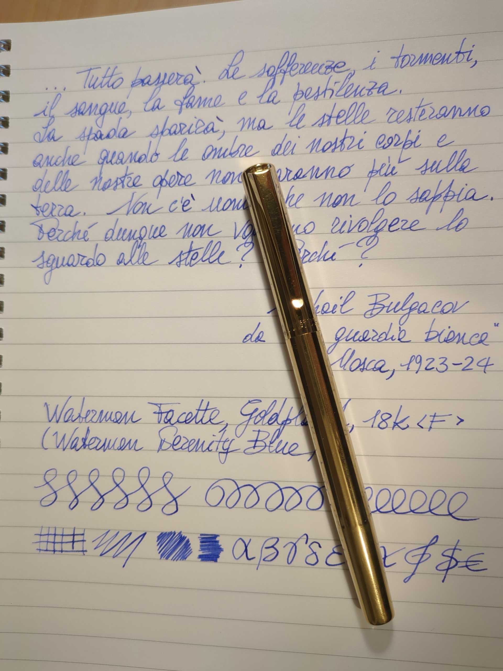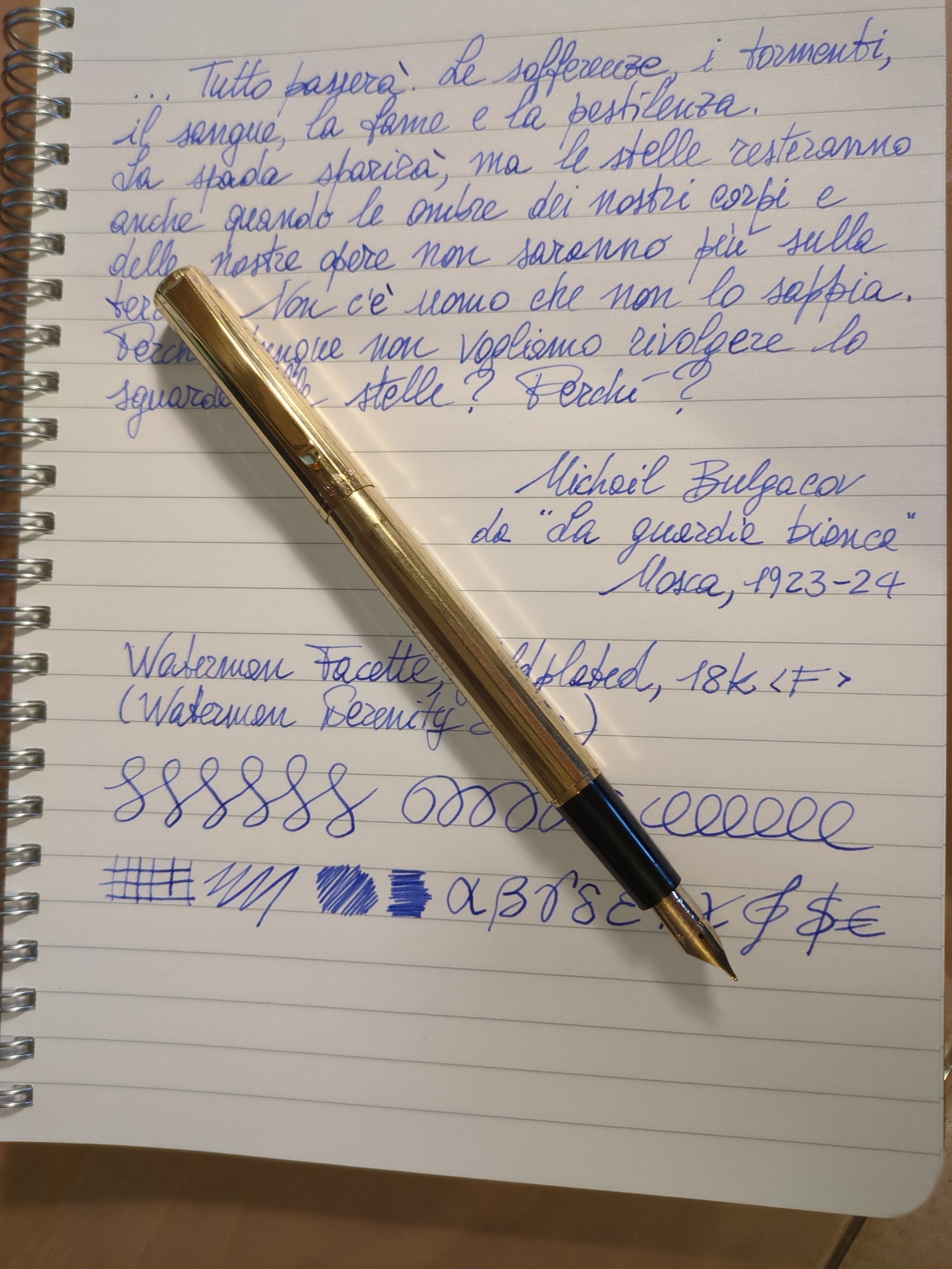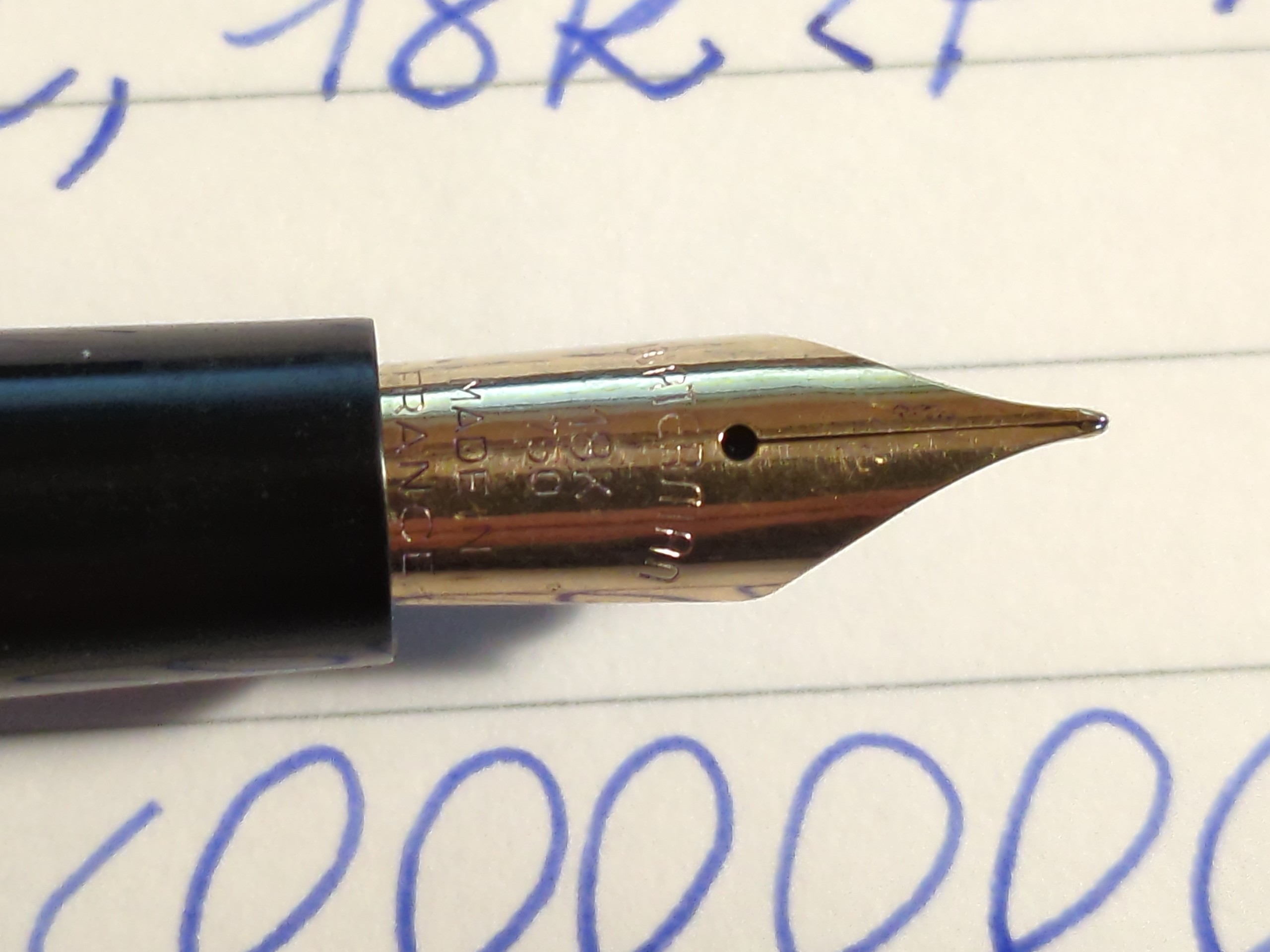 - il pennino è un 18k, fine (anche se non ho trovato indicazione della misura), con incisione su 5 righe: "WATERMAN" "18k" "750" "MADE IN" "FRANCE"