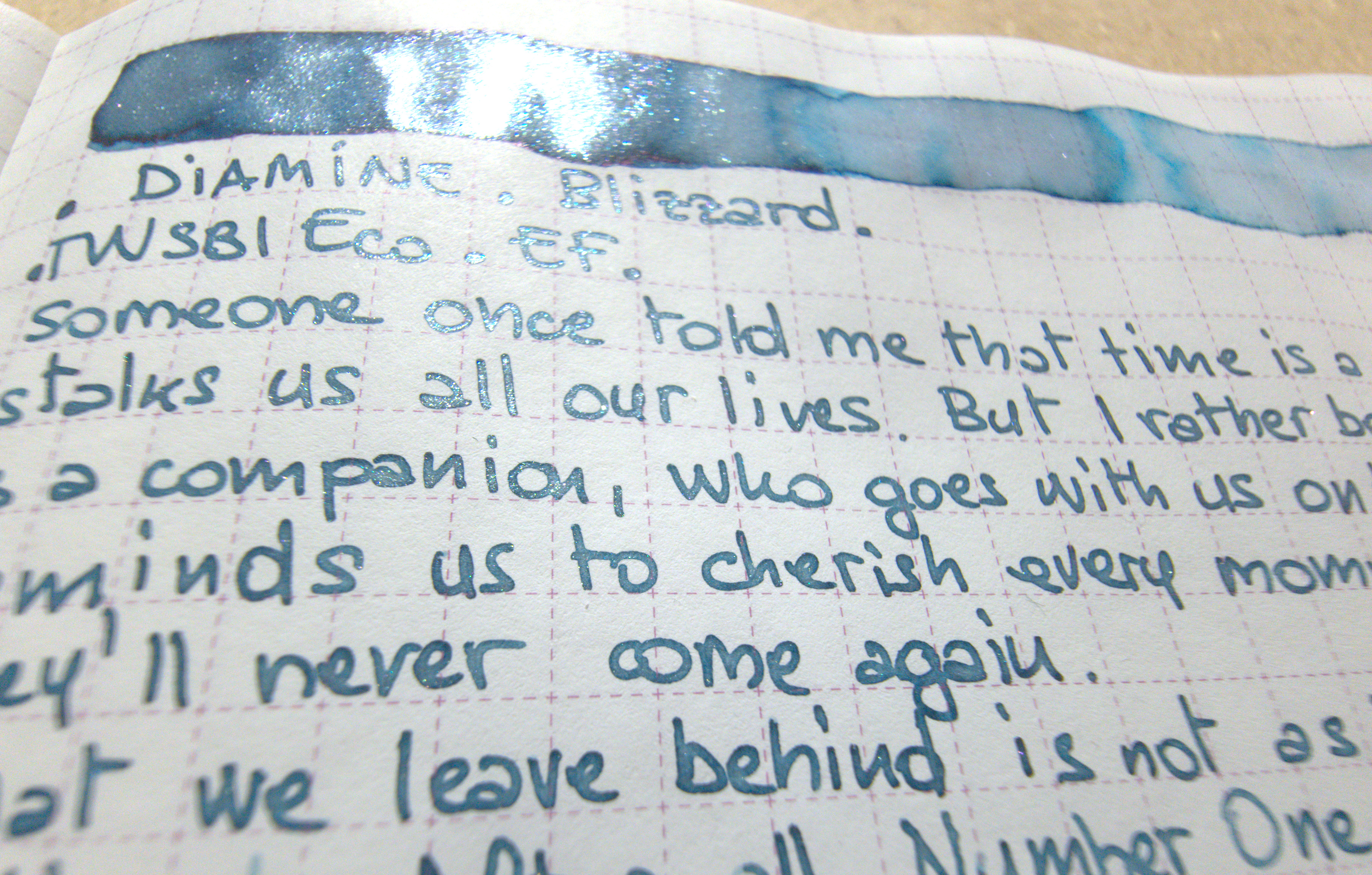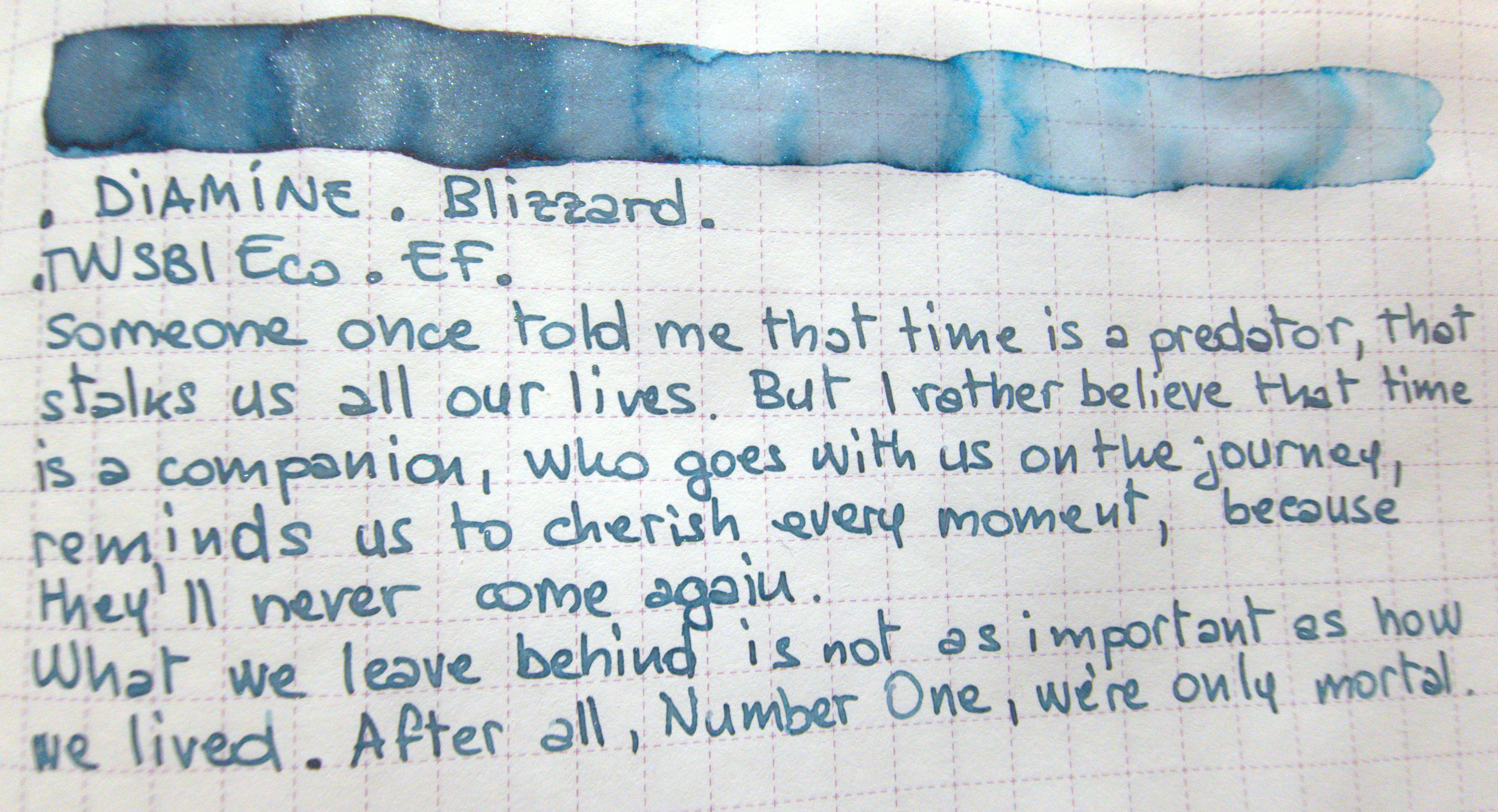 Nell'ambito dell'Inkvent 2023, Blizzard è un po' un colore ridondante. Diamine ha introdotto in quell'anno inchiostri della serie Starbrite con Glacier [QUI: viewtopic.php?t=32946 ], che già copriva l'azzurro freddo e la novità, Blizzard poteva anche essere lasciato da parte, secondo me.