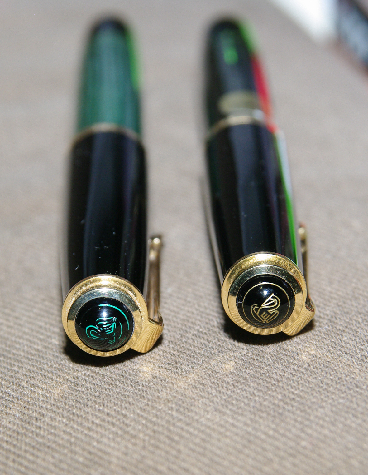 Avevo letto qualcosa su Pelikan Collectibles. Vedendo le foto delle tue, mi spiace che il cocuzzolo del cappuccio della mia non abbia più il marchio. Un precedente proprietario dal dente facile deve averlo un po’ maltrattato. Ora è monocolore con un piccolo scalino e si intravede appena un residuo di pellicano