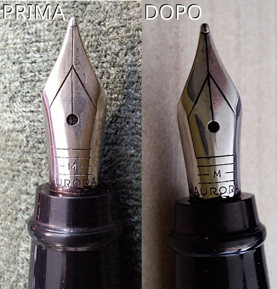 In questa foto a confronto i due stati del pennino: il tartaro all'innesto mi sembra non scomparso del tutto ma notevolmente diminuito.