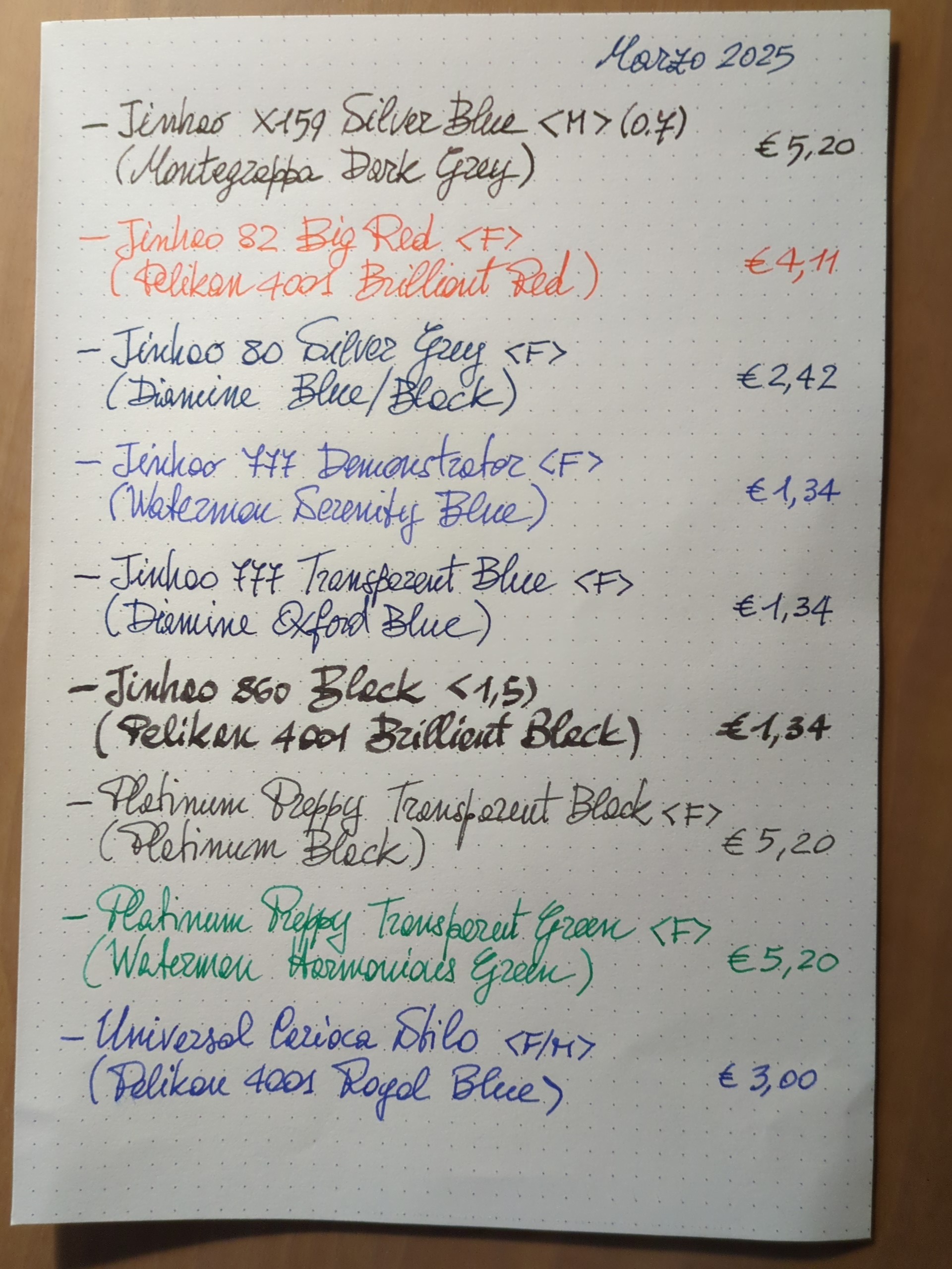 Jinhao x159: considerando il prezzo di 7.50€ , arrivata col converter, le plastiche sono "decenti " come anche le dorature. Il pennino F è arrivato con i rebbi troppo stretti ma dopo una veloce sistemazione scrive bene con flusso "normale".