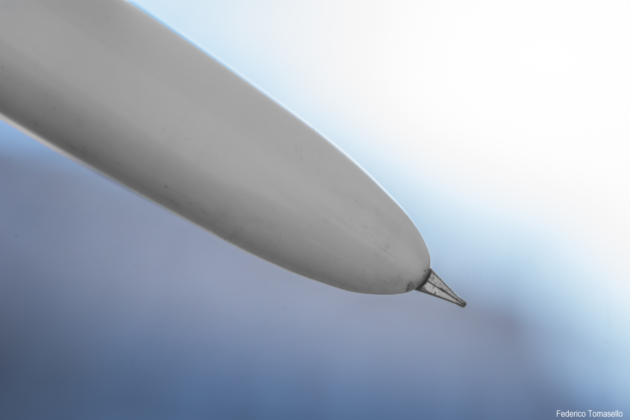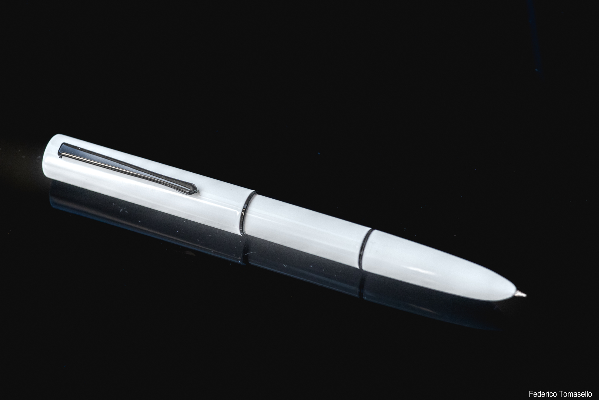 Apparentemente la più banale e bruttina delle tre, si è rivelata tra le mani una penna studiata alla perfezione: bello il materiale, bella la finitura (difficilmente fotografabile), leggera e resistente e soprattutto perfettamente bilanciata. Essendo piatta sul fondo, si può tranquillamente mettere in piedi sul tavolo senza problemi e non cade neanche se sollecitata bonariamente.