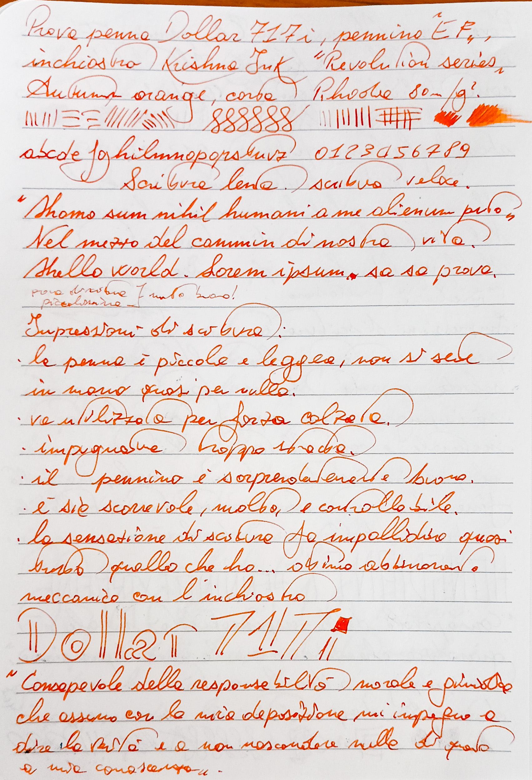 è una bella pennina la Dollar, peccato per i materiali un po' troppo economici (alla lunga lo stantuffo tende a lasciar passare l'inchiostro dietro lo stopper), però ha un gran bel pennino. Ce l'ho in uso adesso!