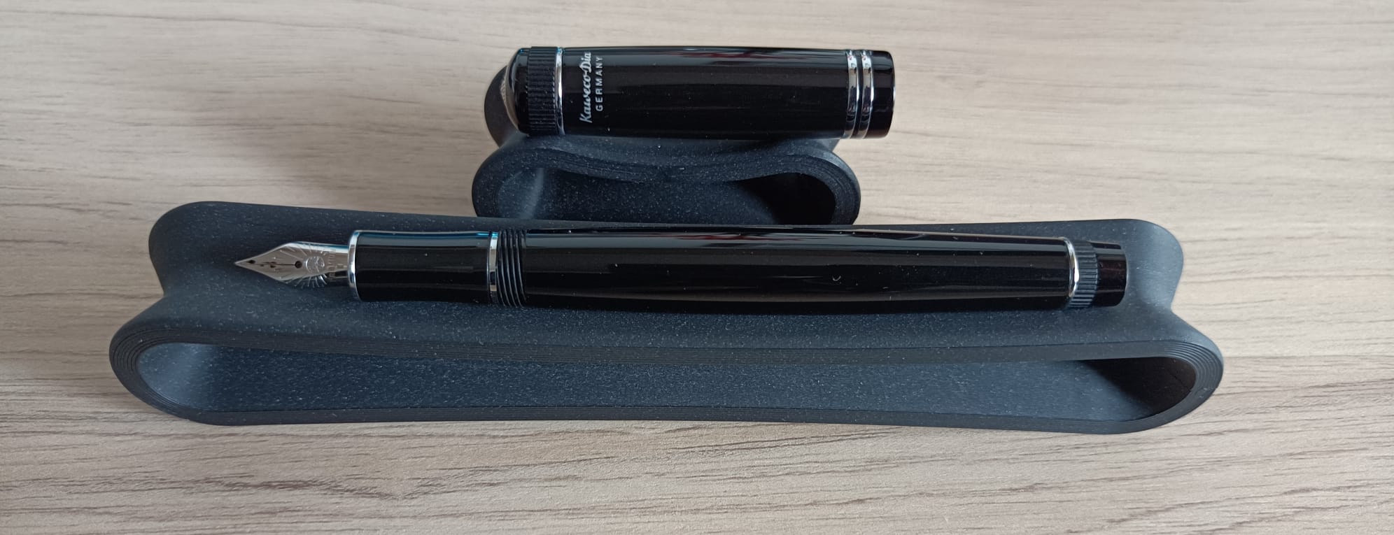 Iniziamo con la descrizione esteriore: si tratta di una penna in resina nera lucida con minuterie rodiate, di dimensioni medie: circa 130 mm chiusa, circa 125 mm aperta, il peso è di 29 g con il cappuccio e 19 g senza. All’estremità del cappuccio troviamo una testina sulla cui sommità c’è un gioiello in metallo che presenta a rilievo il logo di Kaweco; la testina termina con una fascia in resina zigrinata, dopo la quale troviamo l’anello di fissaggio della clip. La clip presenta sulla parte frontale un’incisione con il nome “Kaweco” scritto in font corsivo e una decorazione che arriva fino all’estremità a cravatta. Vista di profilo la clip presenta una bella curva. Sulla parte del cappuccio opposta alla clip è presente la scritta su due righe “KawecoDia / Germany”. In fondo al cappuccio vicino al labbro sono presenti due anelli metallici. Passando al corpo, esso si sviluppa con una entasi al centro, dunque presenta una rastrematura verso l’estremità. Verso la fine è presente un altro anello che delimita un falso fondello, il quale ricalca in modo speculare la conformazione della testina del cappuccio: parte zigrinata vicino all’anello, parte in resina lucida e sul fondo un altro gioiello metallico con il logo di Kaweco. Svitando il cappuccio si rivela una sezione di scrittura leggermente concava e delimitata da due anellini metallici, uno verso il corpo subito prima della filettatura e uno alla fine della sezione verso il pennino.