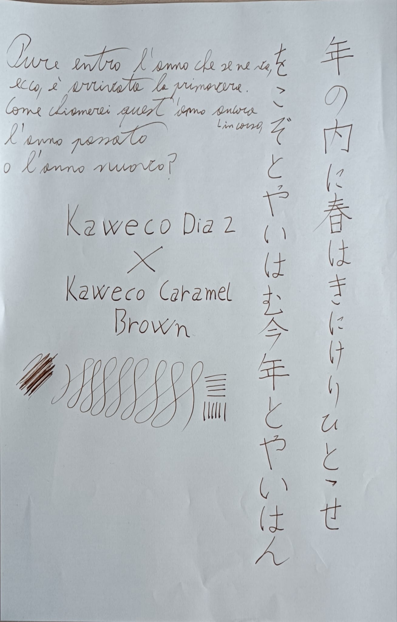 Veniamo dunque alle prestazioni di scrittura. Non ho un pennino Kaweco in oro con cui fare il confronto, ma mi sembra che questo pennino mantenga le promesse di ottime prestazioni di scrittura: pur essendo un extrafine scorre molto bene sulla carta senza essere scivoloso, rilascia un tratto sottile (non certo alla giapponese, ma non mi lamento) e costante. L’unico appunto negativo che devo fare è che con l’inchiostro attualmente in uso (Kaweco Caramel Brown) capita che ci siano interruzioni di flusso durante la scrittura, che si risolvono sempre in pochi minuti, ma sono comunque un po’ fastidiose. Mi ricordo che con un altro inchiostro che ci avevo messo tempo fa (mi pare fosse il Kaweco Royal Blue) non si erano presentati questi problemi. Penso che a breve la pulirò a fondo e proverò a usare un altro inchiostro. Al di là di questo, la scrittura è molto molto piacevole. Vi lascio una prova di scrittura con una poesia che si confà a questo periodo di inizio di primavera.