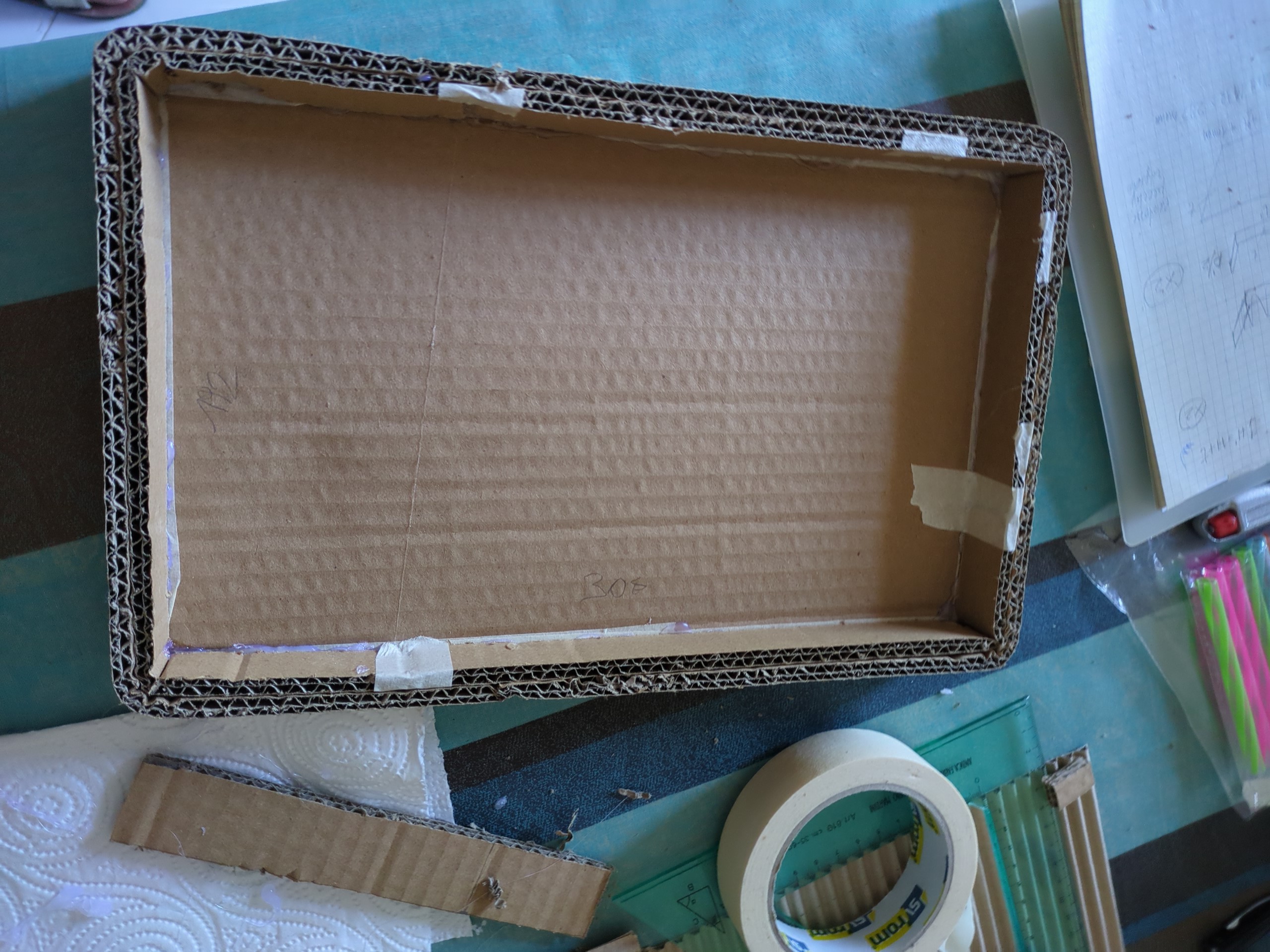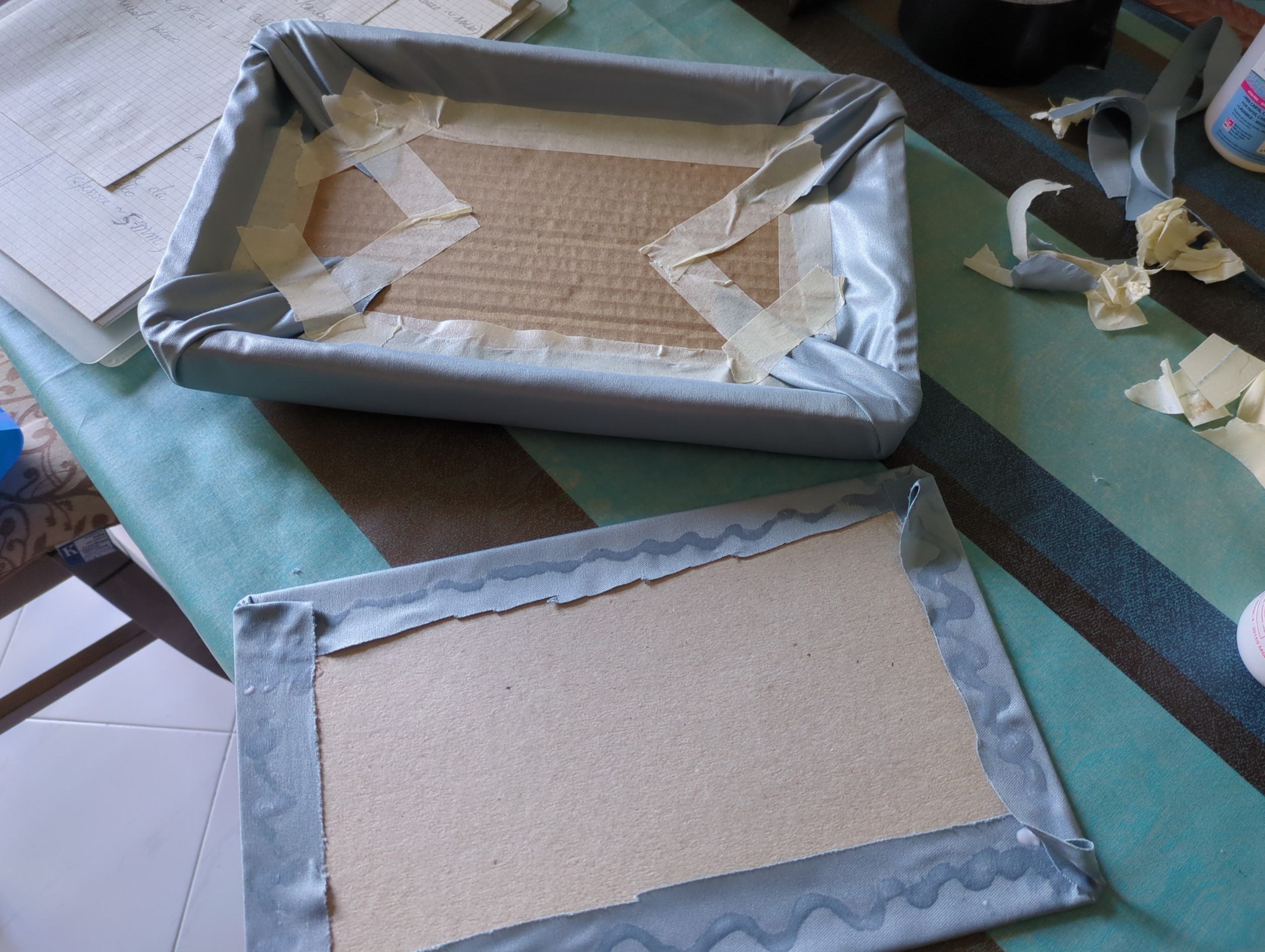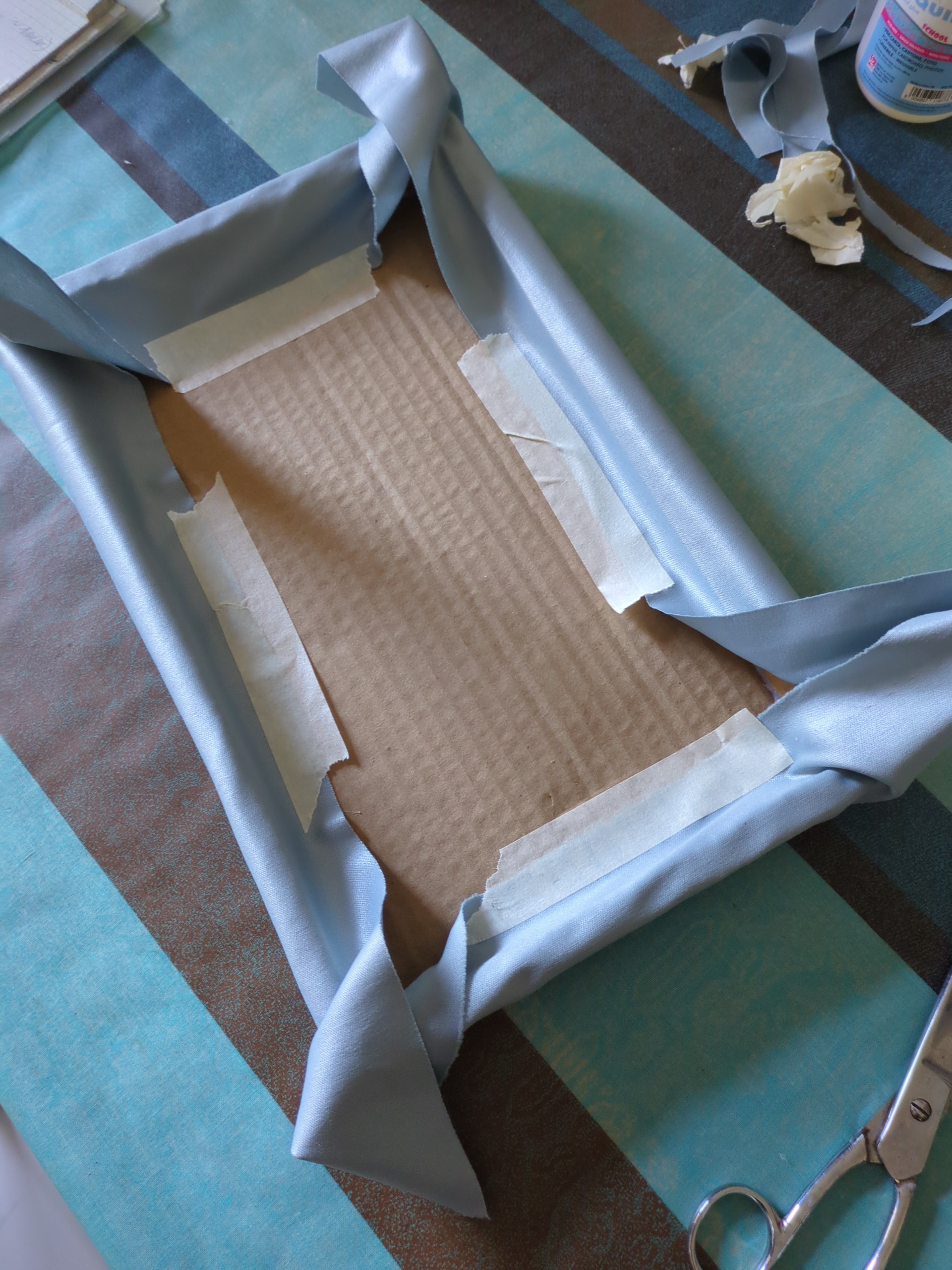 m) Tagliato un rettangolo di tessuto di circa 390x500mm, utilizzando del nastro carta e della colla vinilica, lo si usa per rivestire la parte inferiore e i bordi del vassoio.