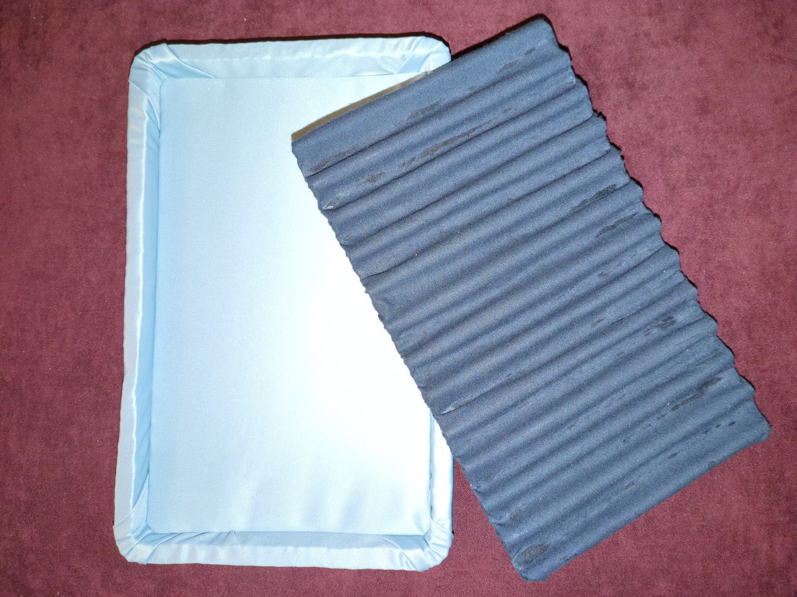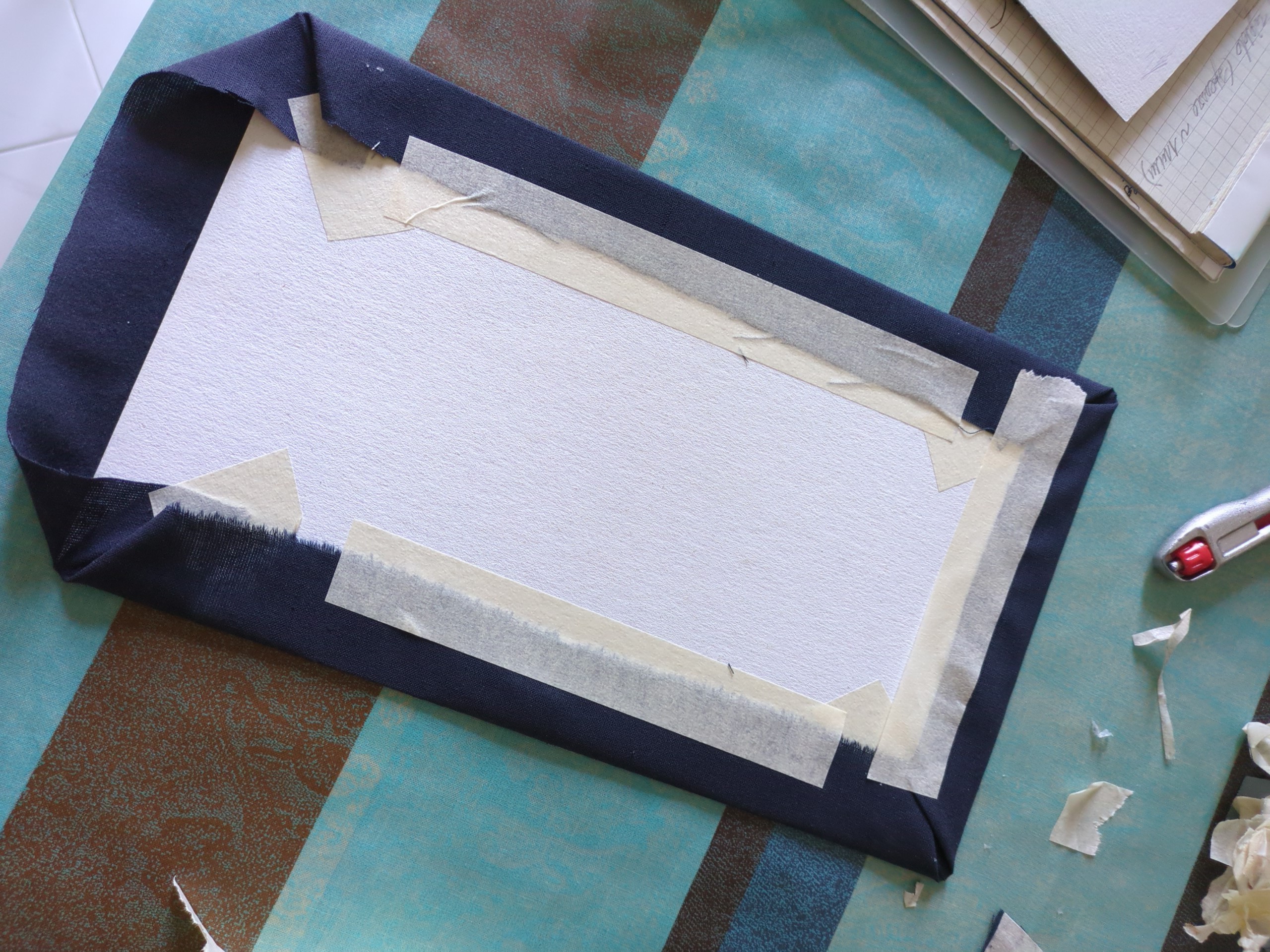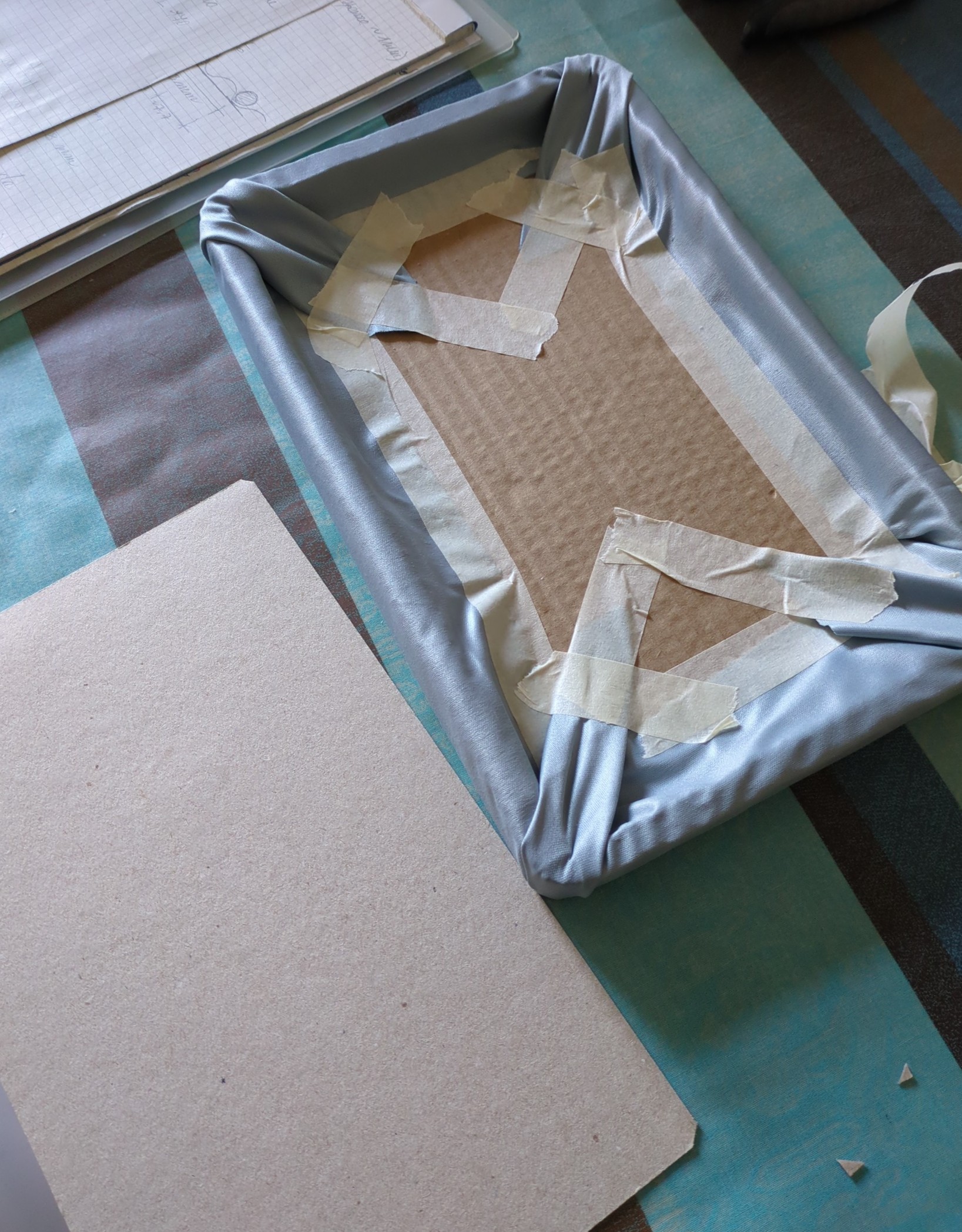 m) Tagliato un rettangolo di tessuto di circa 390x500mm, utilizzando del nastro carta e della colla vinilica, lo si usa per rivestire la parte inferiore e i bordi del vassoio.