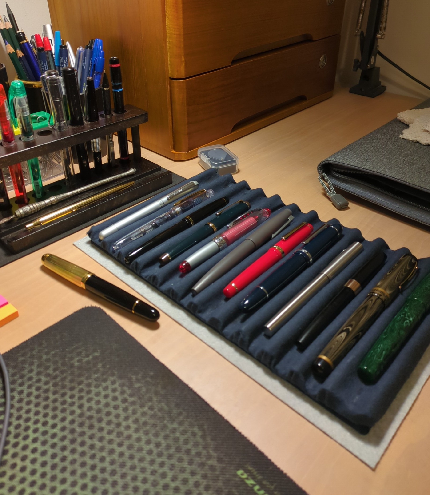 Ottima idea, complimenti. Io ne ho fatto un paio molto più semplici da realizzare, e sicuramente anche meno divertenti da fare. Una scatola di legno con un tappetino in gomma per le penne cariche, e una cassettiera cinese con lo stesso tappetino per le penne a riposo. Qualcuno riconoscerà il portapenne sopra la cassettiera, quello non è opera mia