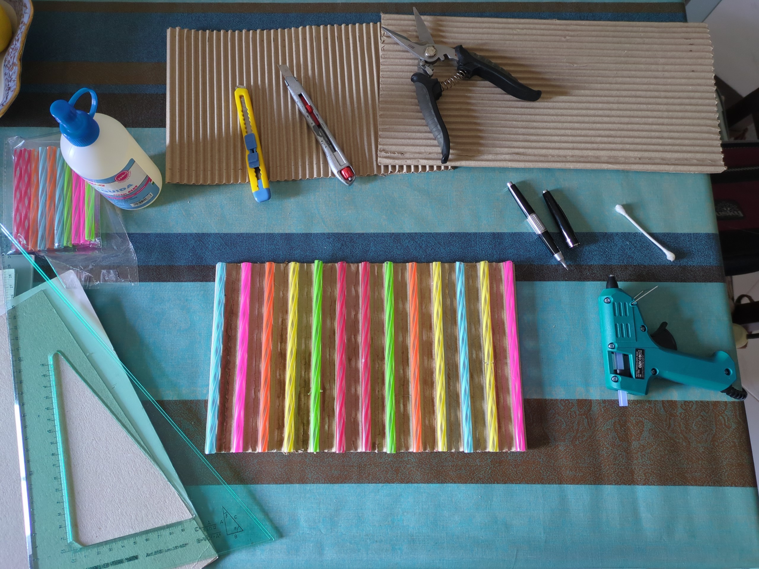 d) Si tagliano 13 cannucce, in modo che risultino tutte di 170mm di lunghezza e, con la colla a caldo, le si incolla negli "incavi" 1°, 4°, 7° ecc. del cartoncino ondulato (2) (sono sufficienti pochi punti di colla per ciascuna cannuccia).