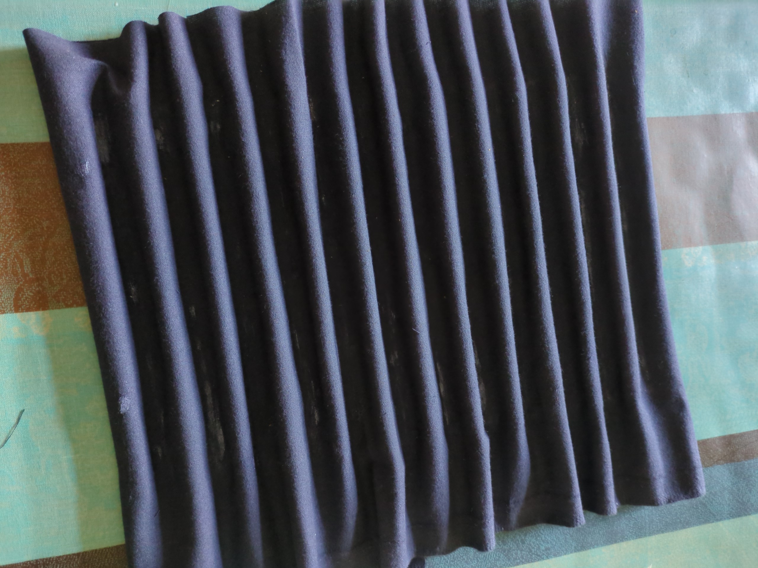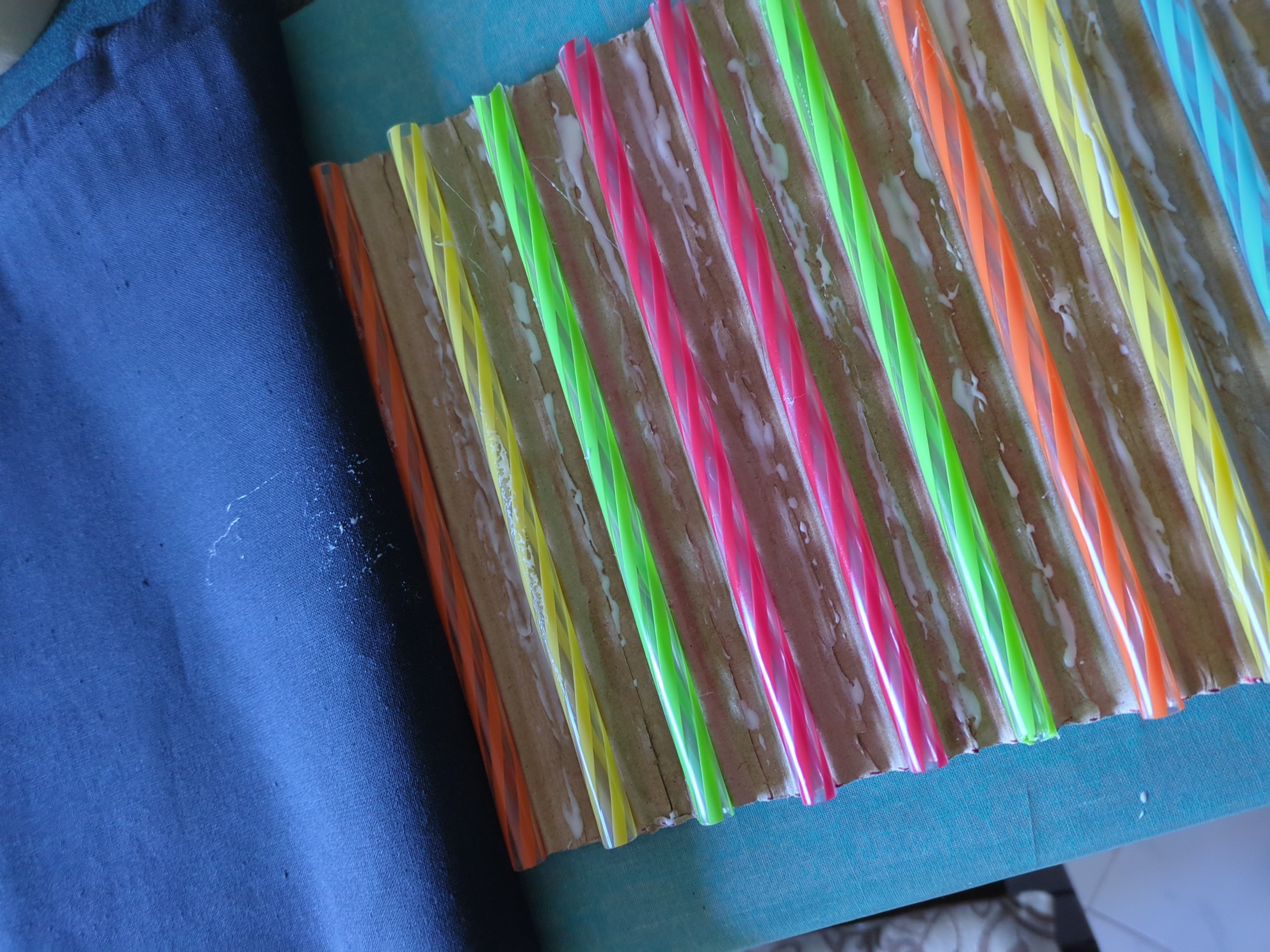 e) Tagliato un rettangolo di tessuto di circa 250x500mm e, dopo aver posato una minima quantità di colla vinilica negli "incavi" del cartoncino ondulato (2), si procede a ricoprirlo con il tessuto, seguendone l'ondulazione.