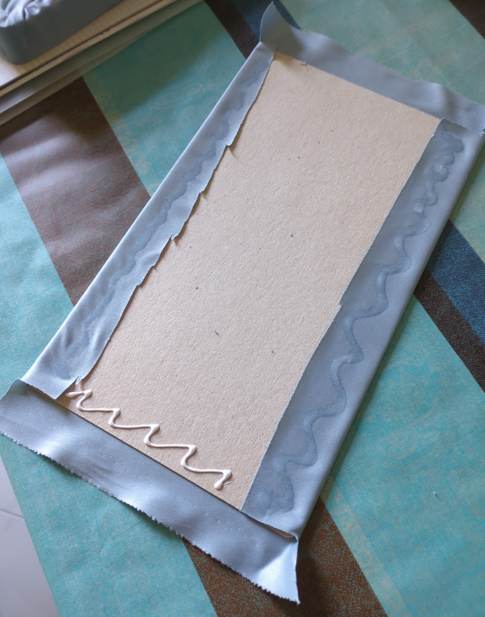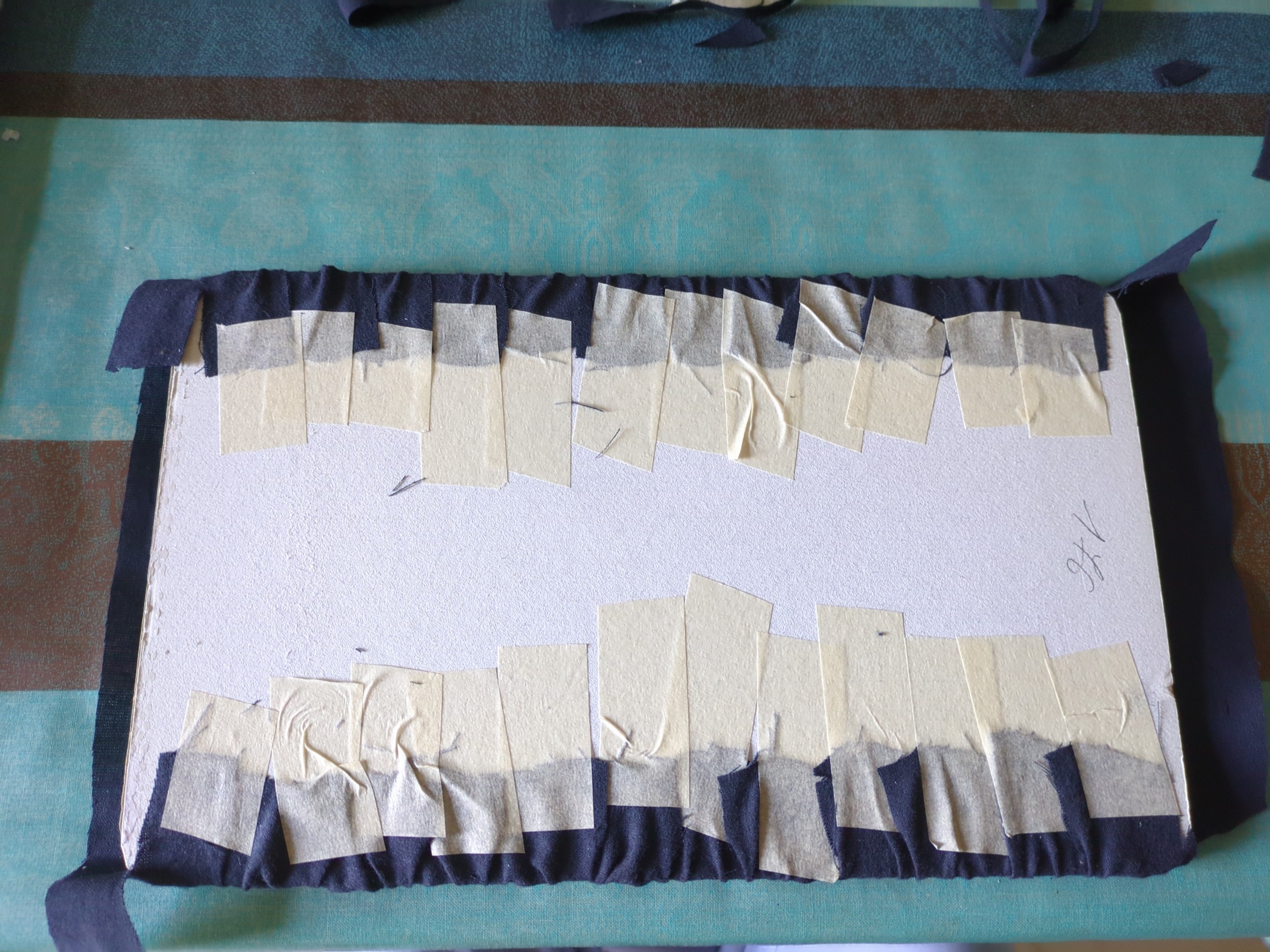 g) Tagliato un rettangolo di tessuto di circa 240x350mm, utilizzando del nastro carta e della colla vinilica, lo si usa per riverstire il cartoncino (1B), ottenendo la parte inferiore del portapenne.