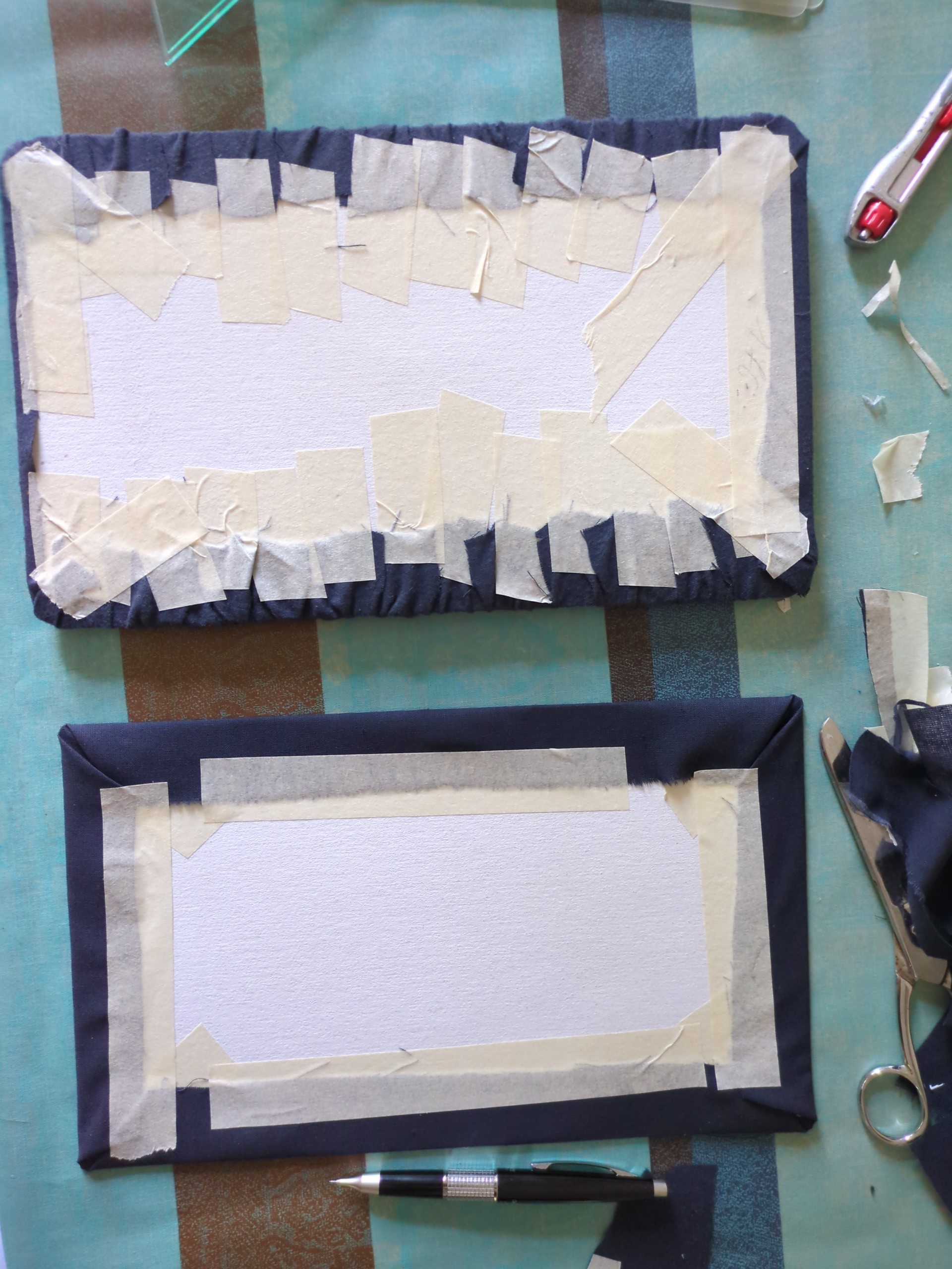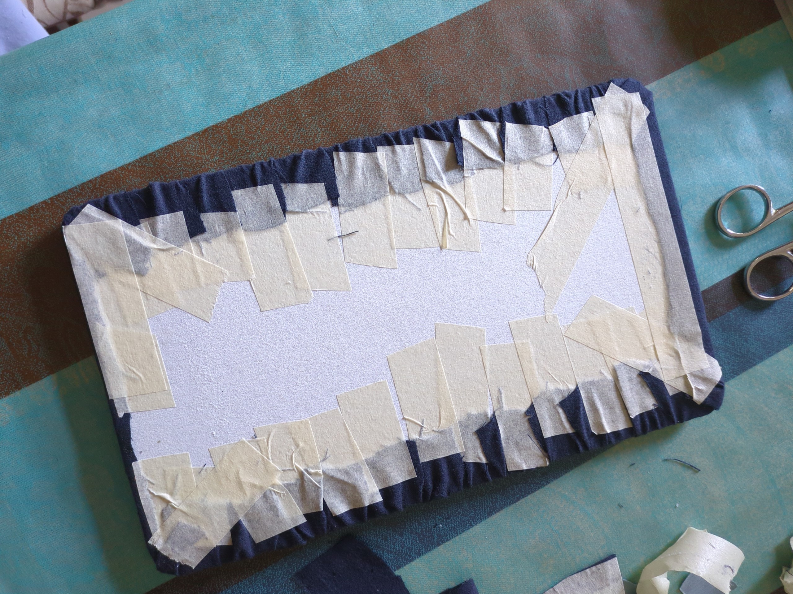 f) Si procede quindi a bloccare il tessuto sul fondo, utilizzando del nastro carta e della colla vinilica, ottenendo la parte superiore del portapenne.