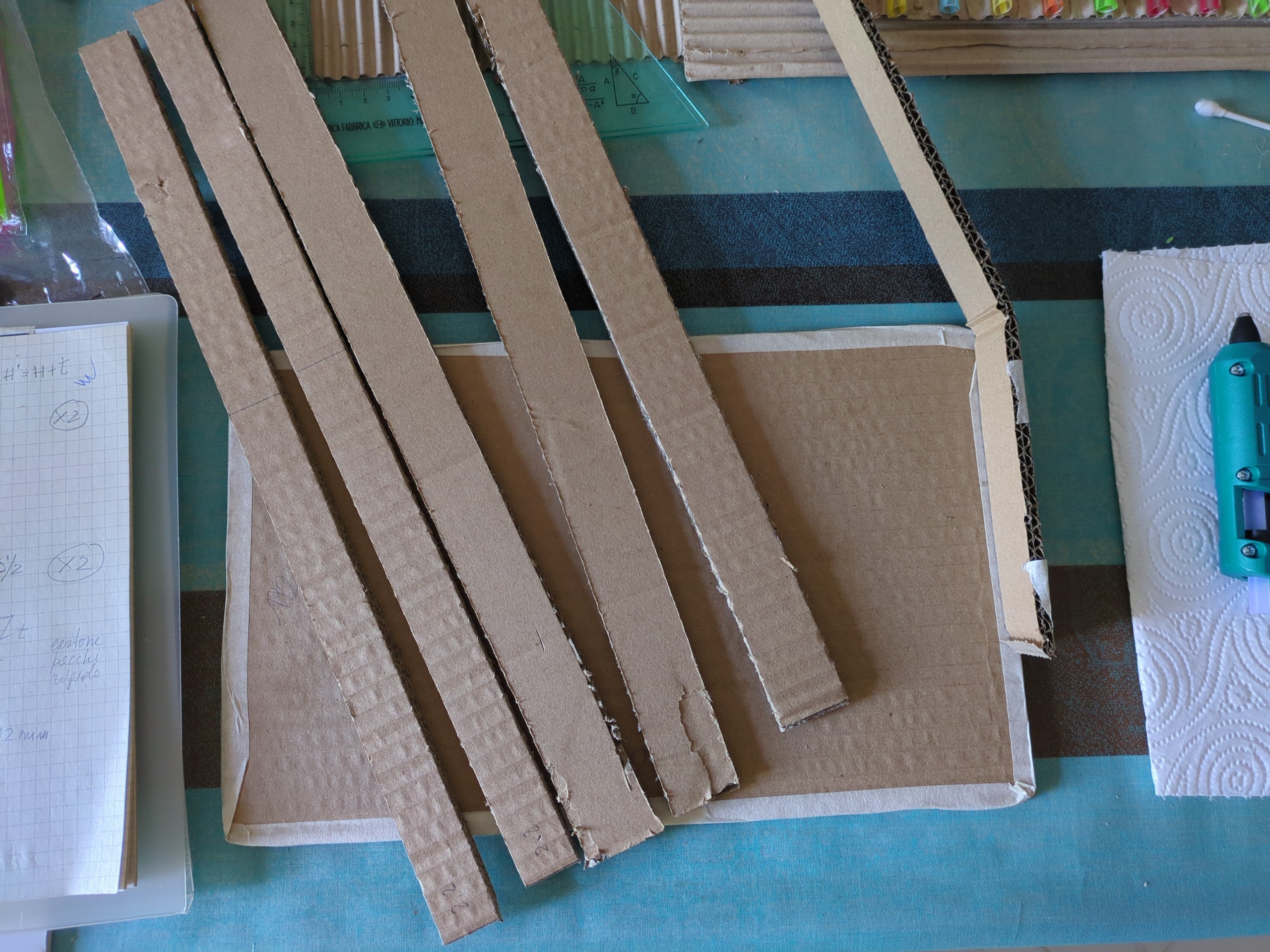 e) Tagliato un rettangolo di tessuto di circa 250x500mm e, dopo aver posato una minima quantità di colla vinilica negli "incavi" del cartoncino ondulato (2), si procede a ricoprirlo con il tessuto, seguendone l'ondulazione.