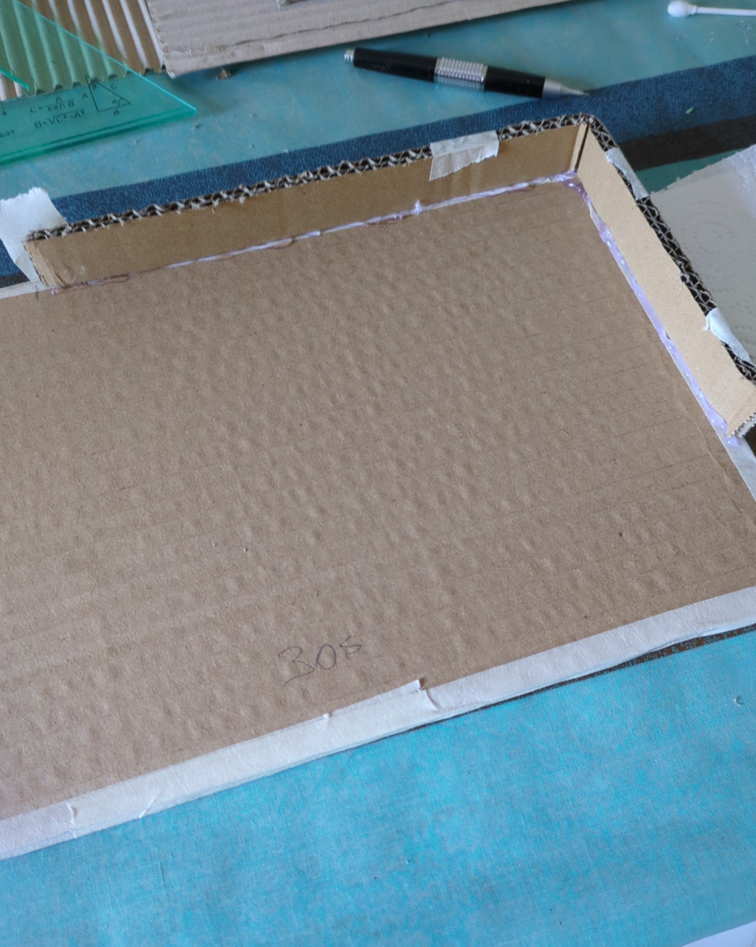 g) Tagliato un rettangolo di tessuto di circa 240x350mm, utilizzando del nastro carta e della colla vinilica, lo si usa per riverstire il cartoncino (1B), ottenendo la parte inferiore del portapenne.