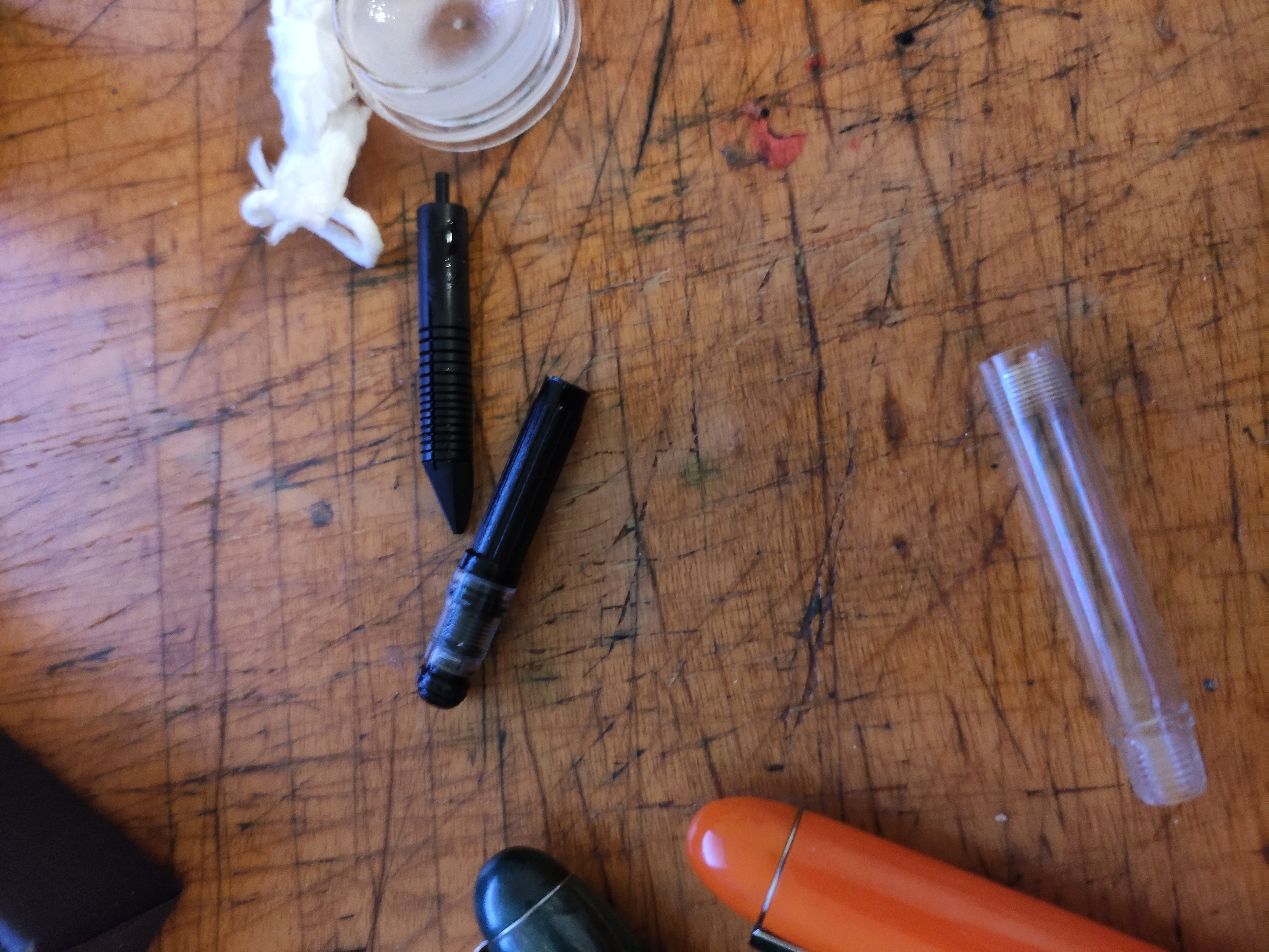 La Kanwrite desire è una penna che è multifunzione e si può usare con cartuccia, convertitore (incluso nel pacchetto) oppure eyedropper siccome ha un anello di gomma nella sezione. Il convertitore arriva impastato dentro del grasso denso che lo fa scorrere male però per fortuna lo si può disassemblare e pulire e grassare con qualcosa di meglio. Ecco la foto. Il convertitore è più capiente della media, kanwrite dichiara .8ml che è un pelino superiore comparato a convertitori standard, ma io non sono riuscito a fare un riempimento completo quindi la maggiore capienza è solo teorica.